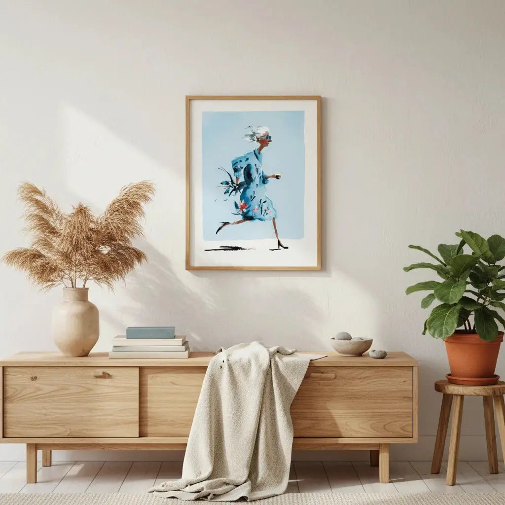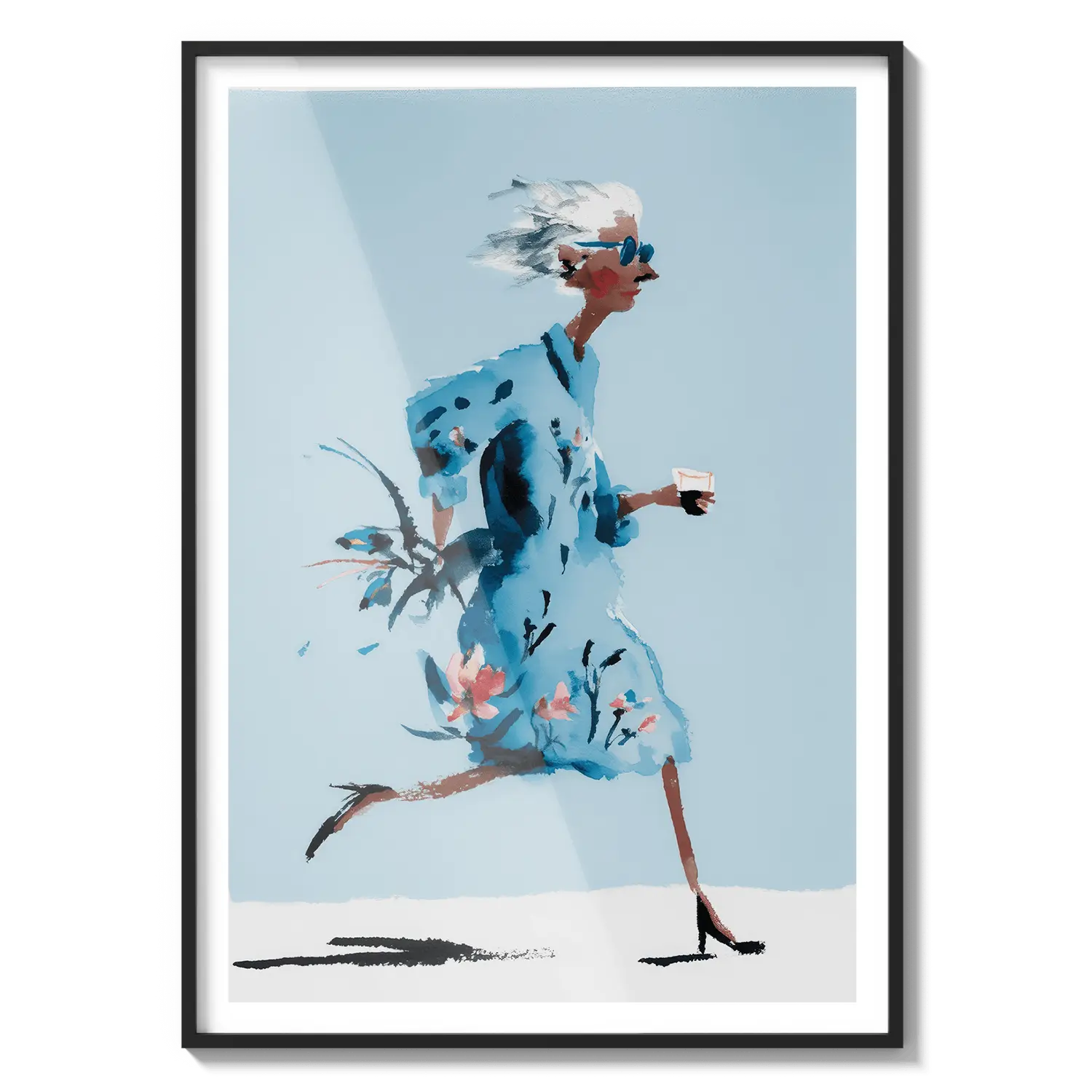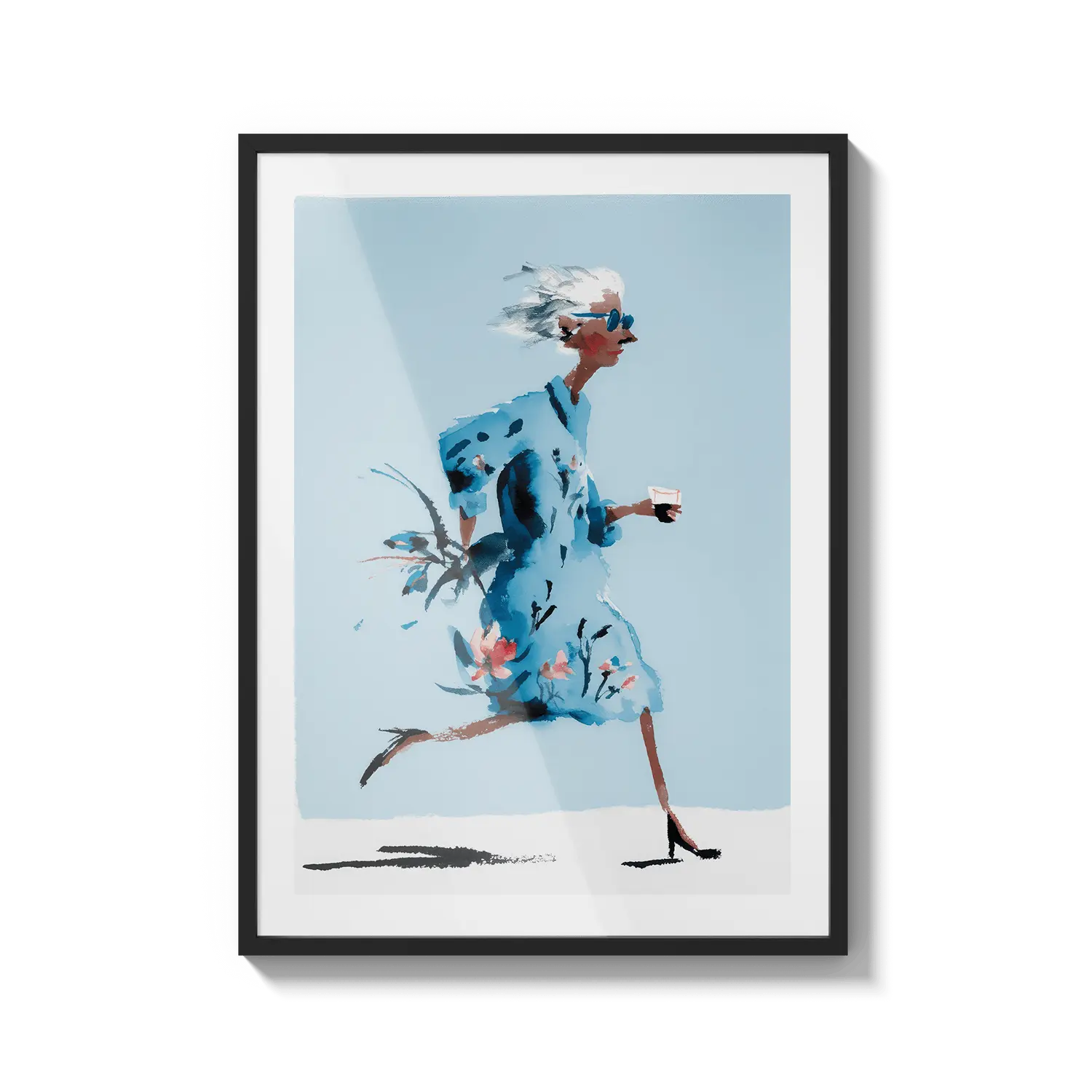 Una suave ilustración de una mujer caminando a través de suaves tonos azules, evocando libertad y una tranquila confianza. Una obra de arte reflexiva para ofrecer a alguien que aprecia los momentos de calma.