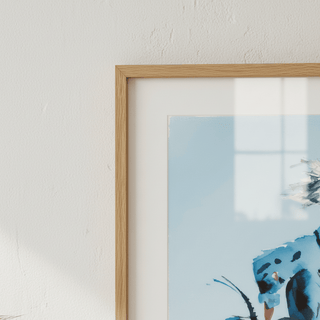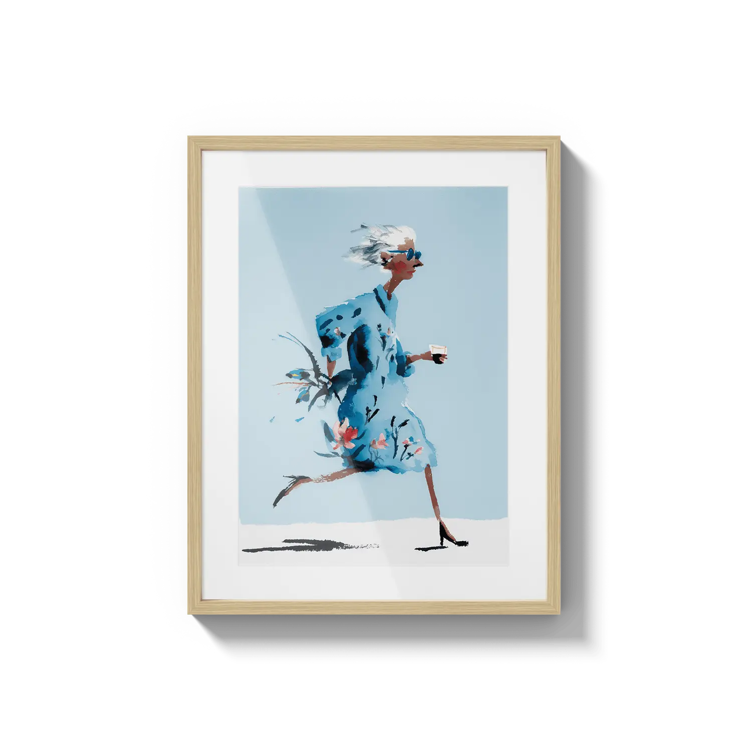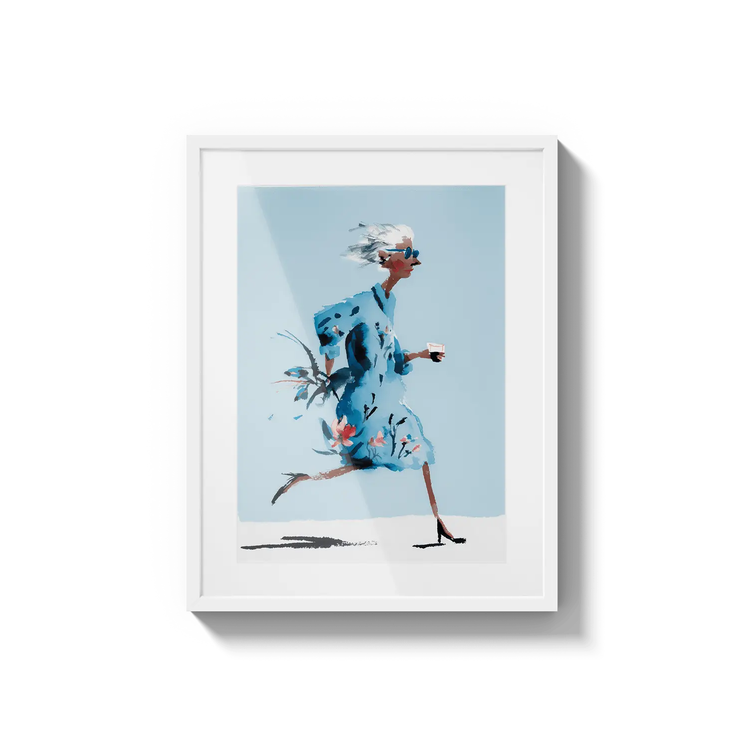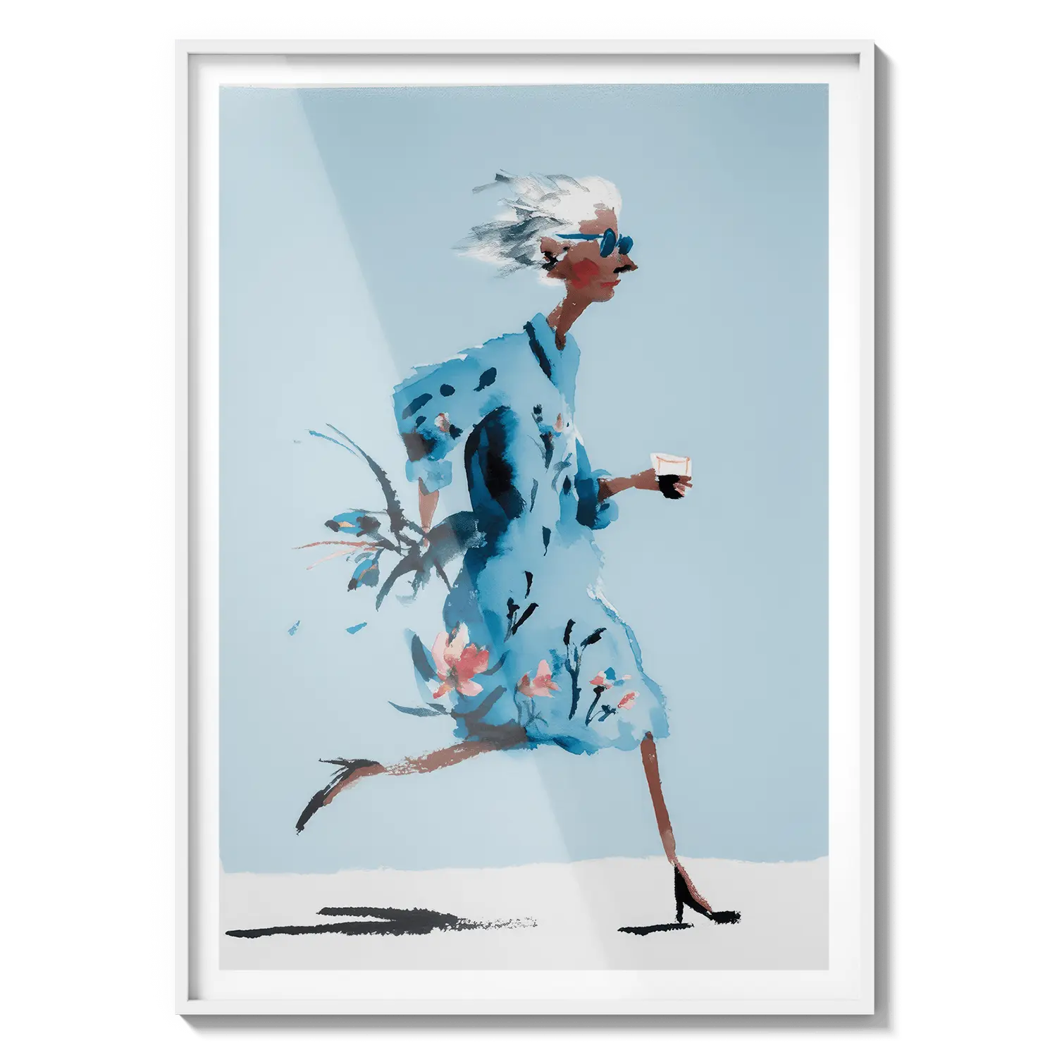 Una suave ilustración de una mujer caminando a través de suaves tonos azules, evocando libertad y una tranquila confianza. Una obra de arte reflexiva para ofrecer a alguien que aprecia los momentos de calma.