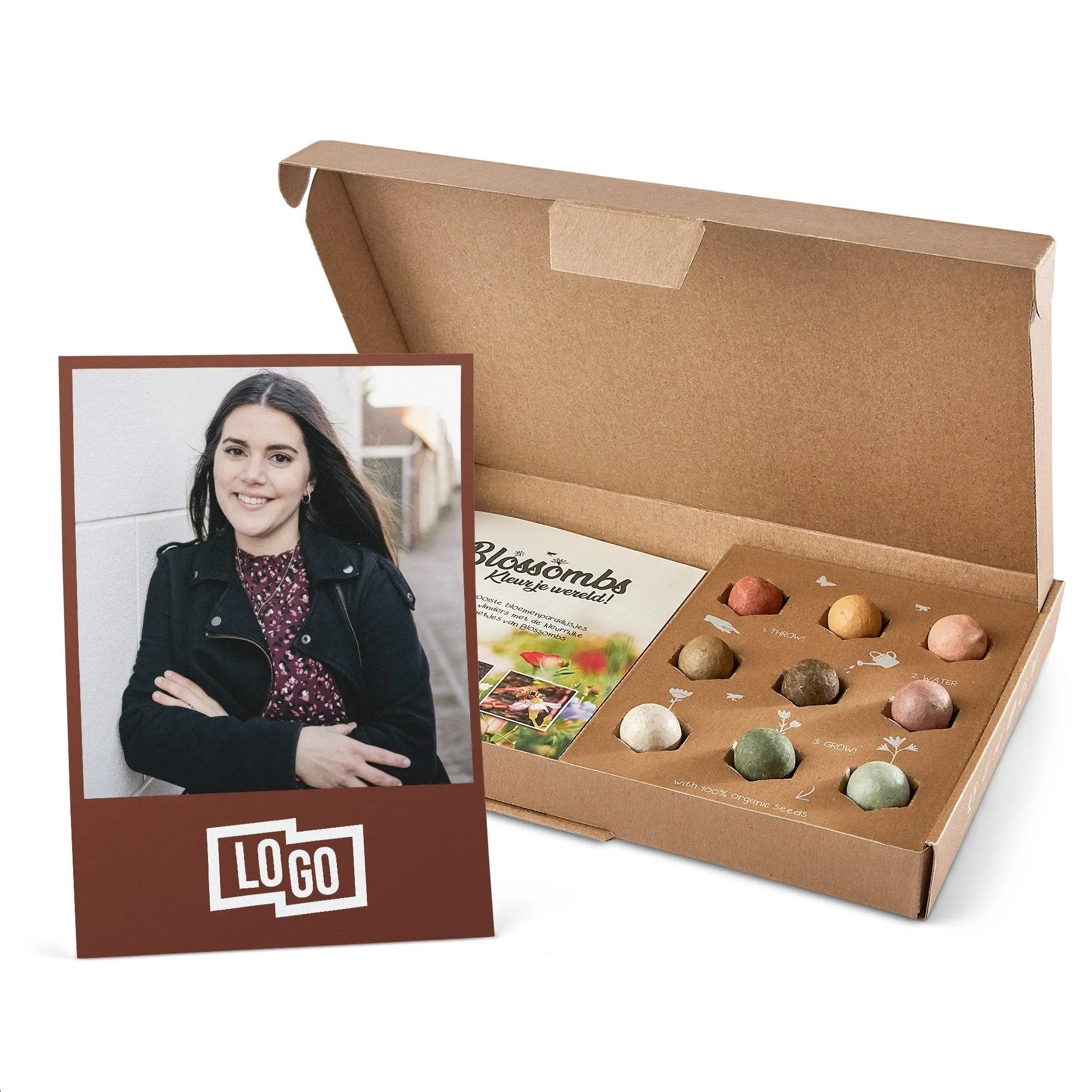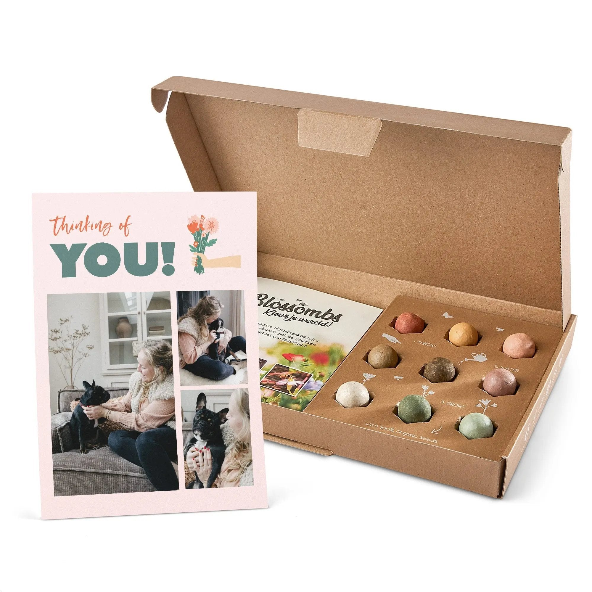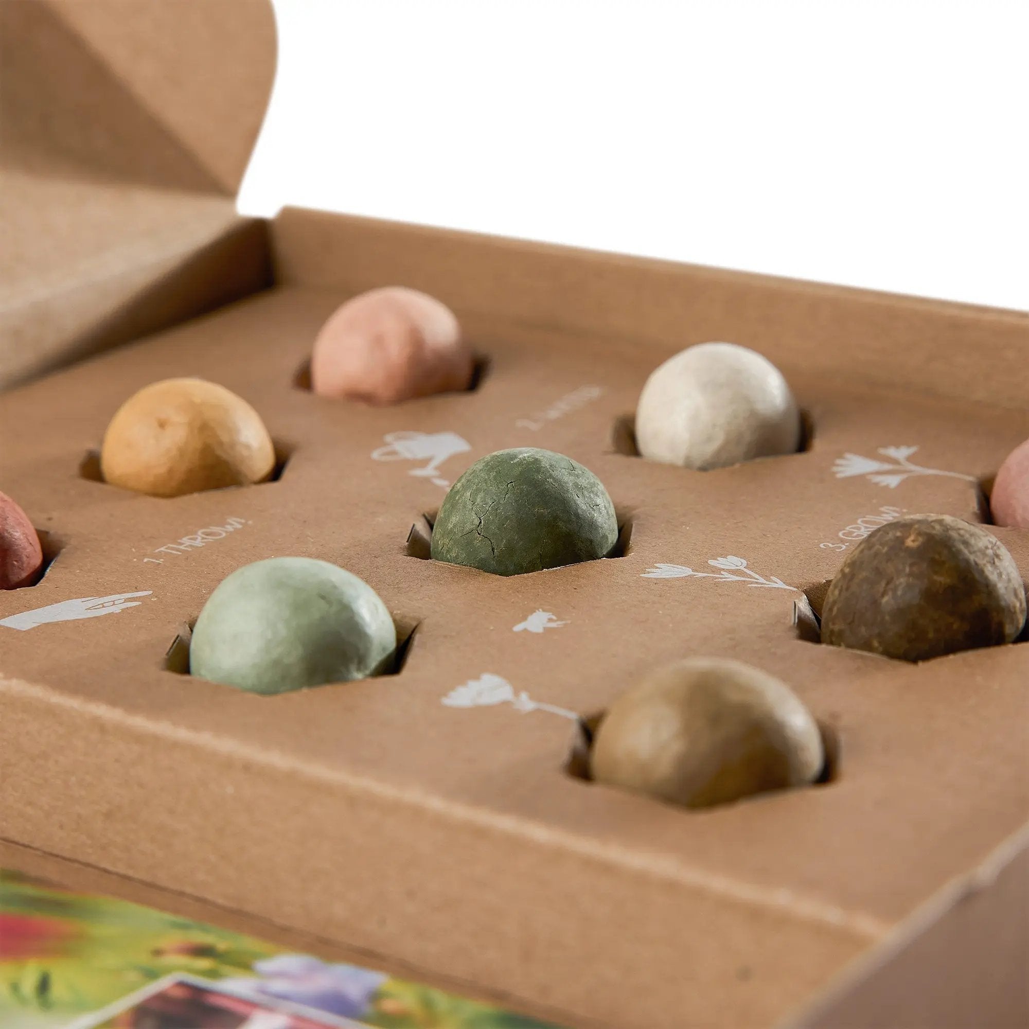 Experiencia Completa: 9 bombas de semillas de flores silvestres con ingredientes 100% orgánicos, tarjeta postal personalizada con acabado mate de lujo y sobre blanco.