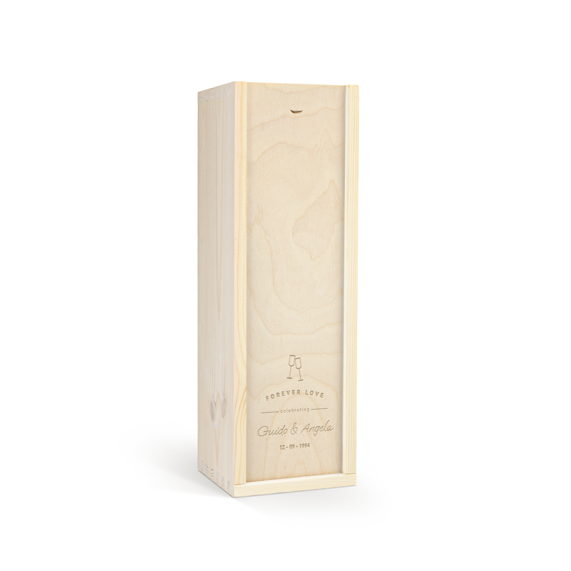 Más información sobre la caja de vino. Dimensiones de la caja: 36.5 x 12 x 11 cm. Dimensiones de la tapa: 35.6 x 10.2 cm Material: madera de pino Apto para una botella estándar de 75 cl.Personalización: con nombre o texto, en la tapa de la caja de maderaExtra: caja de madera con certificación FSC A tener en cuenta: la caja de vino se entrega vacía.La madera es un producto natural. Como resultado, tu regalo puede diferir ligeramente de las imágenes de ejemplo en el sitio web.
