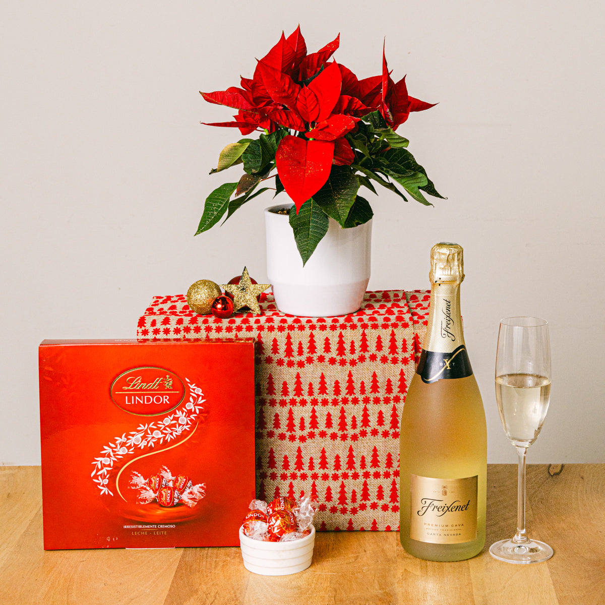 Celebra los nuevos comienzos con este regalo festivo que incluye una botella de vino espumoso, una caja de chocolates finos de leche y una impresionante planta de floración roja. Esta planta, famosa por sus hojas en forma de estrella, es el símbolo perfecto para dar la bienvenida al 2025 y seguirá prosperando mucho después de las celebraciones.