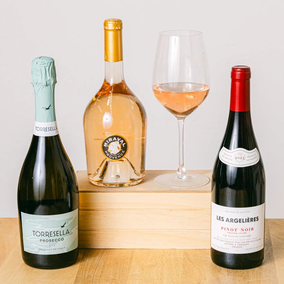 Regala los sabores únicos del buen vino con un set exquisito y la compleja melodía que crean en el paladar. Una increíble combinación para quienes quieren probarlo todo: desde los aromas a fruta fresca del vino rosado Miraval, hasta el recuerdo a fruta roja y los toques ahumados del vino tinto Les Argelières. Compara su permanencia en boca con el frescor y la acidez del vino blanco Montecillo, y termina la cata con el espumoso Torresella y sus increíbles notas aromáticas.