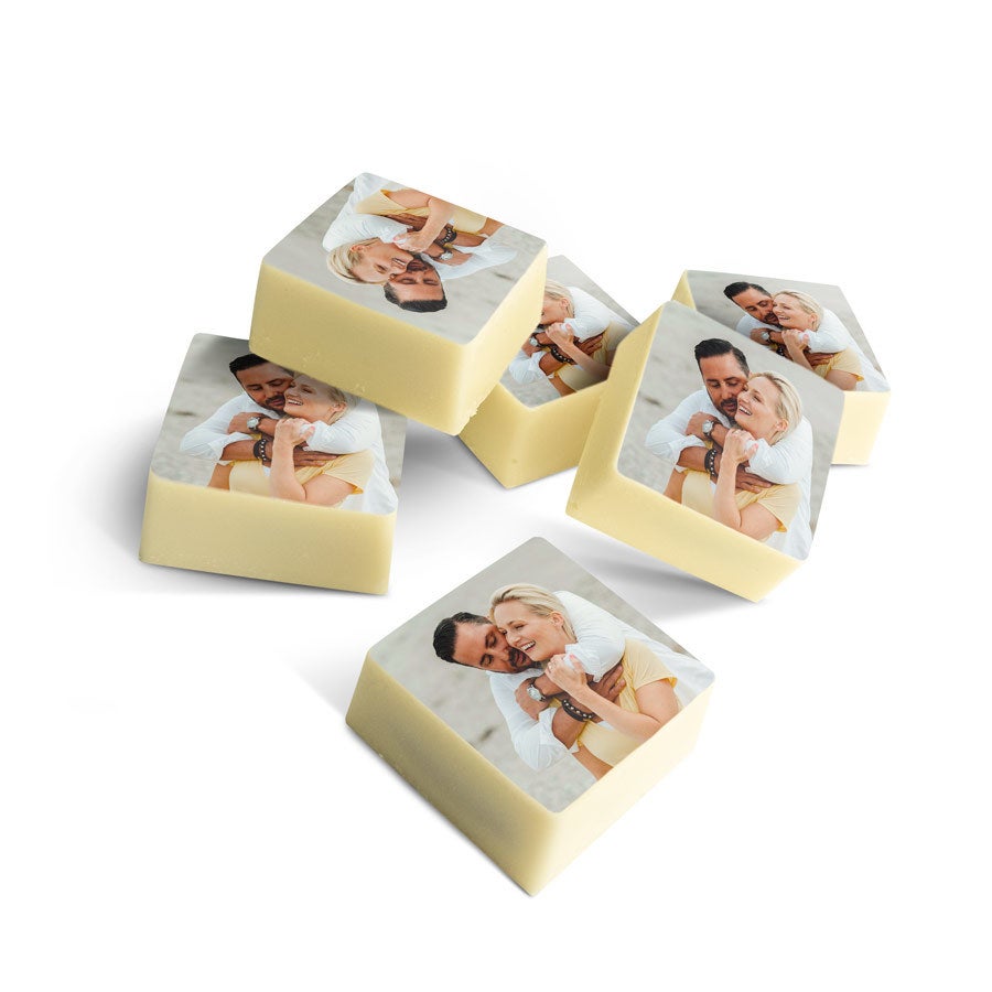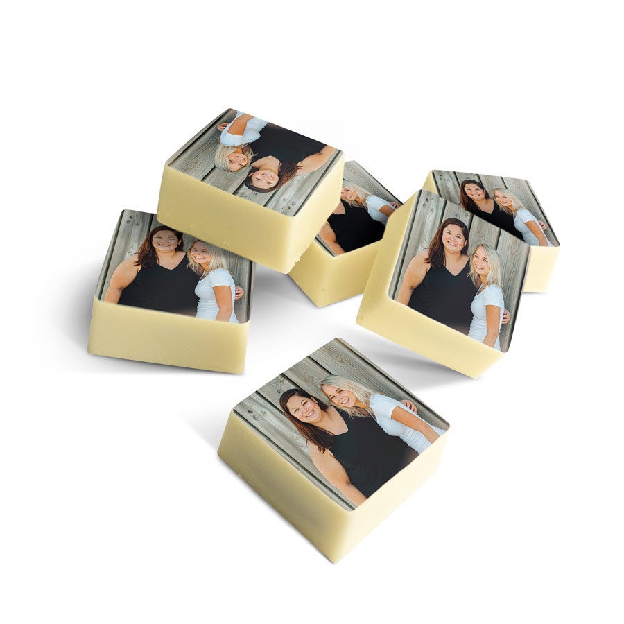 Más información sobre los bombones con foto:Cantidad: 12 bombonesChocolate: leche y chocolate con una capa de chocolate blancoForma: cuadradosTamaño del bombón: 2,6 x 2,6 x 1,2 cmPersonalización: impreso con foto o logoImpresión: comestible y a todo colorEn lugares donde las temperaturas alcance los 25ºC o más, no es posible garantizar las buenas condiciones del chocolate.Ingredientes: Bombones de chocolate con relleno de avellana e impresión comestible: azúcar, avellanas, masa de cacao, manteca de cacao, leche entera en polvo, emulgente (lecitina de soja), aroma natural de vainilla. Impresión comestible: almidón de maíz, almidón modificado: E1422, fécula de patata, agua, clara de huevo en polvo, leche desnatada en polvo, aceite de oliva, sal, humectante E422, emulsionante: E433, colorante: E102, E110, E122: puede afectar negativamente la actividad o la concentración en niños, E133, E151Recubrimiento: E904Consejos de almacenamiento: puedes almacenar los chocolates hasta 10 semanas en un lugar fresco y oscuro con una temperatura entre 14-18 ° C. Información sobre alérgenos: contiene soja, leche. Puede contener trazas de frutos secos y gluten. El tamaño de cada chocolate es de 2,6 x 2,6 cm. El tamaño puede variar un poco entre cada chocolate.