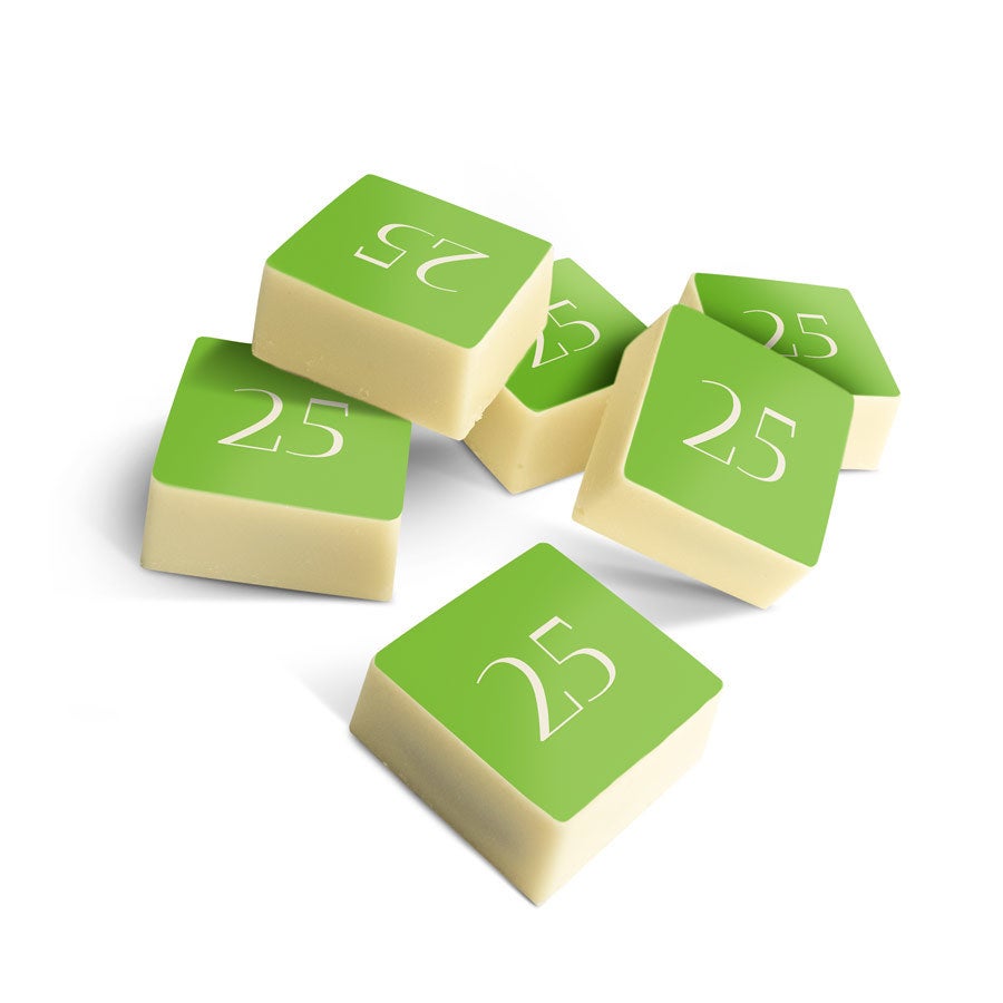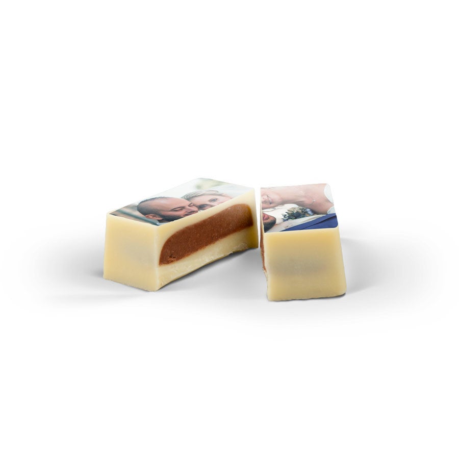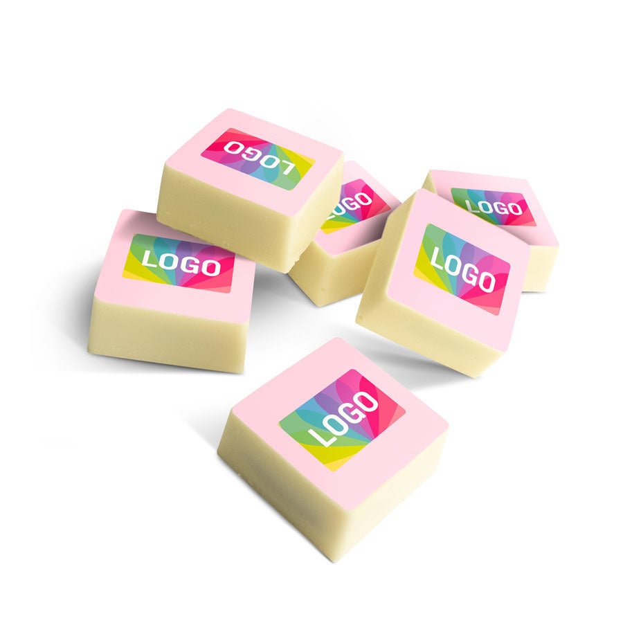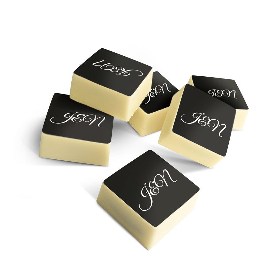 Set de 12 bombones de chocolate con leche, forma cuadrada, relleno de praliné y personalización comestible.