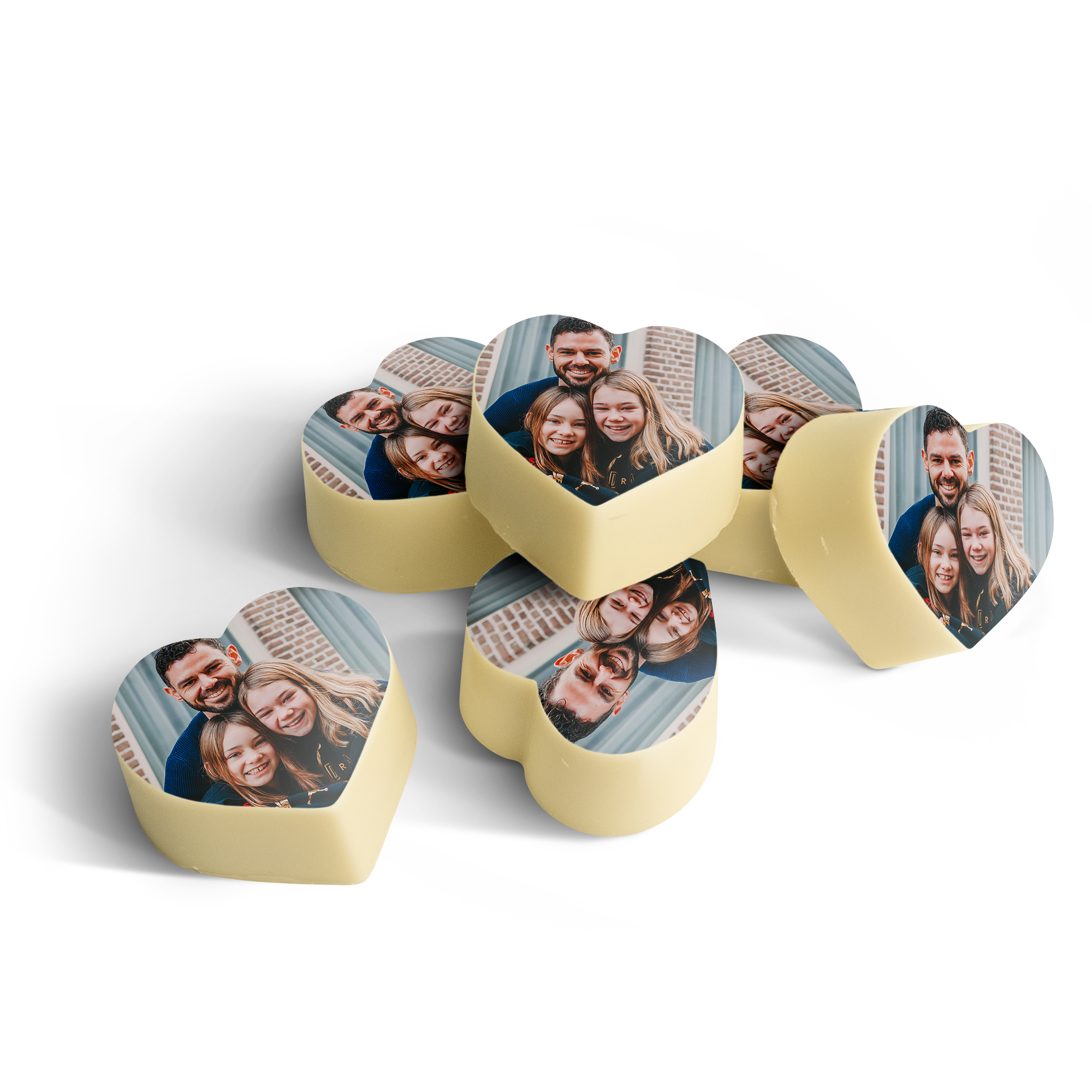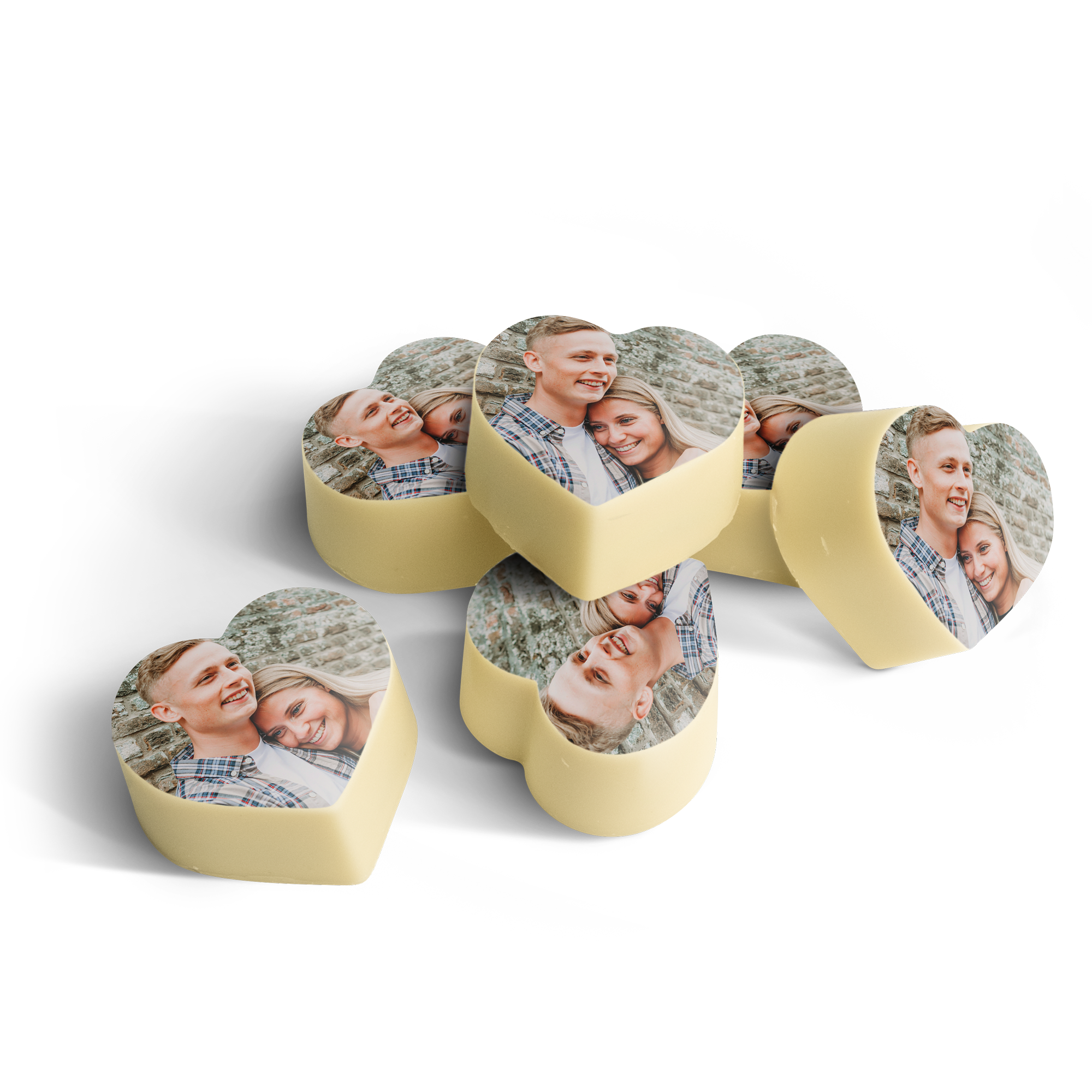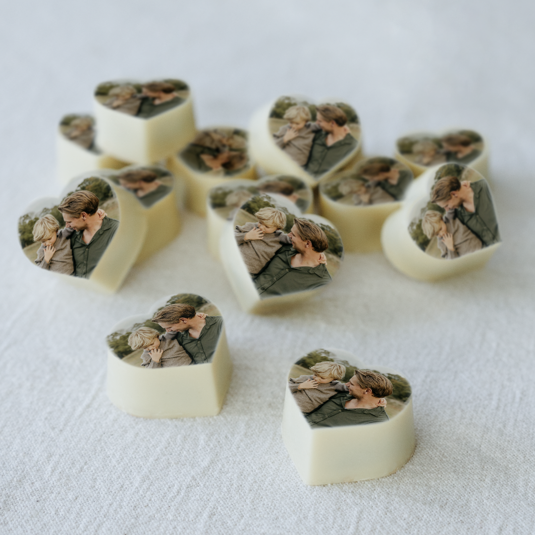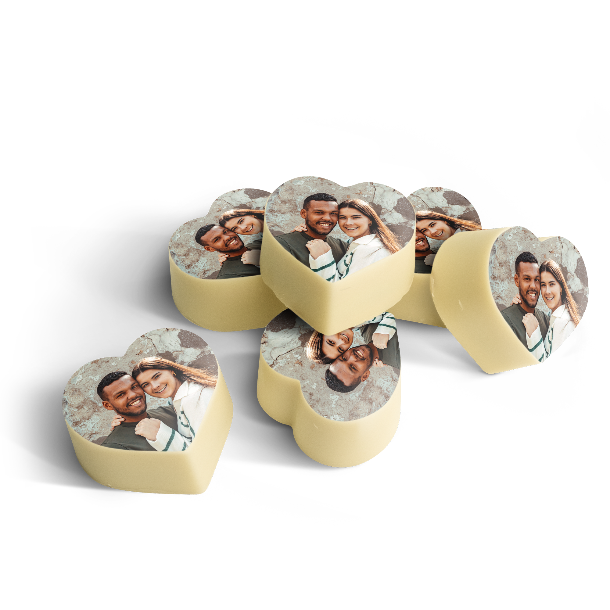 Experiencia Completa: 12 bombones de chocolate con leche en forma de corazón, listos para ser personalizados con una foto o logo especial.