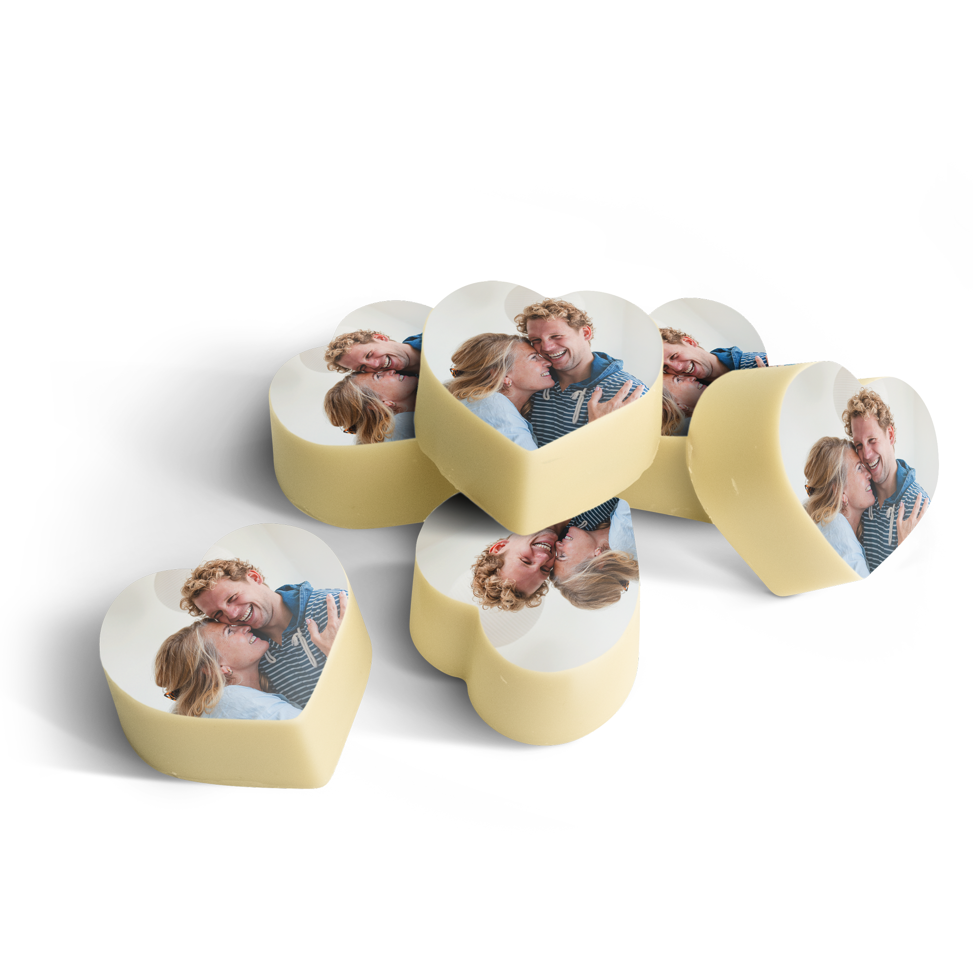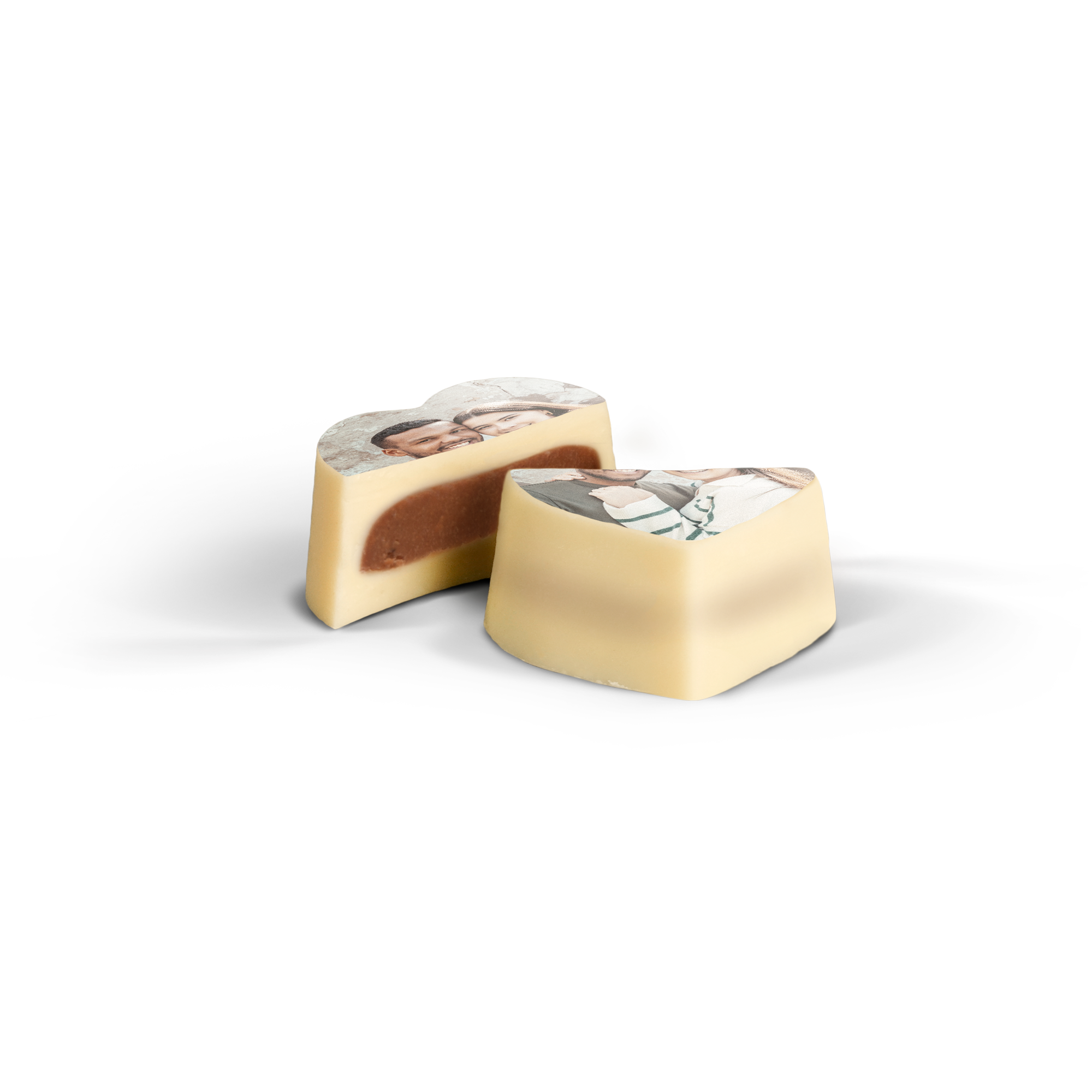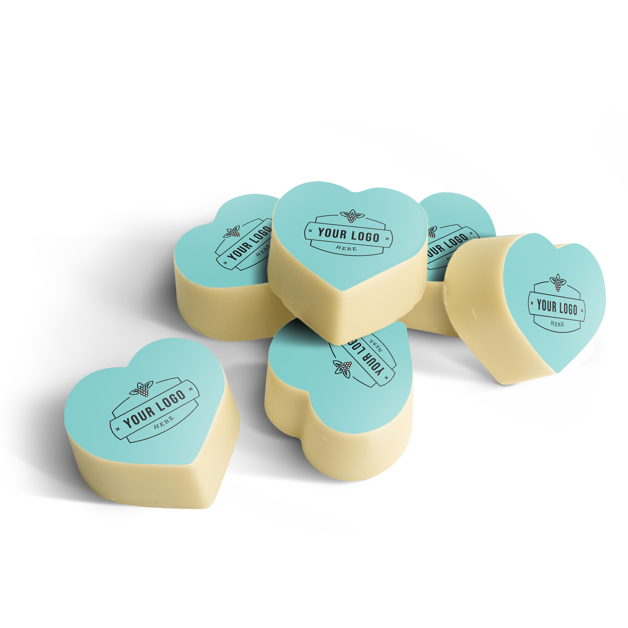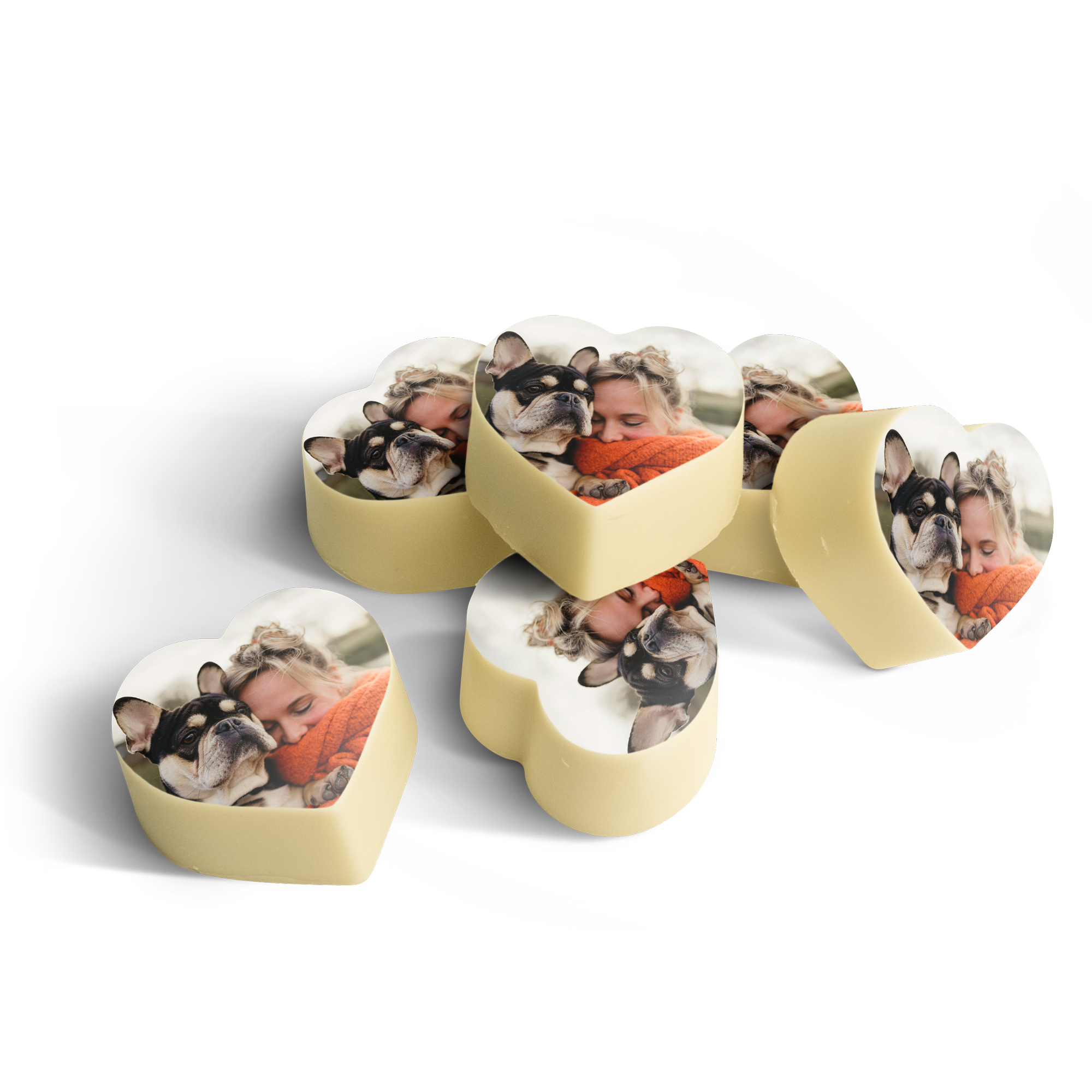 Experiencia Completa: 12 bombones de chocolate con leche en forma de corazón, listos para ser personalizados con una foto o logo especial.