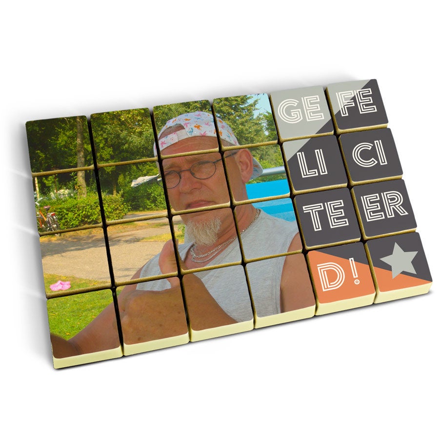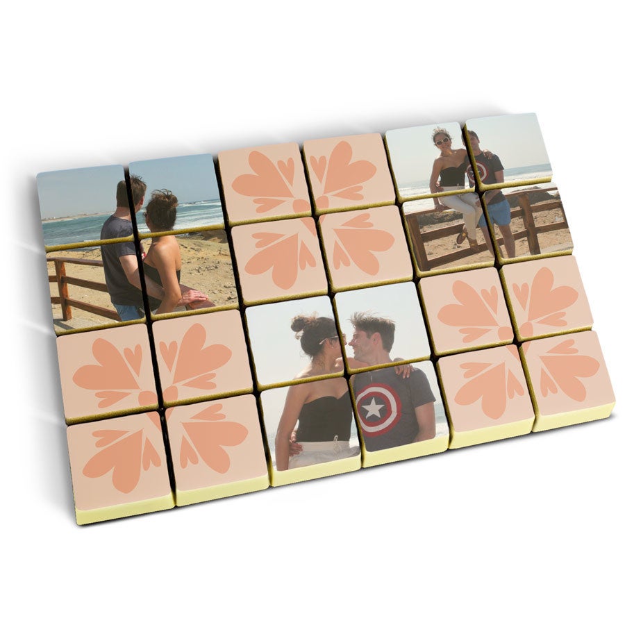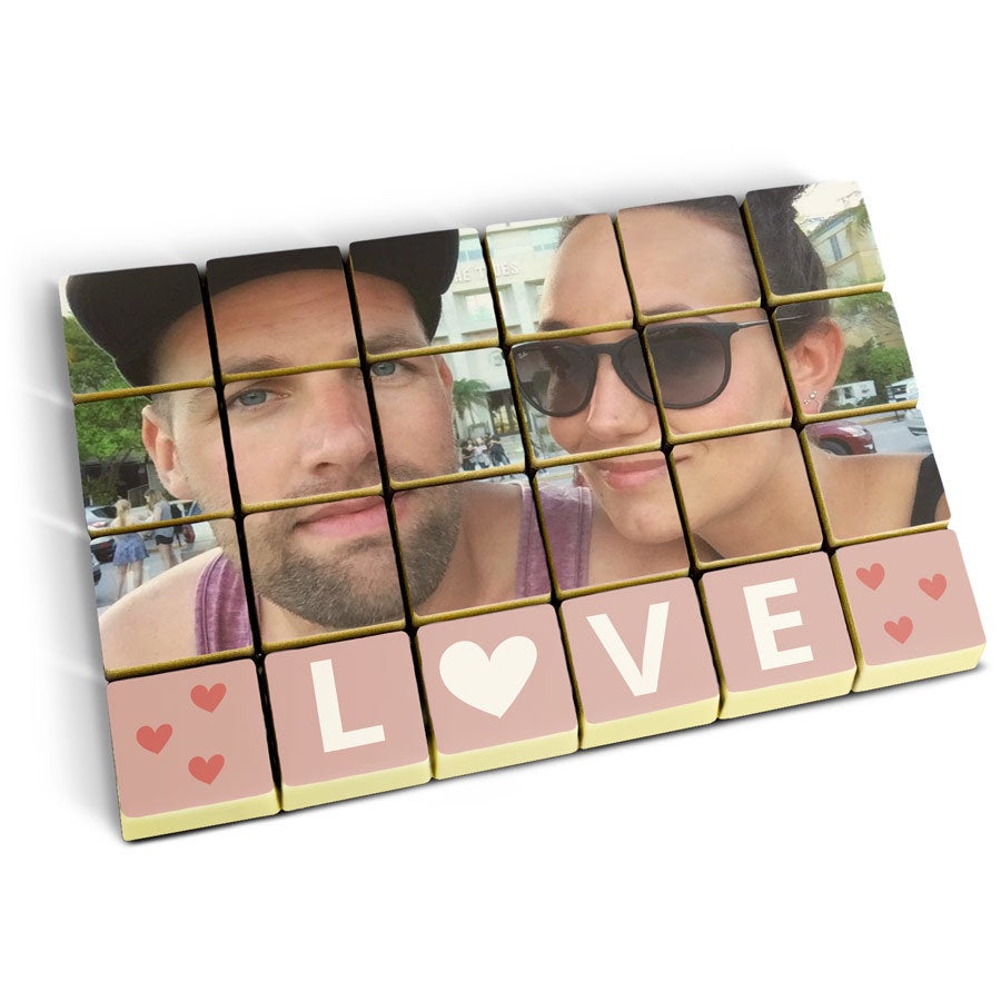 Más información sobre los chocolates sólidos personalizados:Cantidad: set de 24 chocolatesChocolate: leche y chocolate con una capa de chocolate blancoRelleno: pralinéPersonalización: impreso con foto o logoImpresión: comestible y a todo colorDimensiones por chocolate: 2,6 x 2,6 x 1,2 cmDimensiones de la foto: 16,5 x 11 cmEn lugares donde las temperaturas alcance los 25ºC o más, no es posible garantizar las buenas condiciones del chocolate.Ingredientes: Bombones de chocolate con relleno de avellana e impresión comestible: azúcar, avellanas, masa de cacao, manteca de cacao, leche entera en polvo, emulgente (lecitina de soja), aroma natural de vainilla. Impresión comestible: almidón de maíz, almidón modificado: E1422, fécula de patata, agua, clara de huevo en polvo, leche desnatada en polvo, aceite de oliva, sal, humectante E422, emulsionante: E433, colorante: E102, E110, E122: puede afectar negativamente la actividad o la concentración en niños, E133, E151Recubrimiento: E904Consejos de almacenamiento: Puede almacenar hasta 10 semanas en un lugar fresco y oscuro entre 14-18 ° C. Información sobre alérgenos: contiene soja, leche y puede contener trazas de frutos secos.