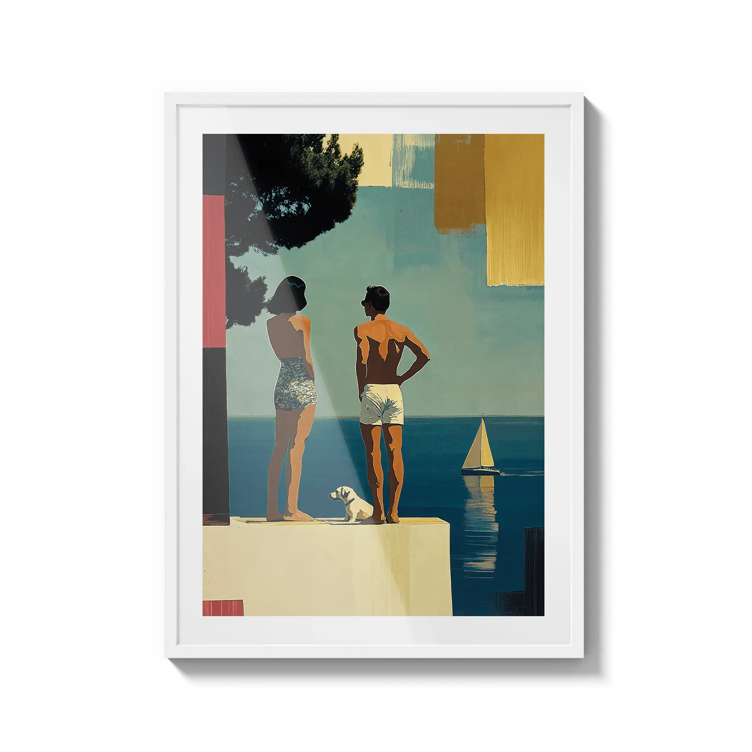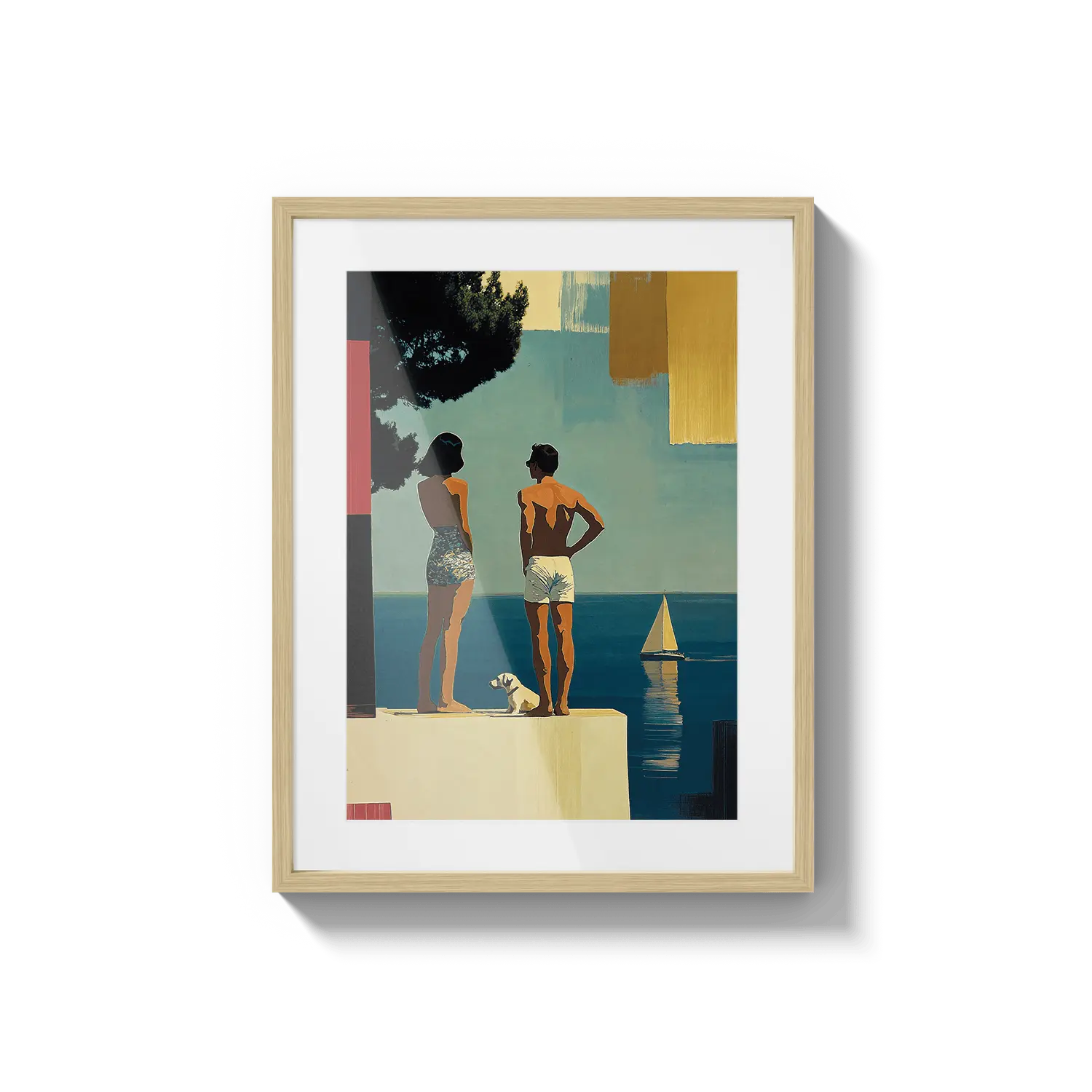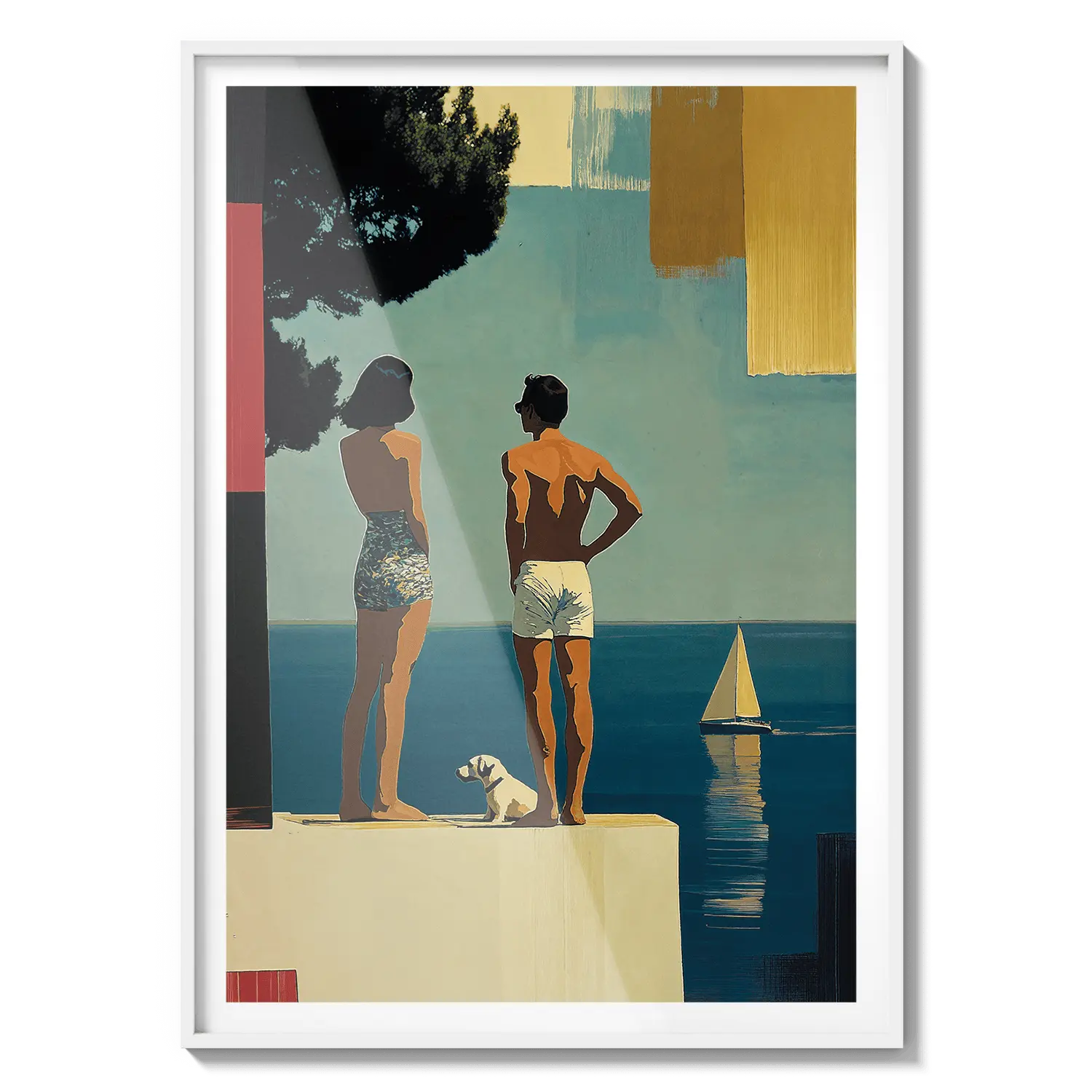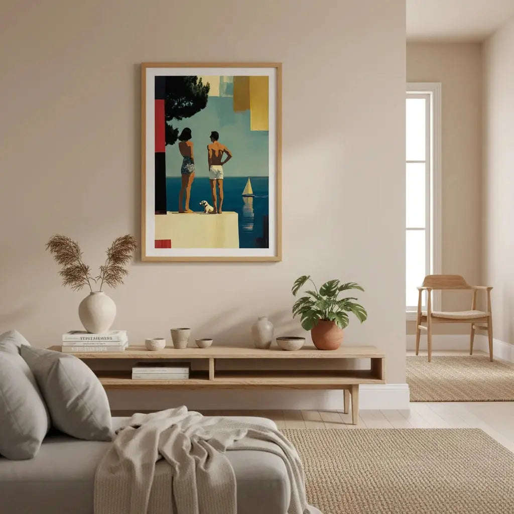 Una escena costera soleada con figuras de pie junto al mar bajo una luz cálida. Una suave invitación a detenerse y respirar.