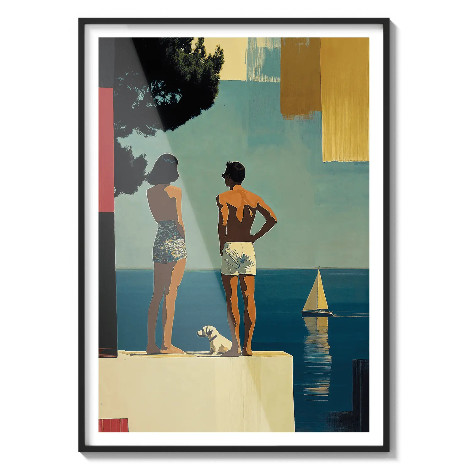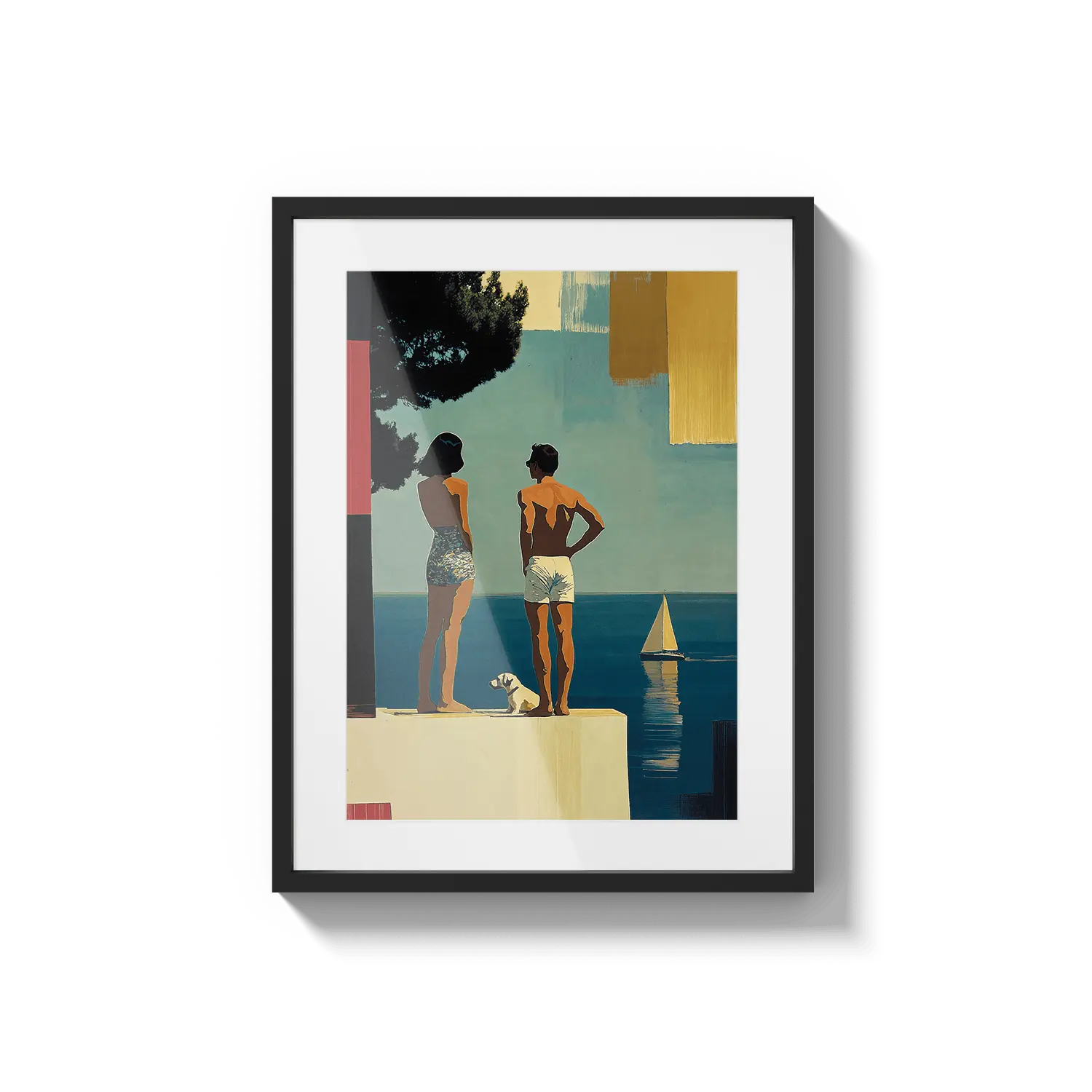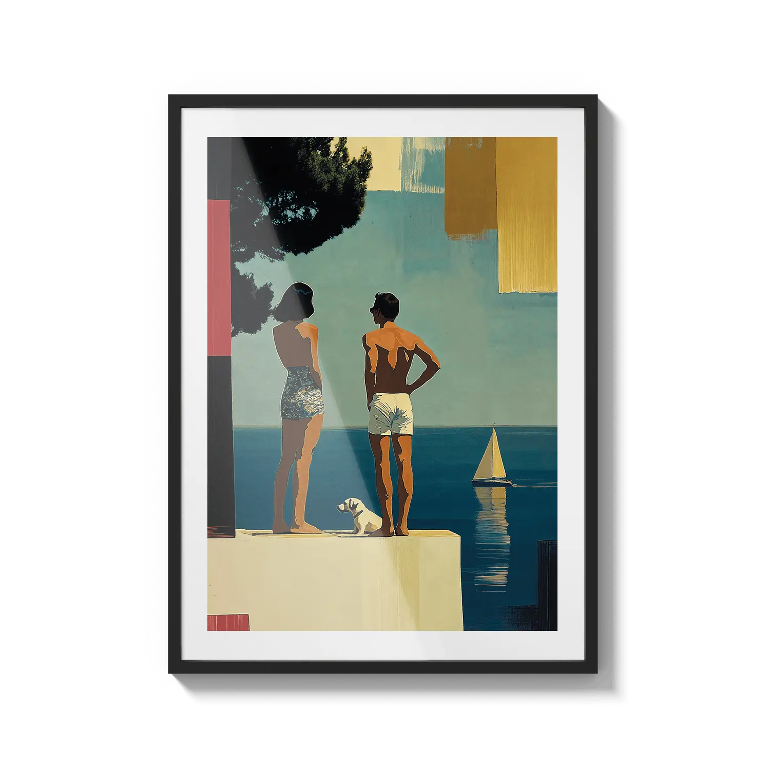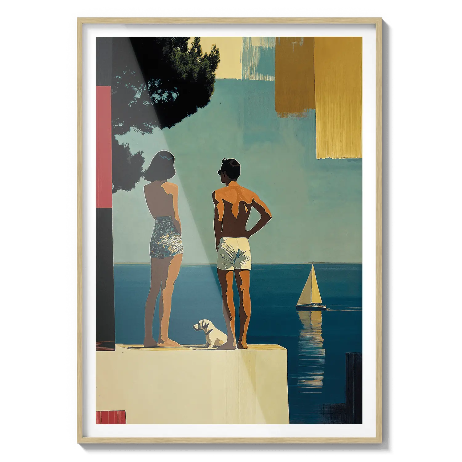 Una escena costera soleada con figuras de pie junto al mar bajo una luz cálida. Una suave invitación a detenerse y respirar.