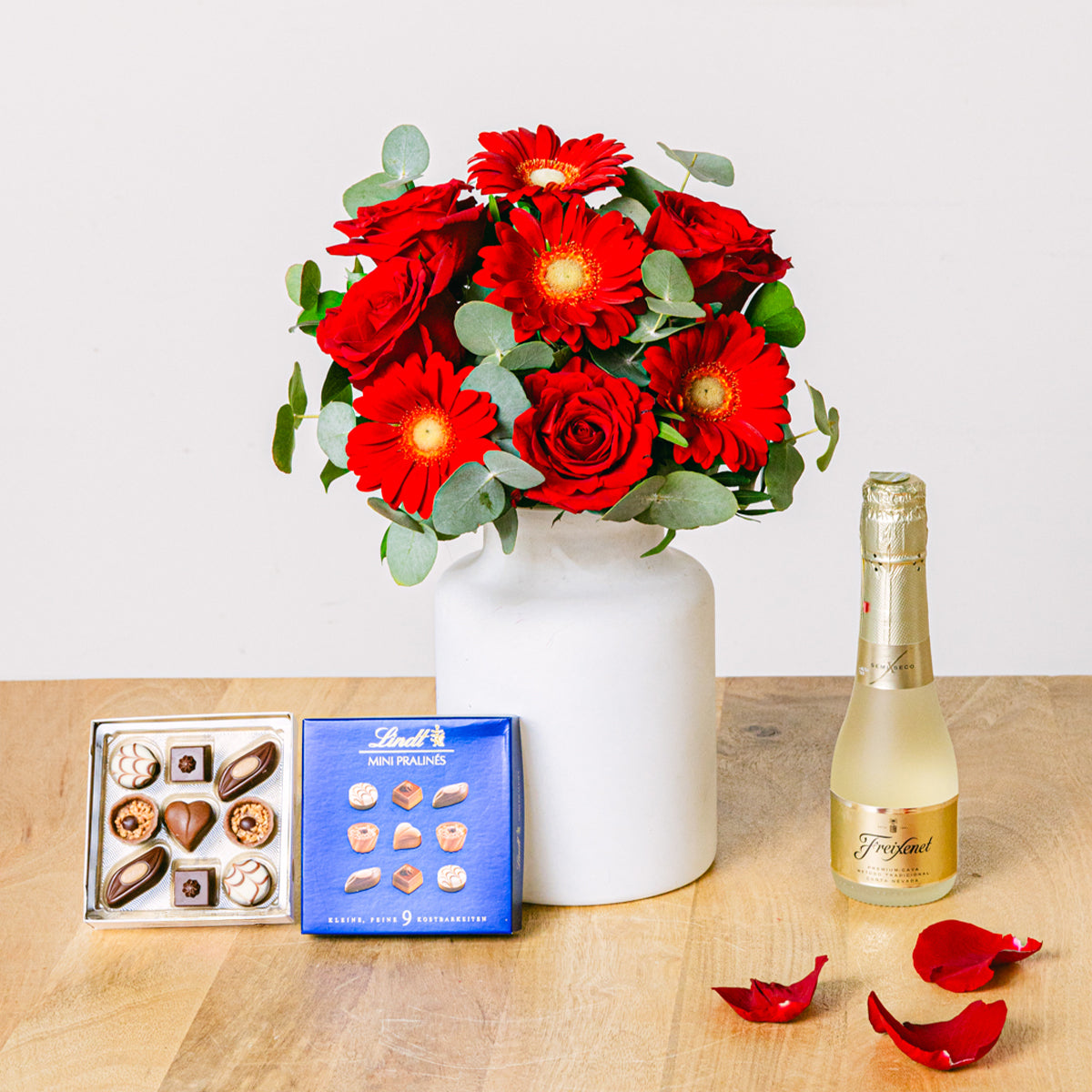 Junto al arreglo floral hay una botella de cava Freixenet de primera calidad. Conocido por su calidad distintiva, este vino espumoso ofrece un sabor fresco y refrescante, lo que lo hace ideal para celebraciones grandes y pequeñas. Combinado con una copa, proporciona momentos de alegría y festividad compartida. Añadiendo un toque de indulgencia, el set de regalo incluye una selección de Mini Pralinés Lindt. Estos chocolates gourmet, elaborados por maestros chocolateros, presentan una variedad de deliciosos sabores y texturas, con cada bocado ofreciendo un sabor de lujo. Este conjunto completo está cuidadosamente curado para aportar alegría y sofisticación a cumpleaños, aniversarios o cualquier momento especial que valga la pena celebrar. Comparte este regalo de alta calidad con tus seres queridos y crea recuerdos inolvidables.
