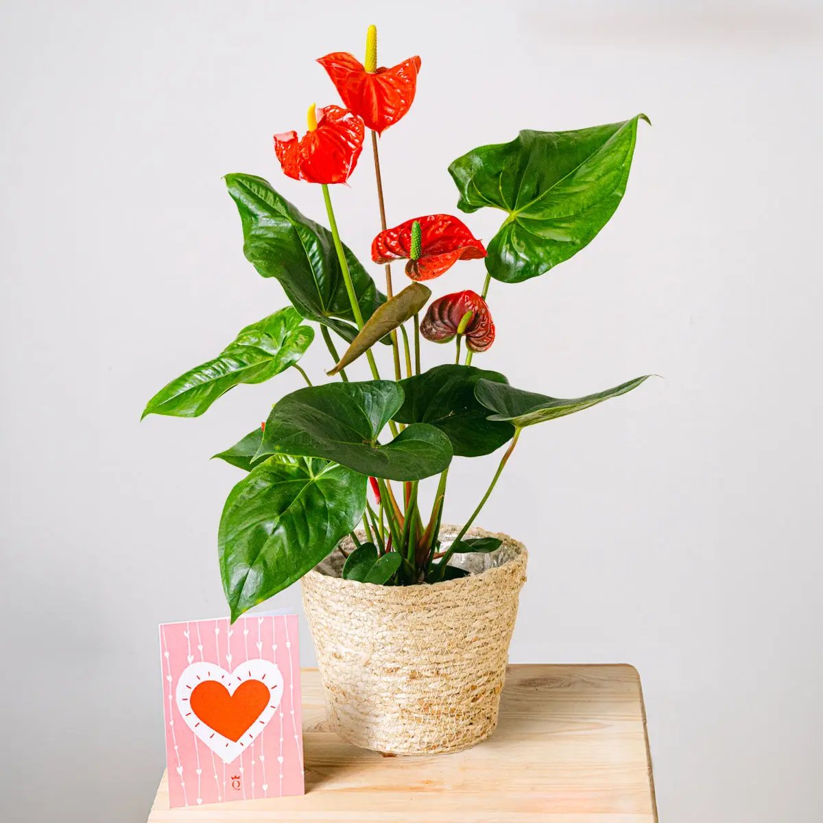 El anturio rojo destaca por su floración duradera y su capacidad para purificar el aire, convirtiéndolo en un regalo tanto bello como beneficioso para la salud. Además, su forma de corazón lo convierte en un símbolo perfecto de amor y afecto.