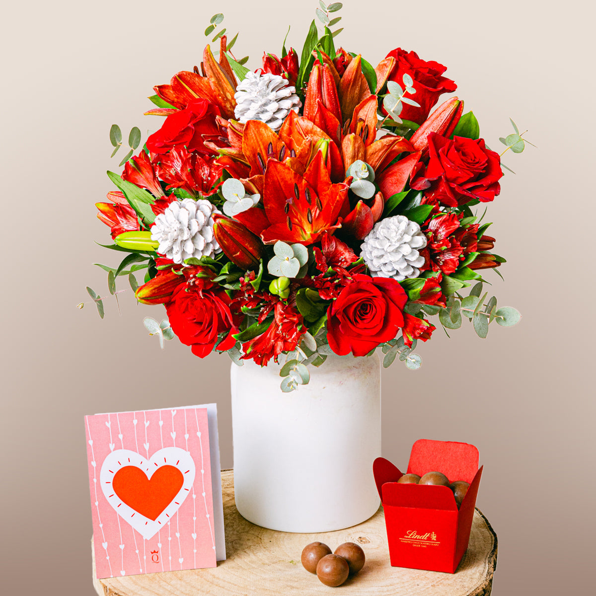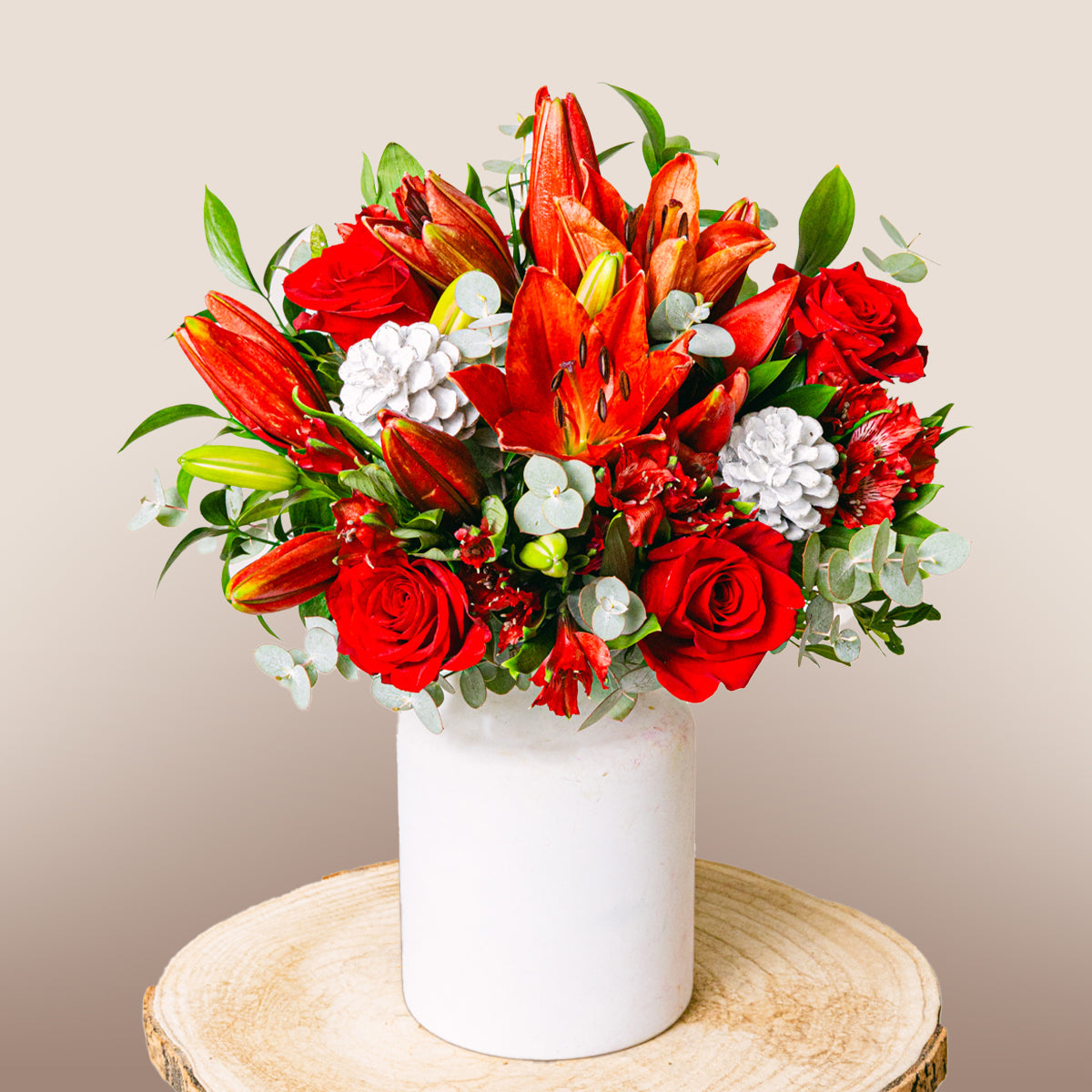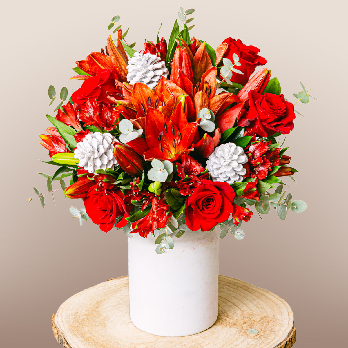 Este elegante ramo lo apuesta todo al rojo, el color clásico de la Navidad. Los lirios, las rosas y las alstroemerias se complementan con el detalle de las piñas, y hacen de este bouquet un regalo navideño perfecto. Envíaselo a alguien que esté lejos para hacerle sentir como en casa.