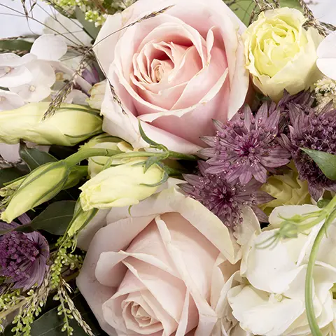 Toda la suavidad y belleza de la naturaleza, seleccionada para ti en un precioso ramo de flores frescas. Las delicadas rosas se intercalan con las hortensias blancas, ofreciendo una base sedosa y exquisita sobre la que se mece el resto de la composición. Las calas añaden su magia con una exótica flor en espiral, mientras que las verónicas salpican el conjunto con notas de fuerza, valor y perseverancia. Regala un sinfín de buenas sensaciones con esta opción VIP de suprema elegancia.