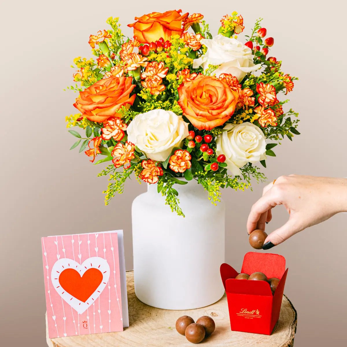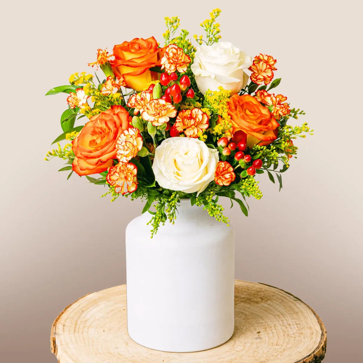 El equilibrio entre las rosas blancas, acompañadas de claveles y rosas naranjas es una mezcla perfecta para alegrar cualquier ambiente. El ramo es un regalo ideal para cada ocasión especial y para dar calidez y alegría a una persona especial.