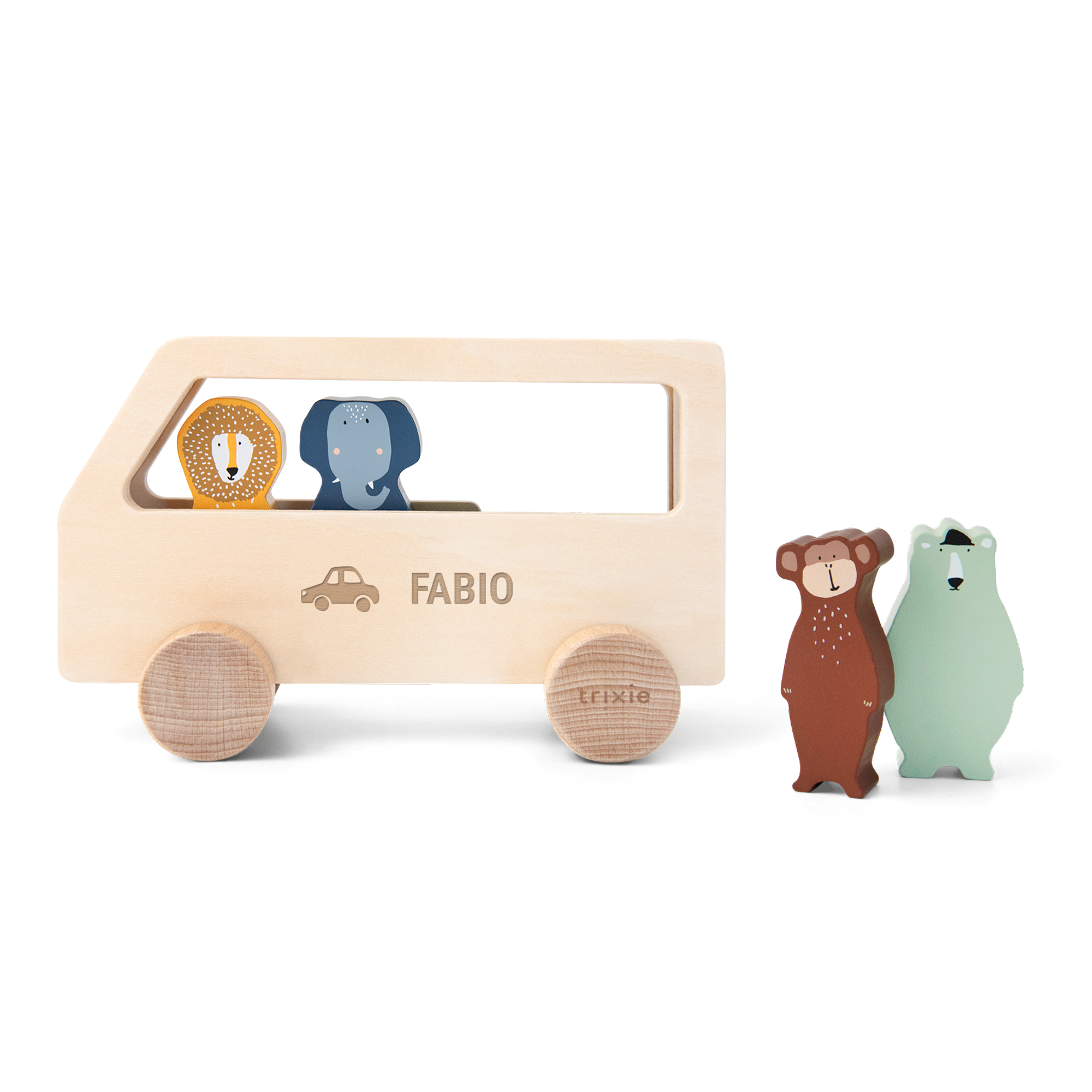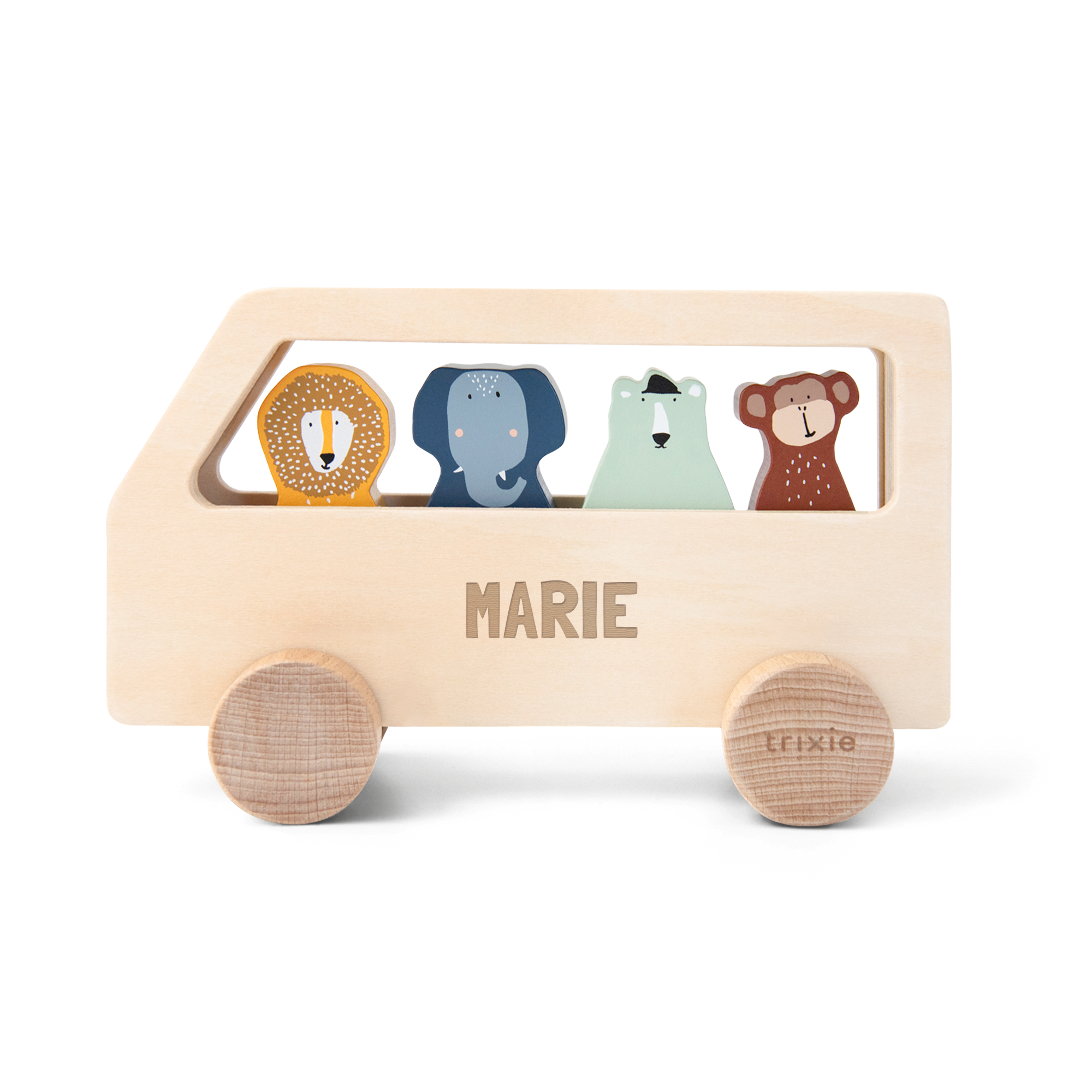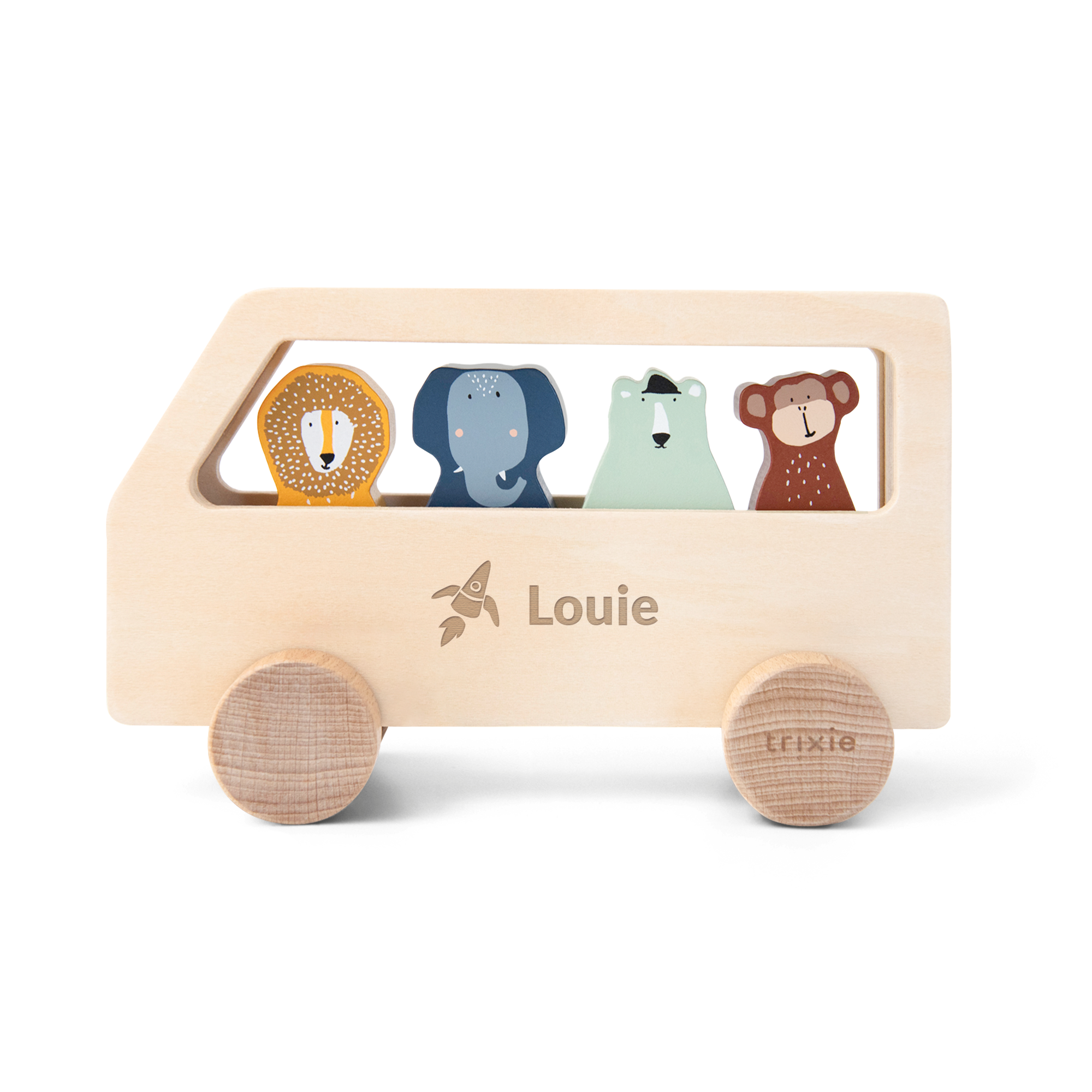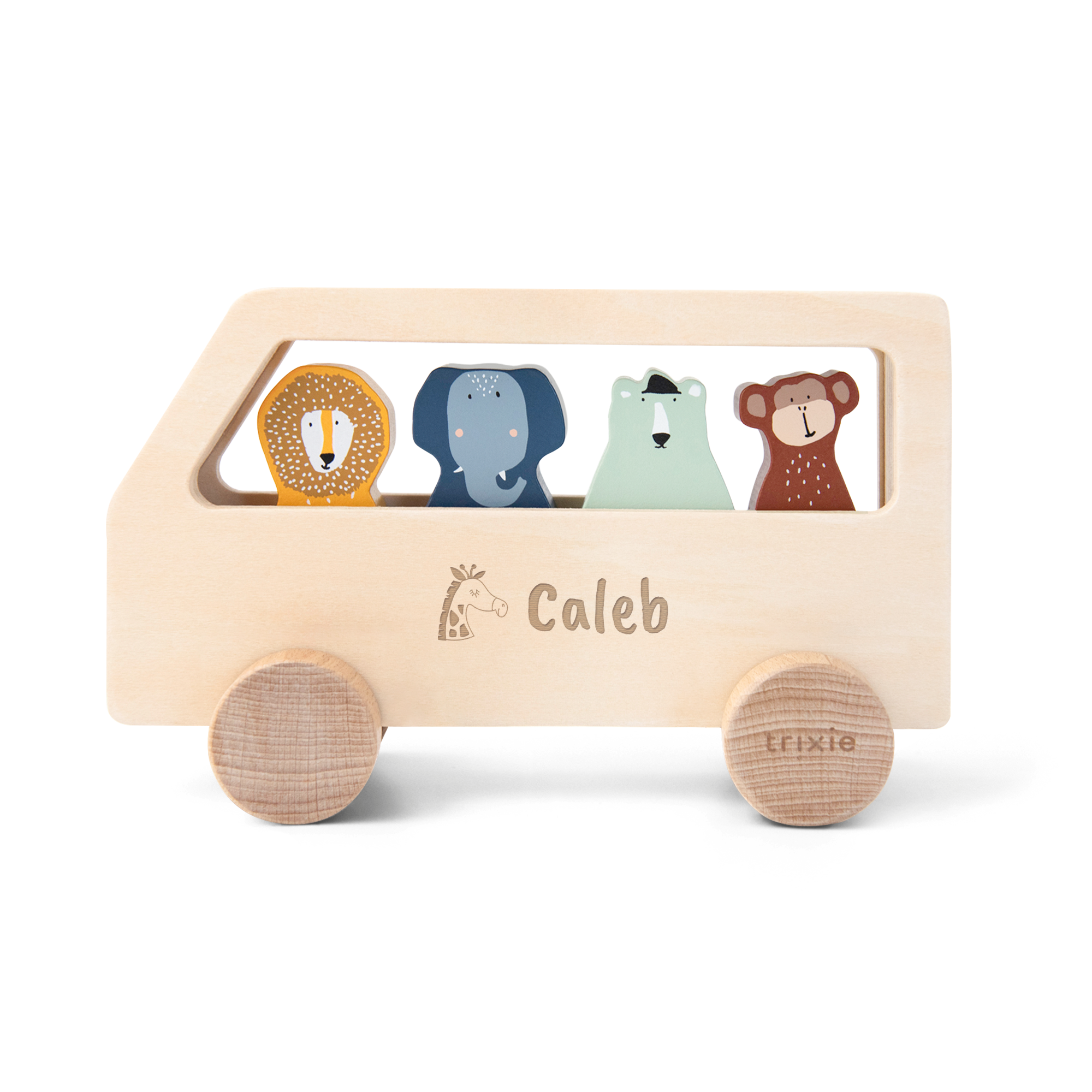 Un lindo autobús de madera Trixie con animales grabado con el nombre del destinatario. Incluye cuatro animales de madera removibles.