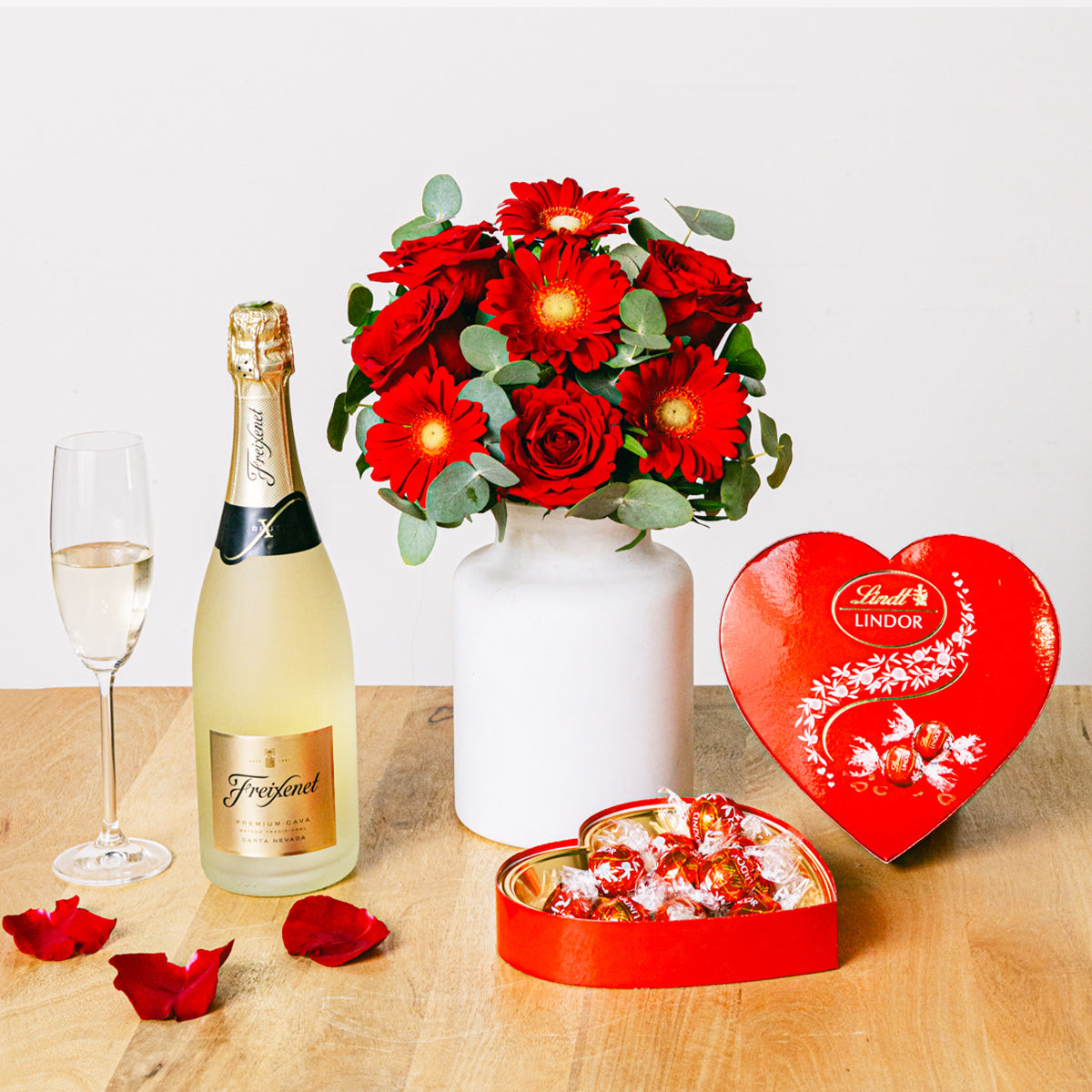 En este radiante ramo de rosas rojas y gerberas, que simbolizan amor y felicidad, cada flor expresa una conexión atemporal de pasión y alegría. Los ricos tonos rojos evocan emociones profundas, mientras que las alegres gerberas añaden un toque juguetón, creando una perfecta armonía de elegancia y energía vibrante. Ya sea para una ocasión especial, cumpleaños, aniversarios o para alegrar el día de alguien, este ramo transmite un mensaje sincero de calidez y afecto.