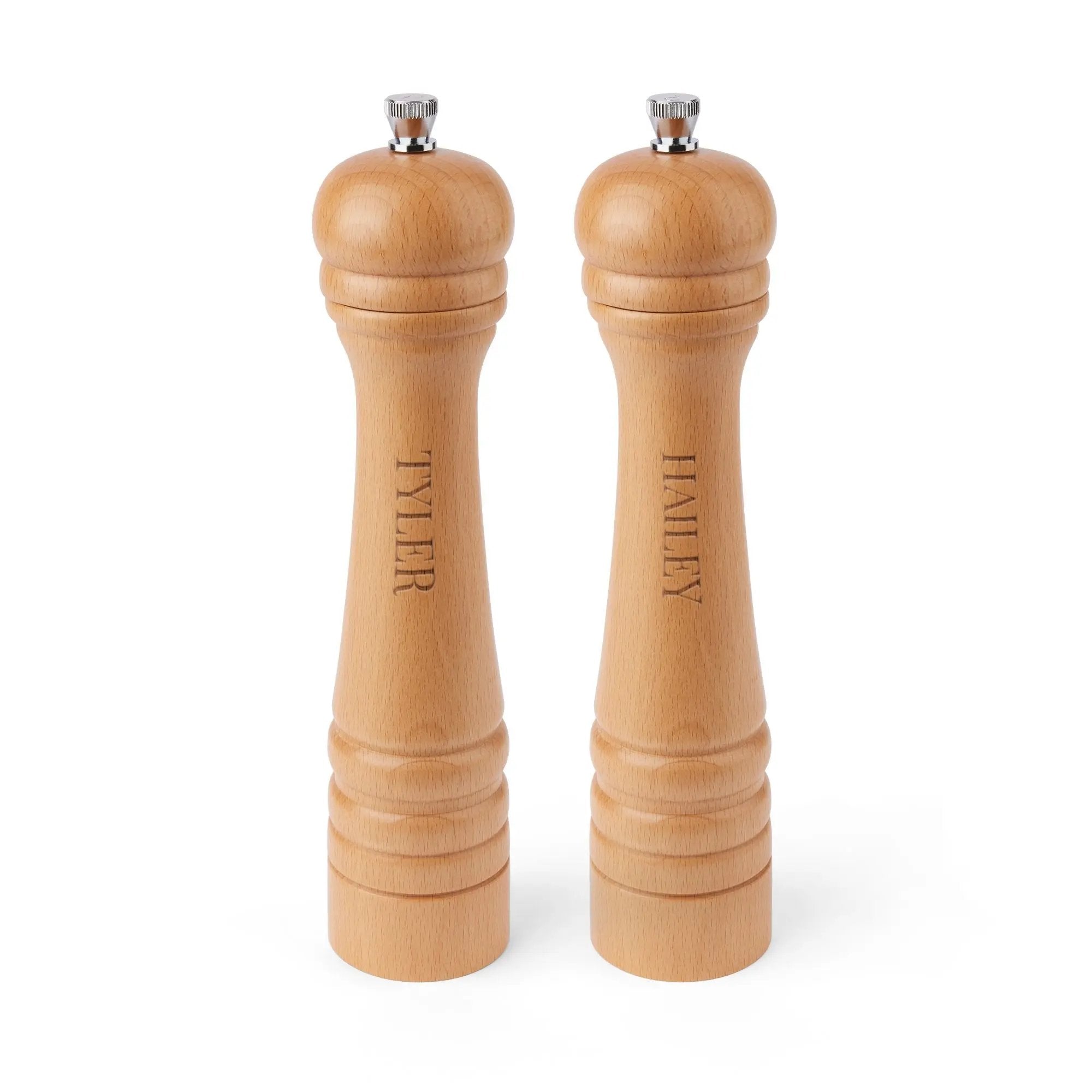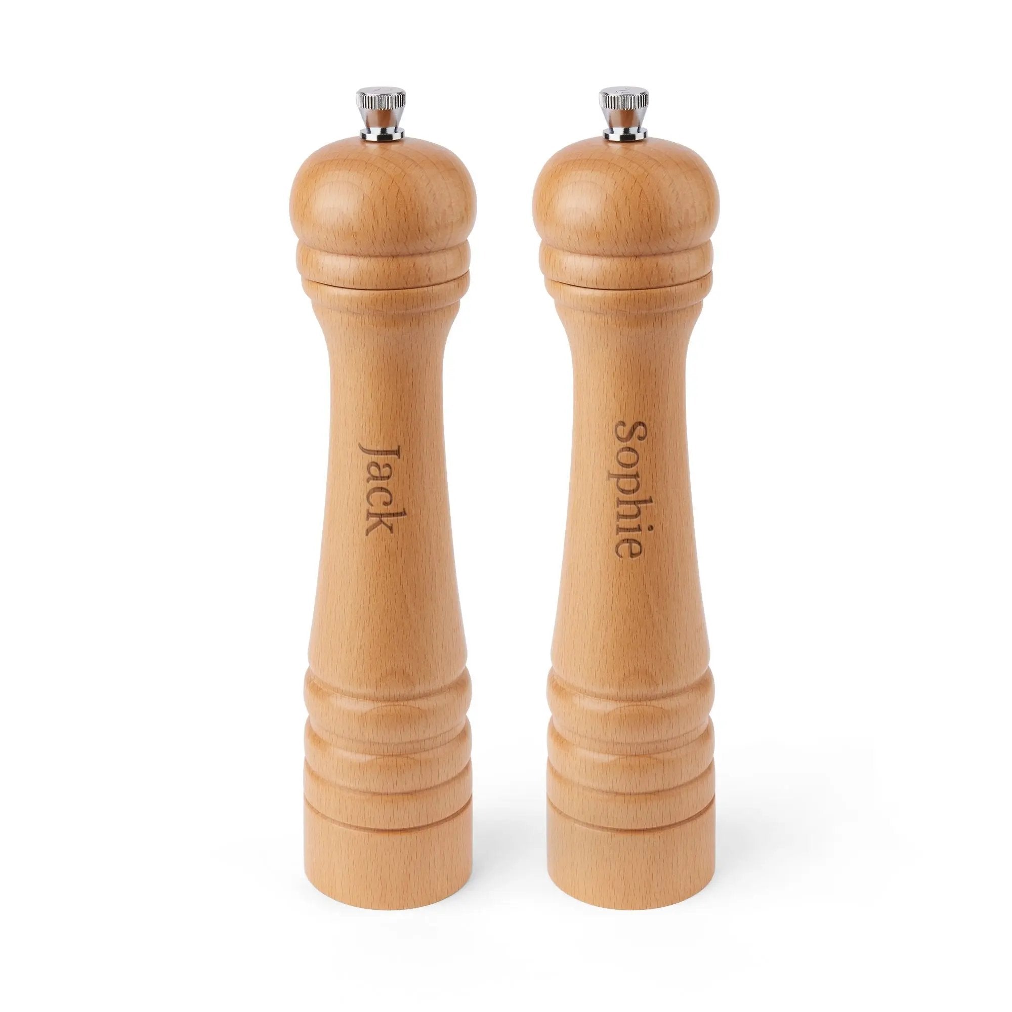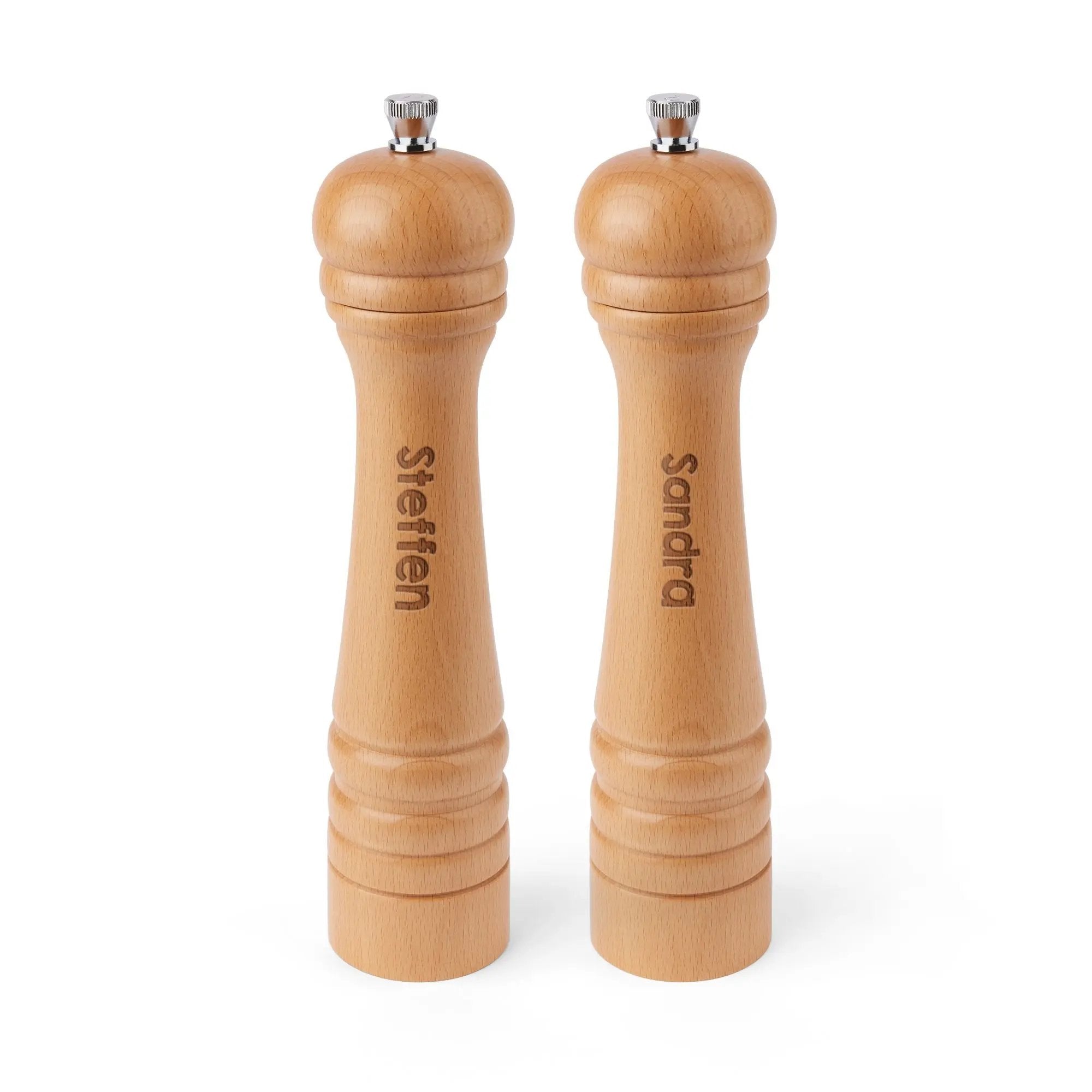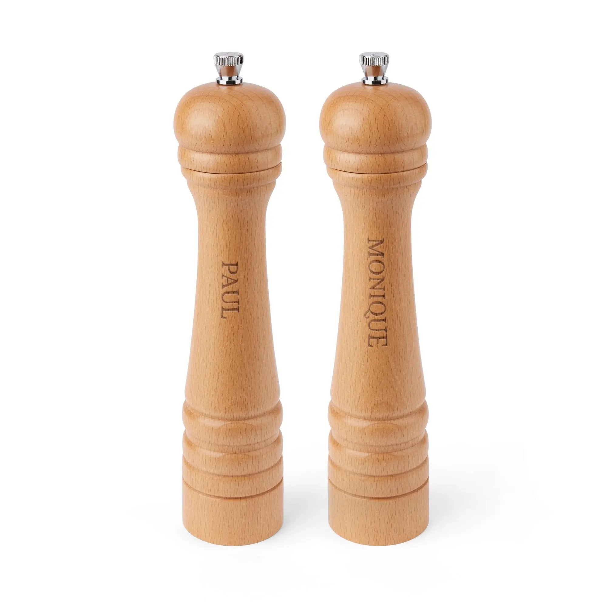 La madera de haya de alta calidad garantiza durabilidad y un tacto cálido y natural. El grabado personalizado añade un toque único y personal, convirtiéndolo en un regalo memorable. El mecanismo de molienda ajustable permite adaptar el grosor de las especias al gusto personal.