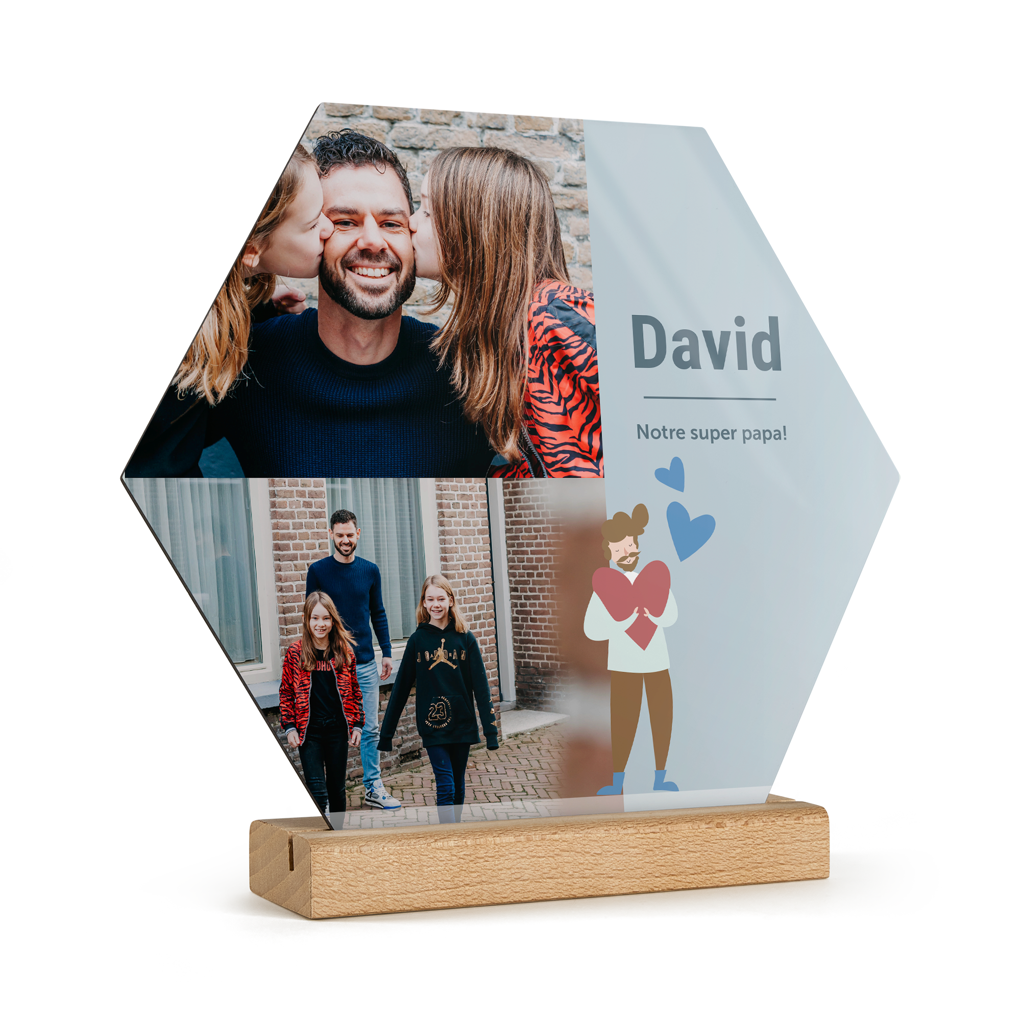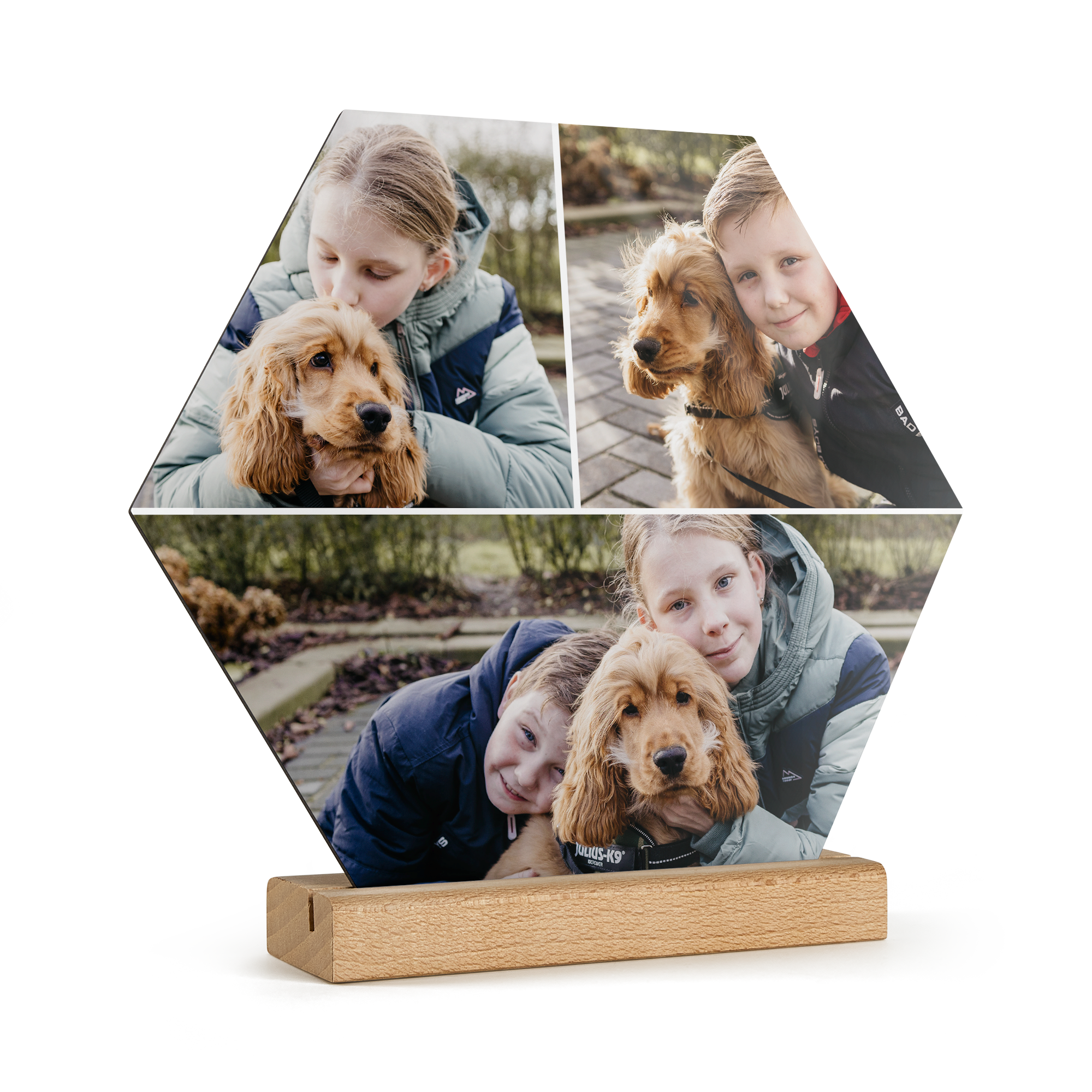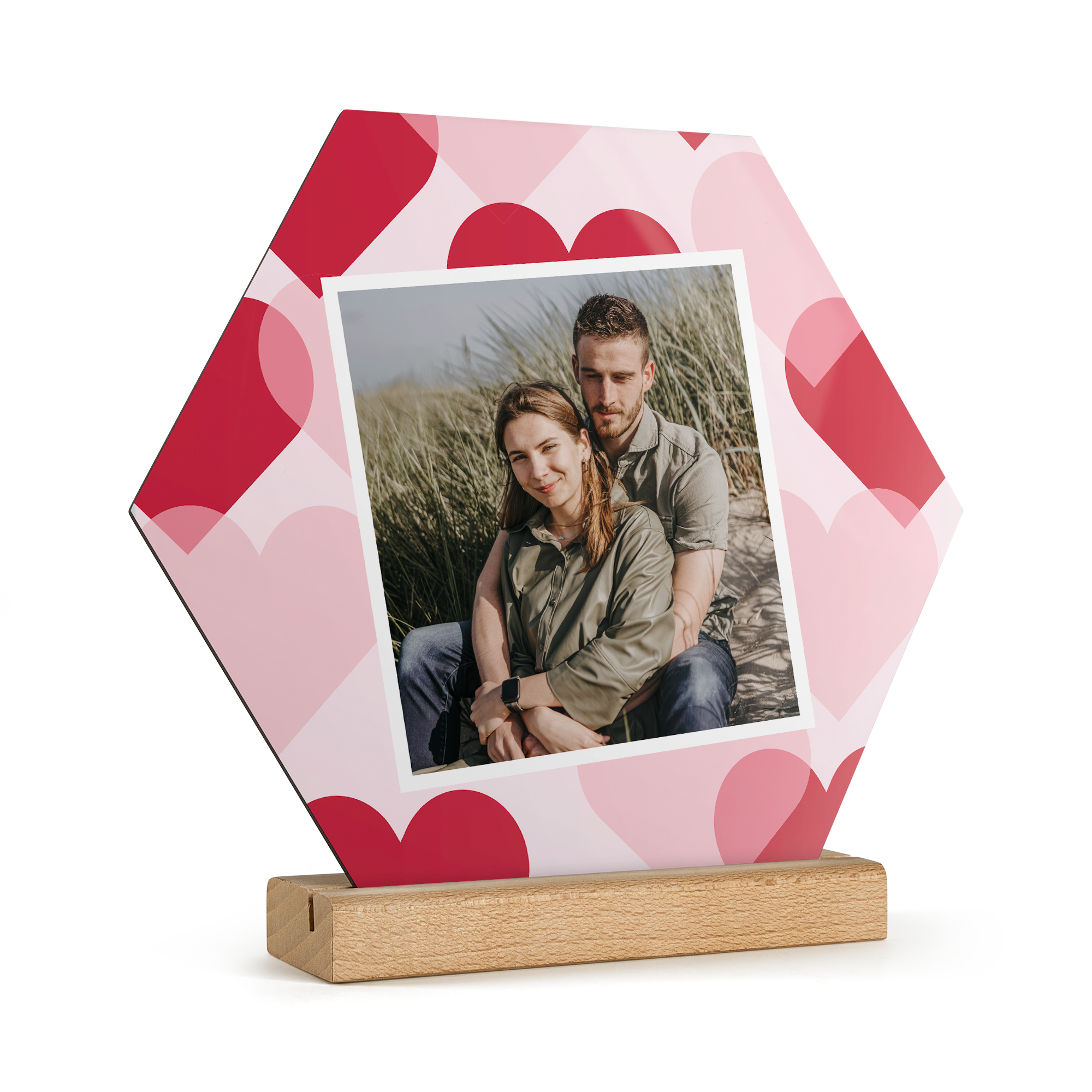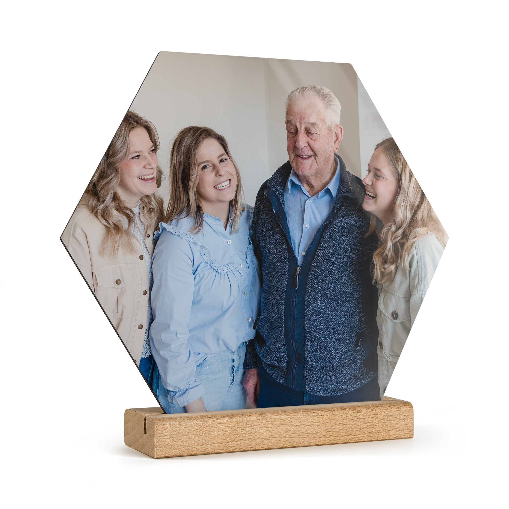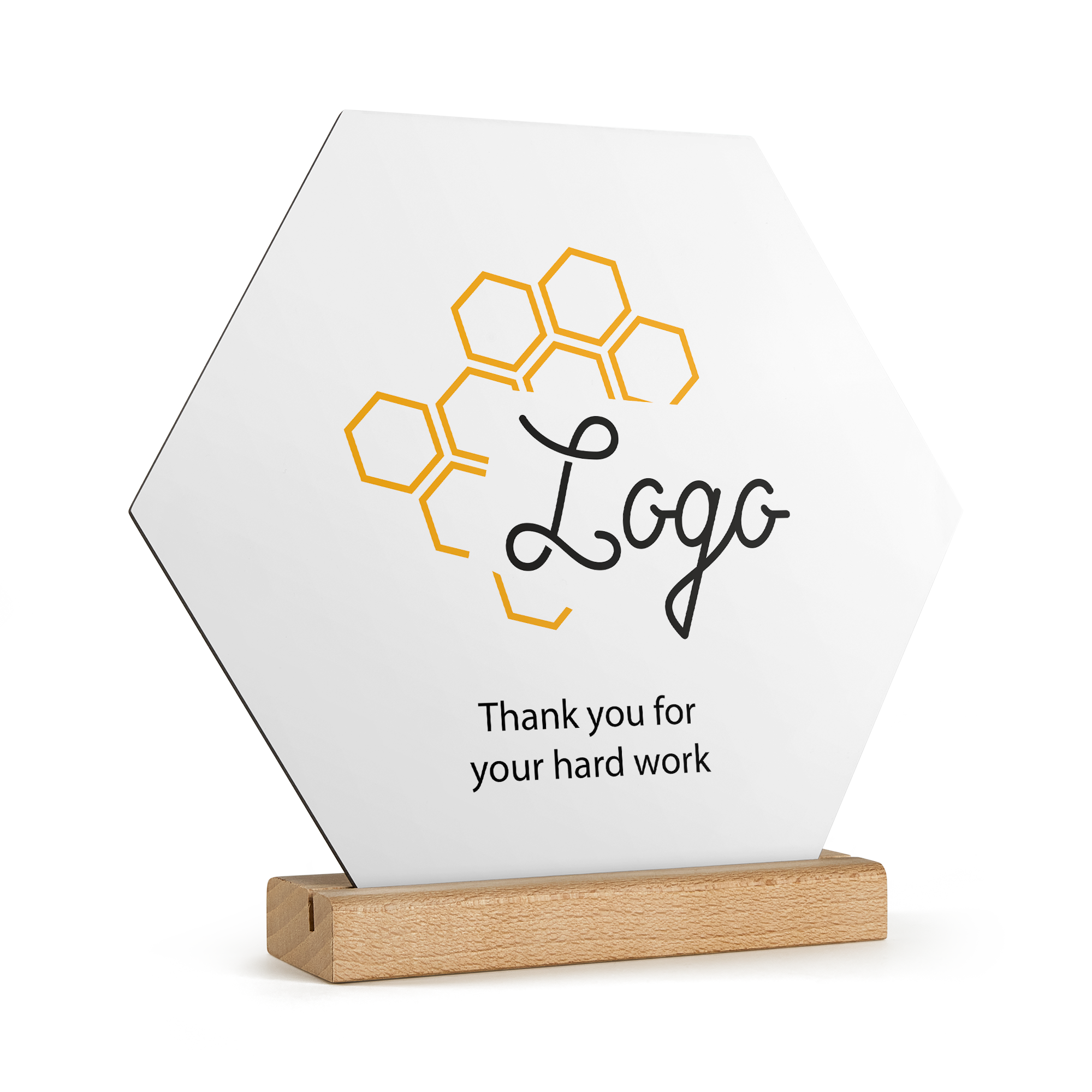 Más información sobre el panel de madera:Forma: hexágonoMaterial: Madera contrachapada de alta calidadAcabado: Revestimiento brillanteDimensiones del panel: 23 x 20 x 0.3 cmDimensiones del soporte: 15 x 5 x 2 cm Personalización: con foto, texto y/o logotipo Impresión: en colores claros y nítidos