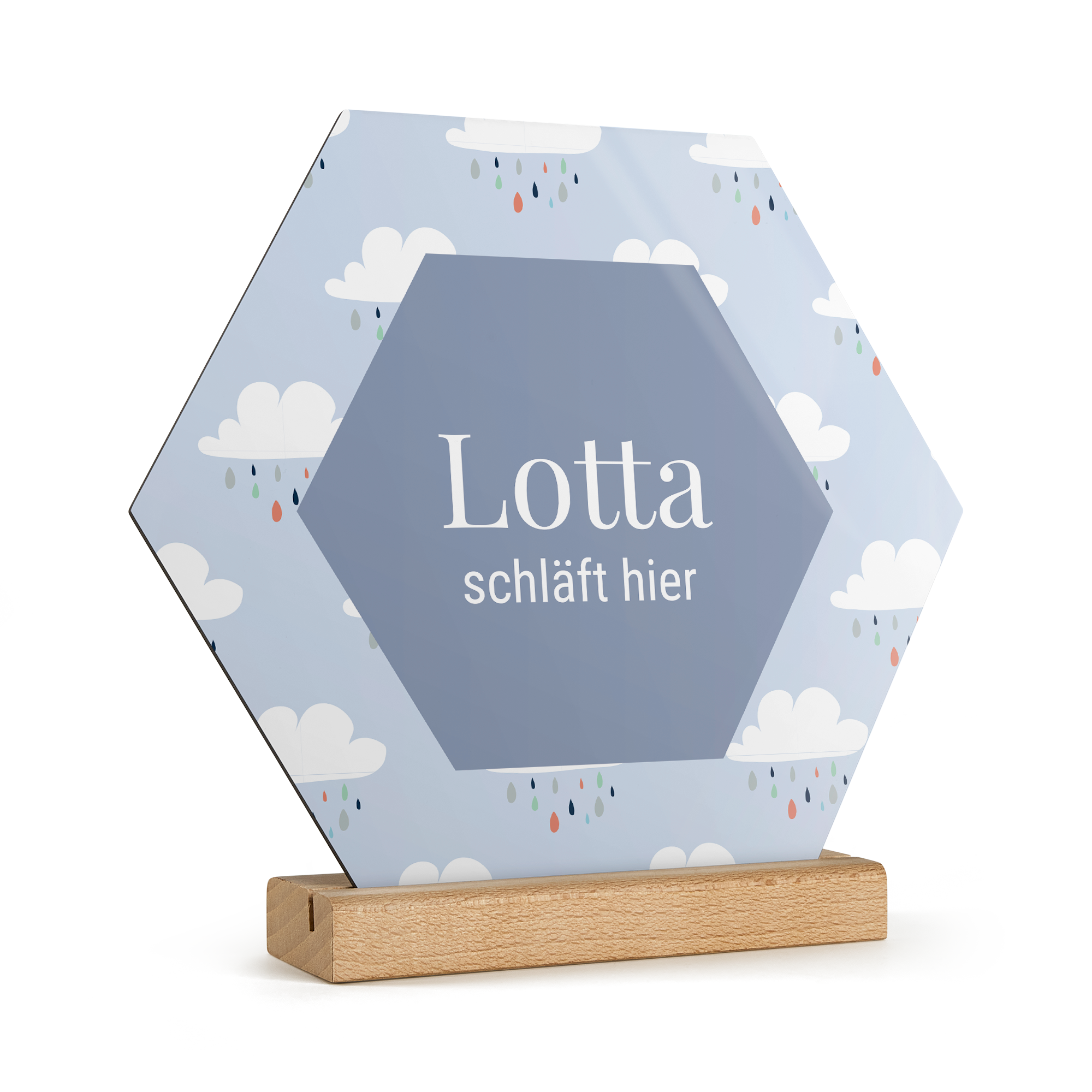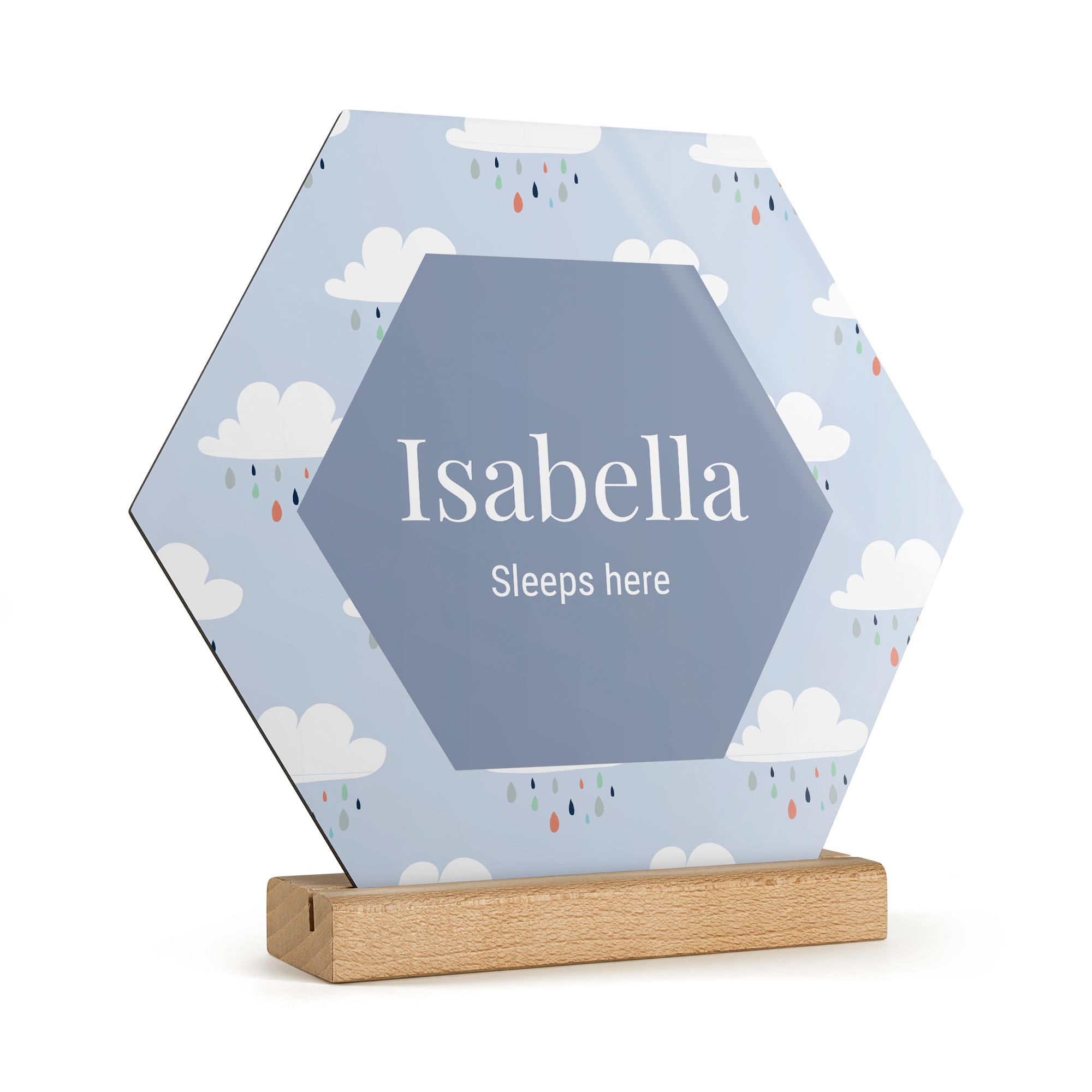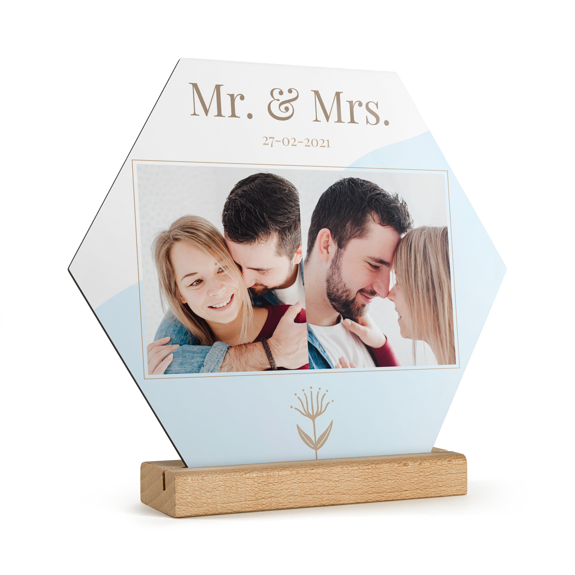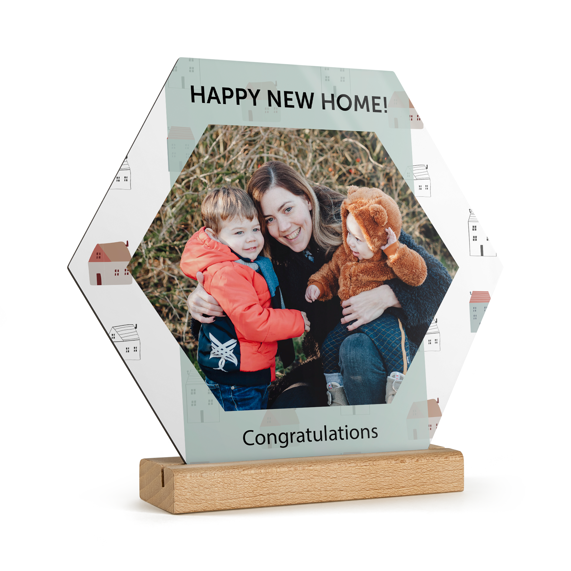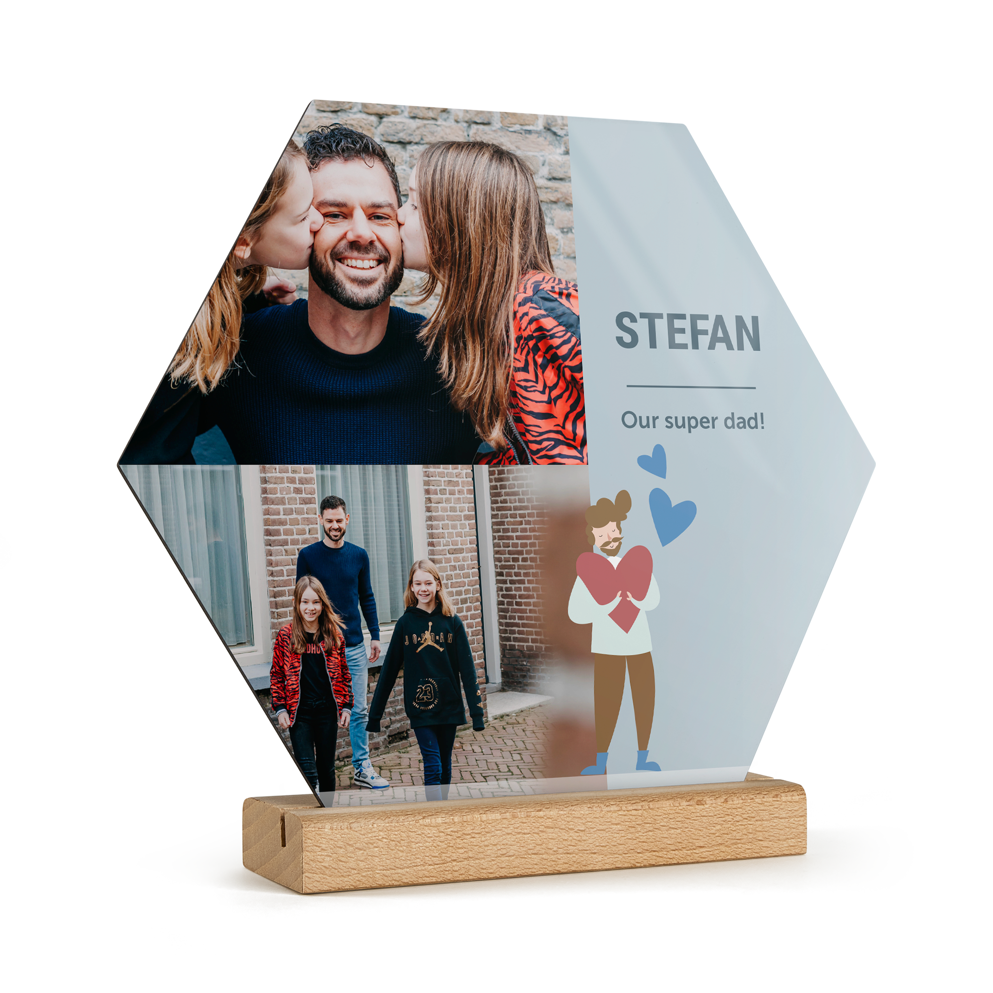 Más información sobre el panel de madera:Forma: hexágonoMaterial: Madera contrachapada de alta calidadAcabado: Revestimiento brillanteDimensiones del panel: 23 x 20 x 0.3 cmDimensiones del soporte: 15 x 5 x 2 cm Personalización: con foto, texto y/o logotipo Impresión: en colores claros y nítidos