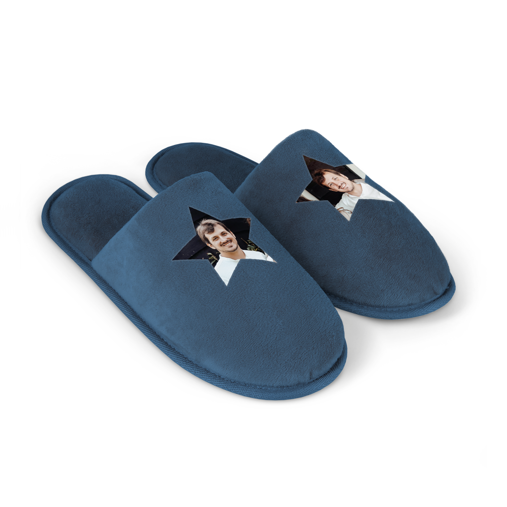 Más información de las zapatillas personalizadas:Material: 100% poliésterTalle: EU 43 - 45Color: AzulGrosor: 25 mmLargo: 28,1 cmPersonalización: con foto, nombre, texto y/o logotipoEstampado: perfecto y a todo colorInformación adicional: cada pantufla se puede personalizar individualmente. Limpieza: eliminar las manchas con un paño húmedo