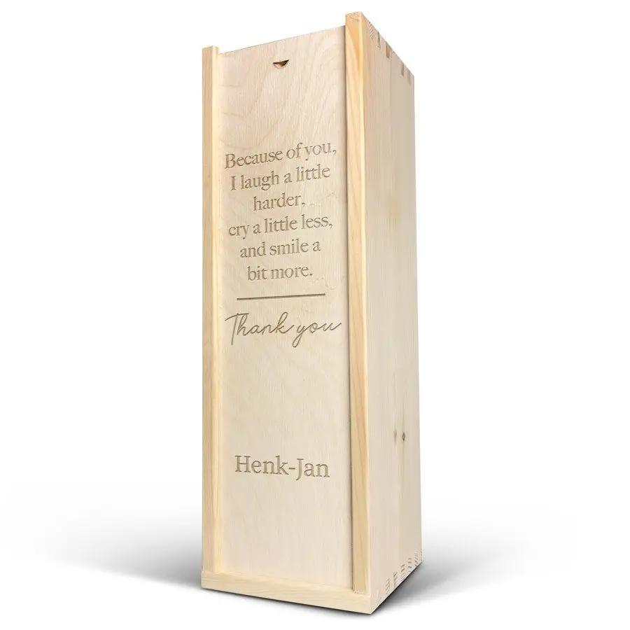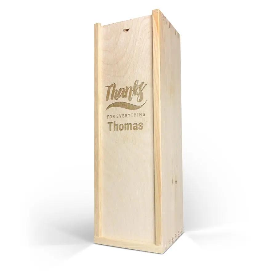 Más información sobre la personalizaciónPersonalización: con nombre o texto Método de personalización: grabado láser de alta calidadColor del grabado: marrónDimensiones de la caja: 36.5 x 12 x 11 cmExtra: la caja de madera está certificada por FSCMás detalles sobre la ginebraNombre: Sadler's Peaky BlinderTipo de ginebra: seca especiadaContenido: 700 mlPaís: Inglaterra Porcentaje de alcohol: 40% Característica: la ginebra Peaky Blinder es una ginebra seca con hierbas y especias exóticas, como jengibre, pimienta negra y canela.