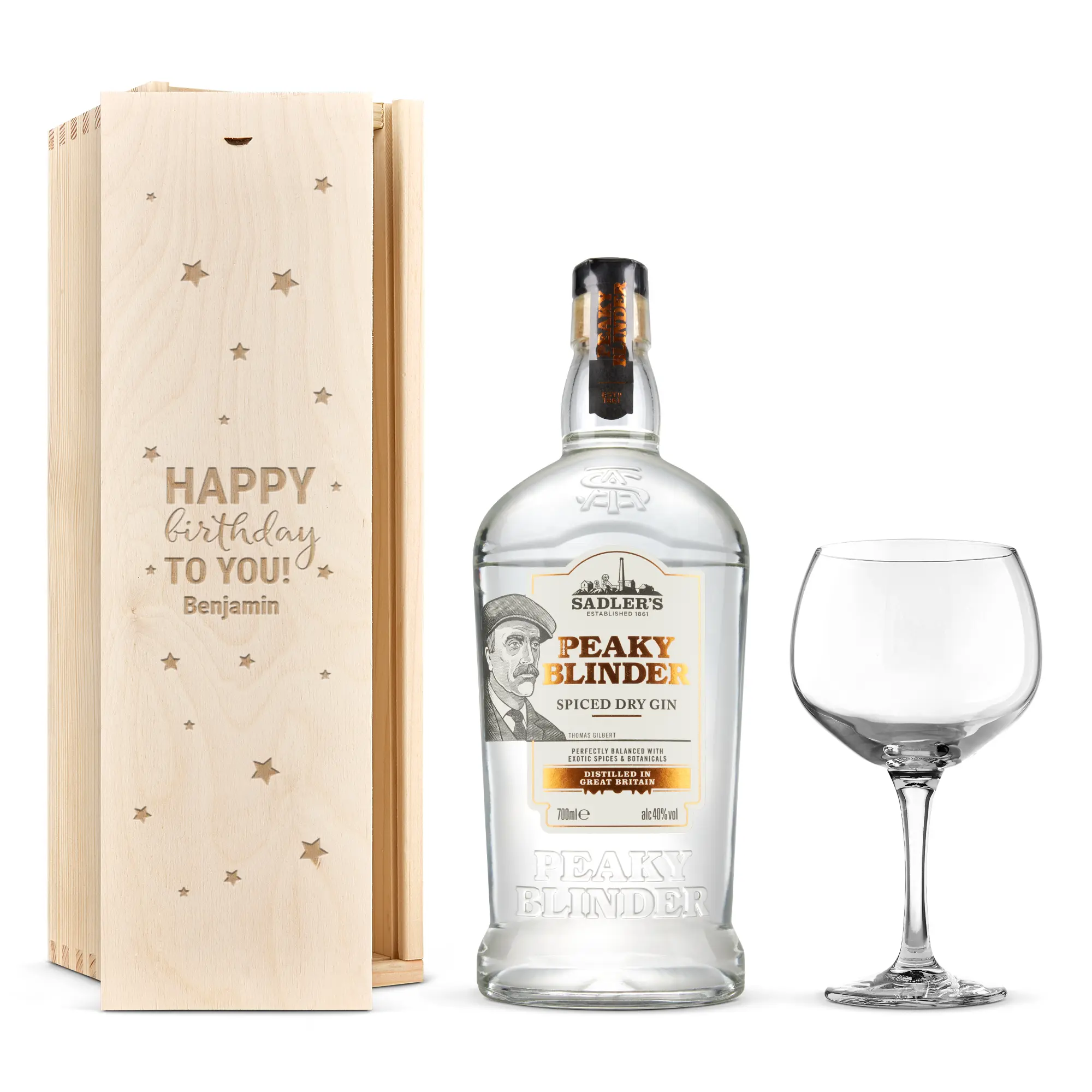 Experiencia Completa: Ginebra Sadler's Peaky Blinder (700 ml, 40% vol), vaso de gin-tonic con grabado láser de alta calidad, estuche de madera FSC-certificado (36.5 x 12 x 11 cm).