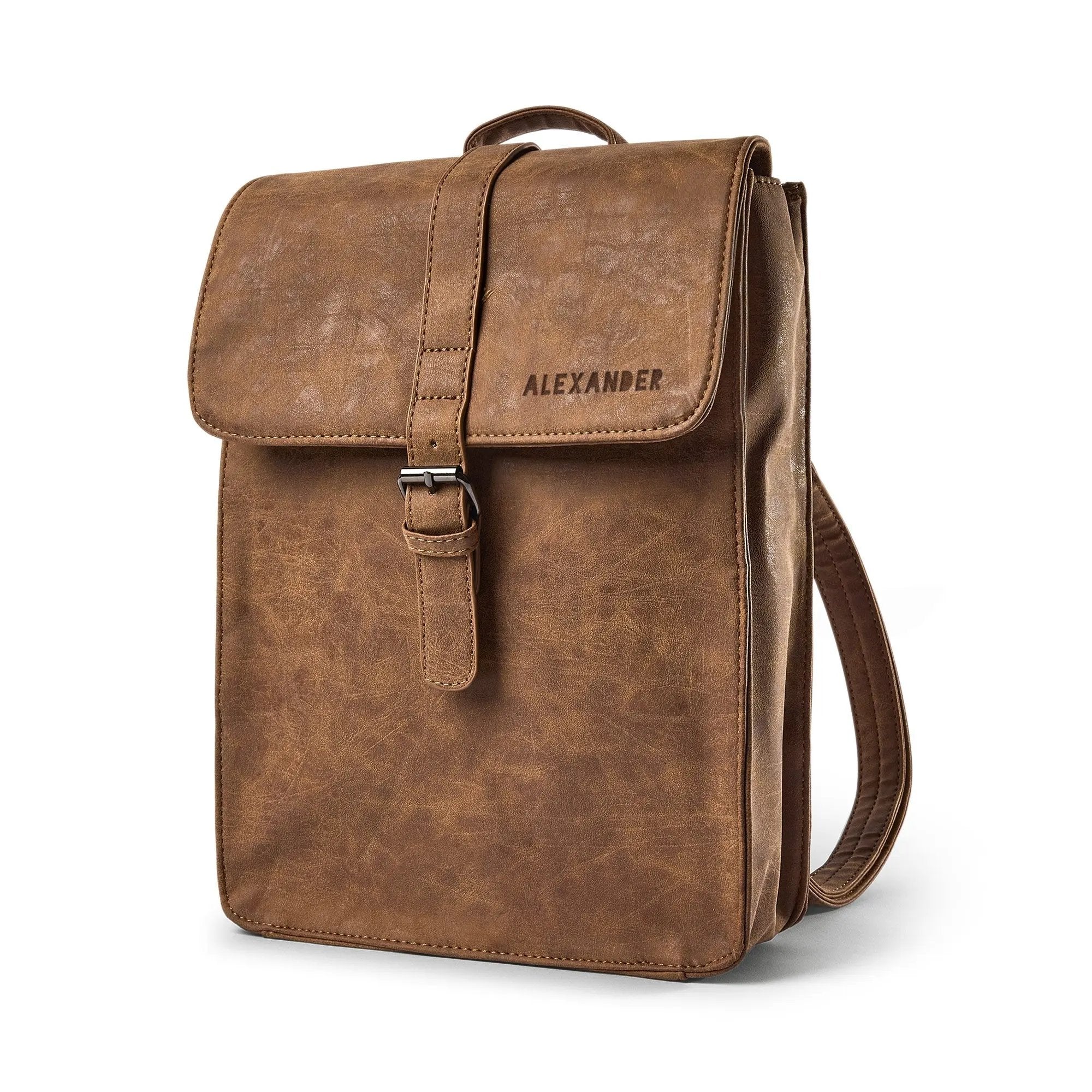 Más información sobre la mochila de cuero PU:Material: piel sintética PU  Dimensiones: 25 x 8.5 x 31 cmPeso: 700 gramosCapacidad: 7 litrosMétodo de personalización: grabado láser de alta calidadPersonalización: nombre o textoInformación adicional: incluye un gran compartimento principal cerrado con solapa en el que cabe una tablet. Correas ajustables para los hombros.