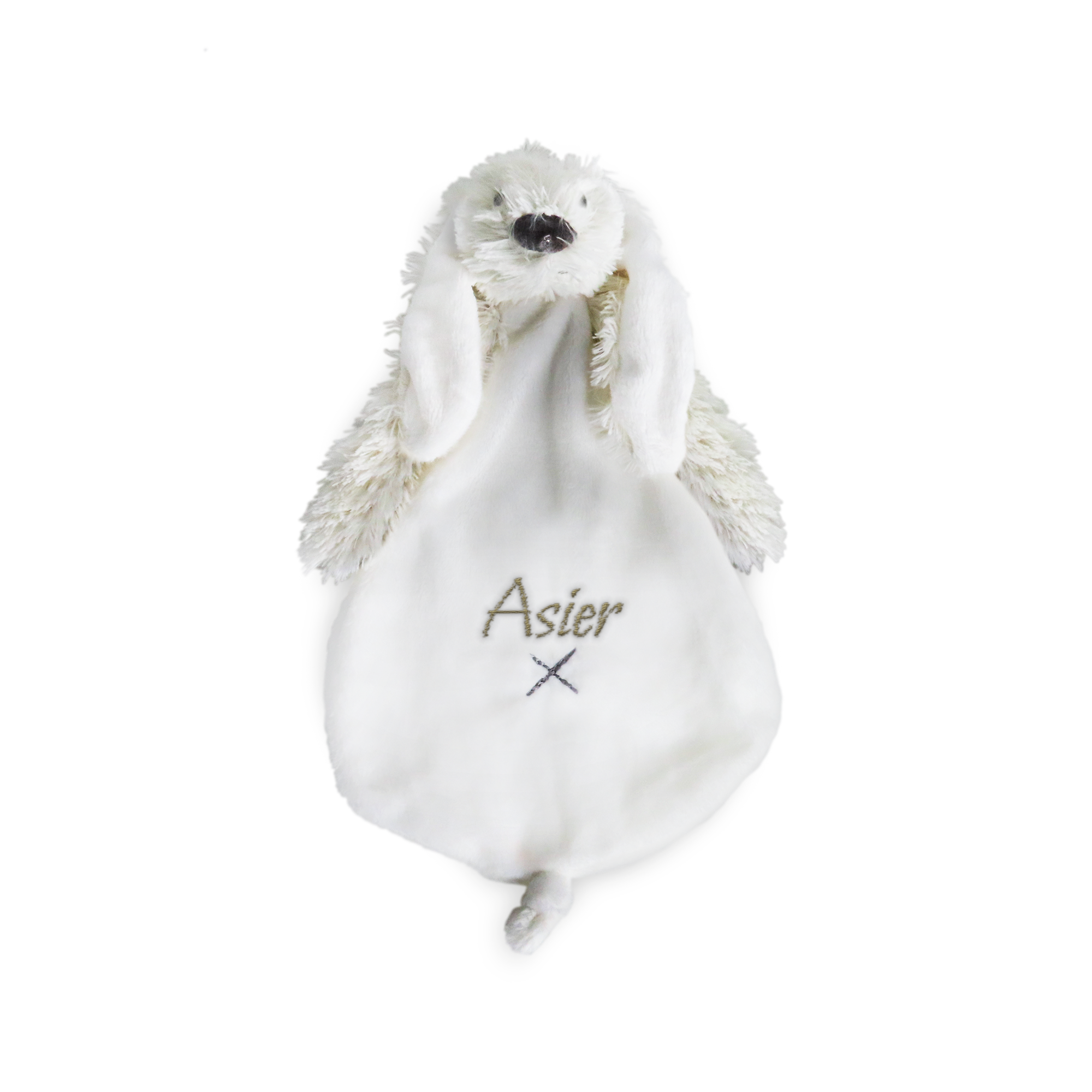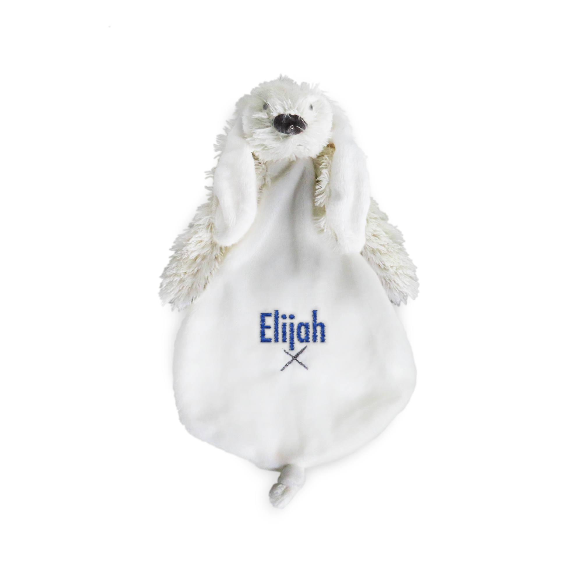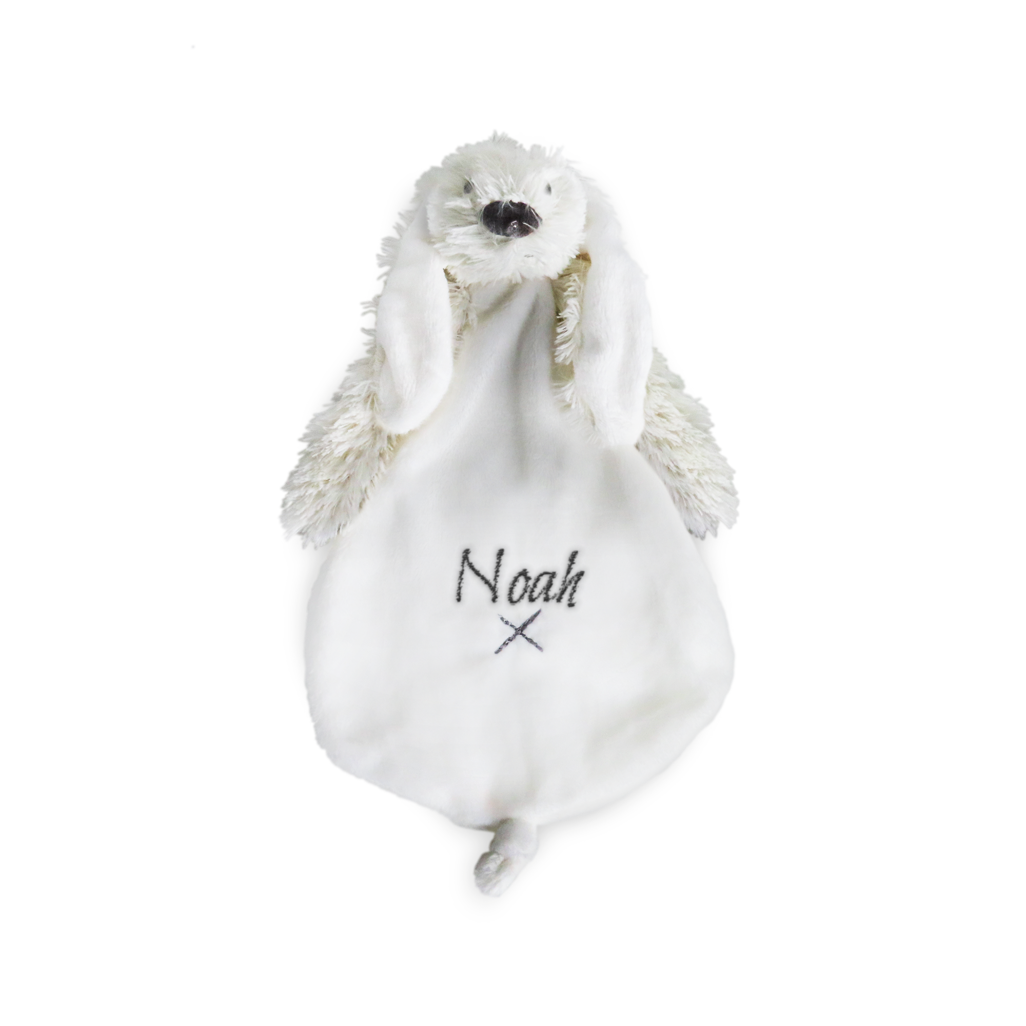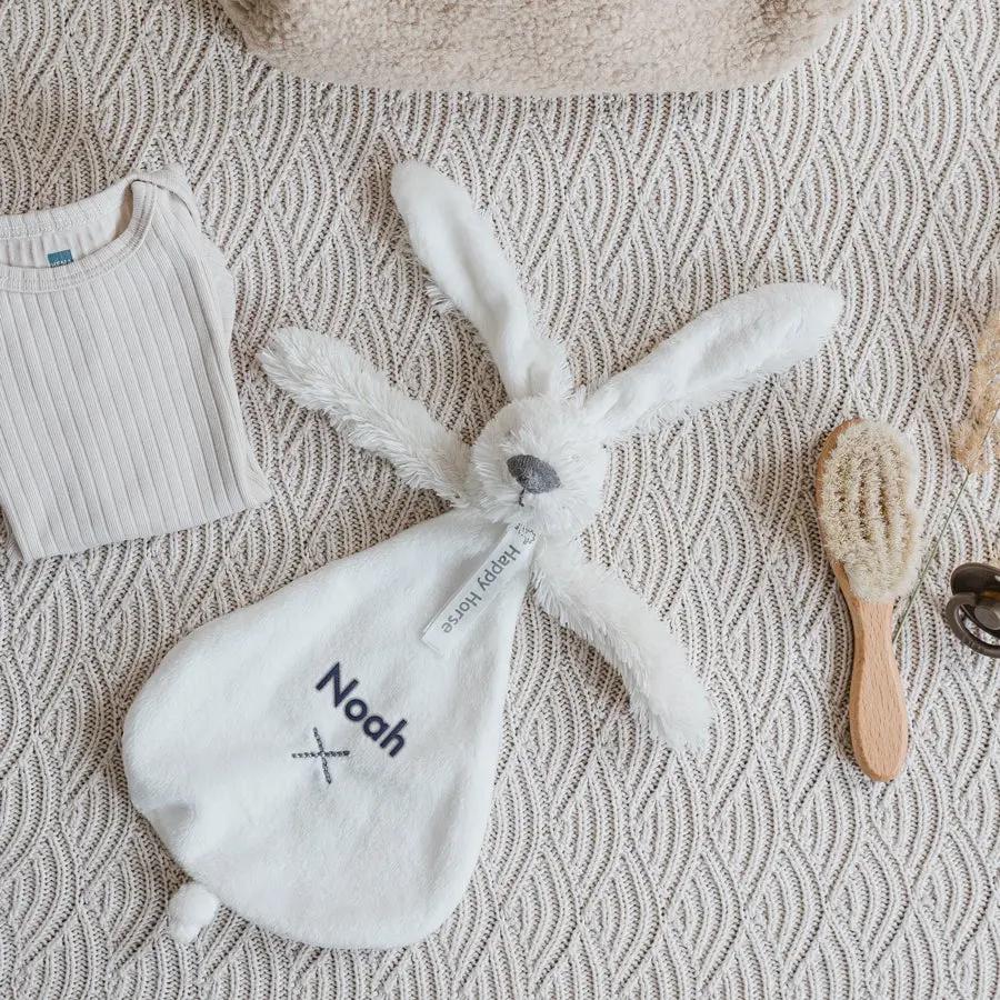 Sorprende a tu pequeño con este suave dou dou personalizado para bebé del conejo Richie, bordado con el nombre que quieras.