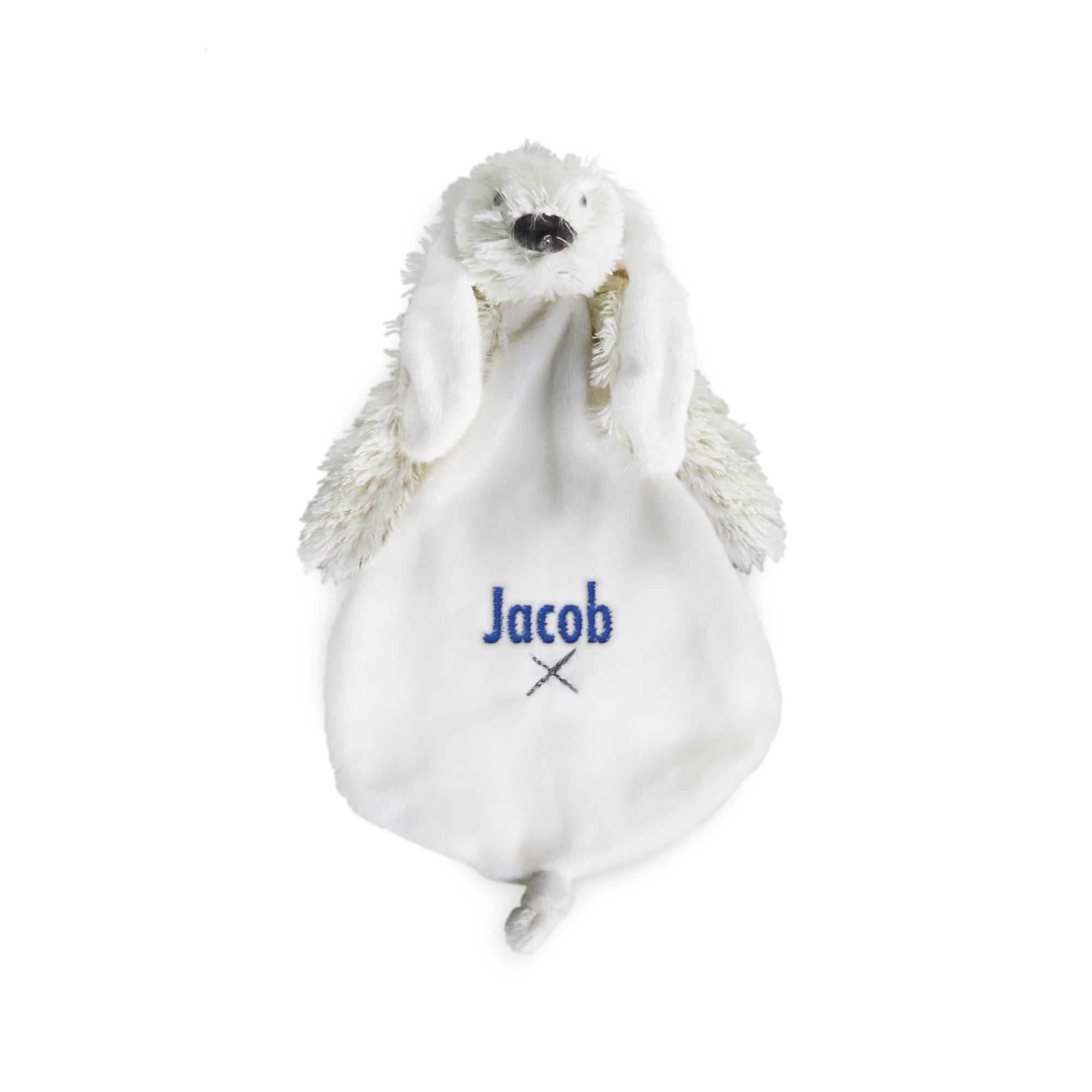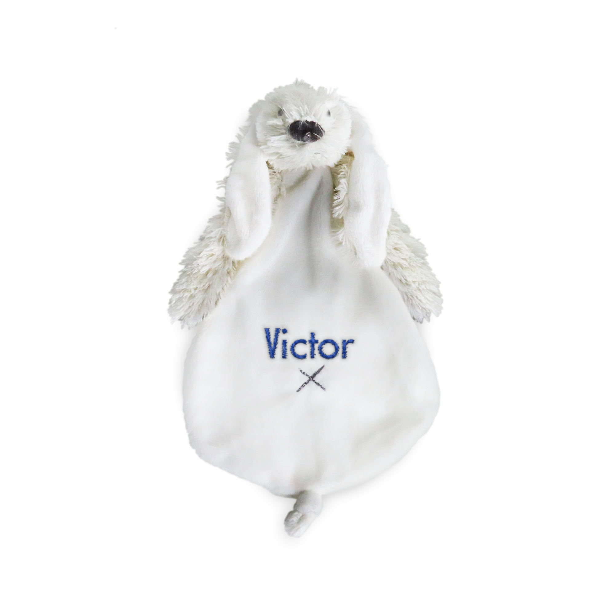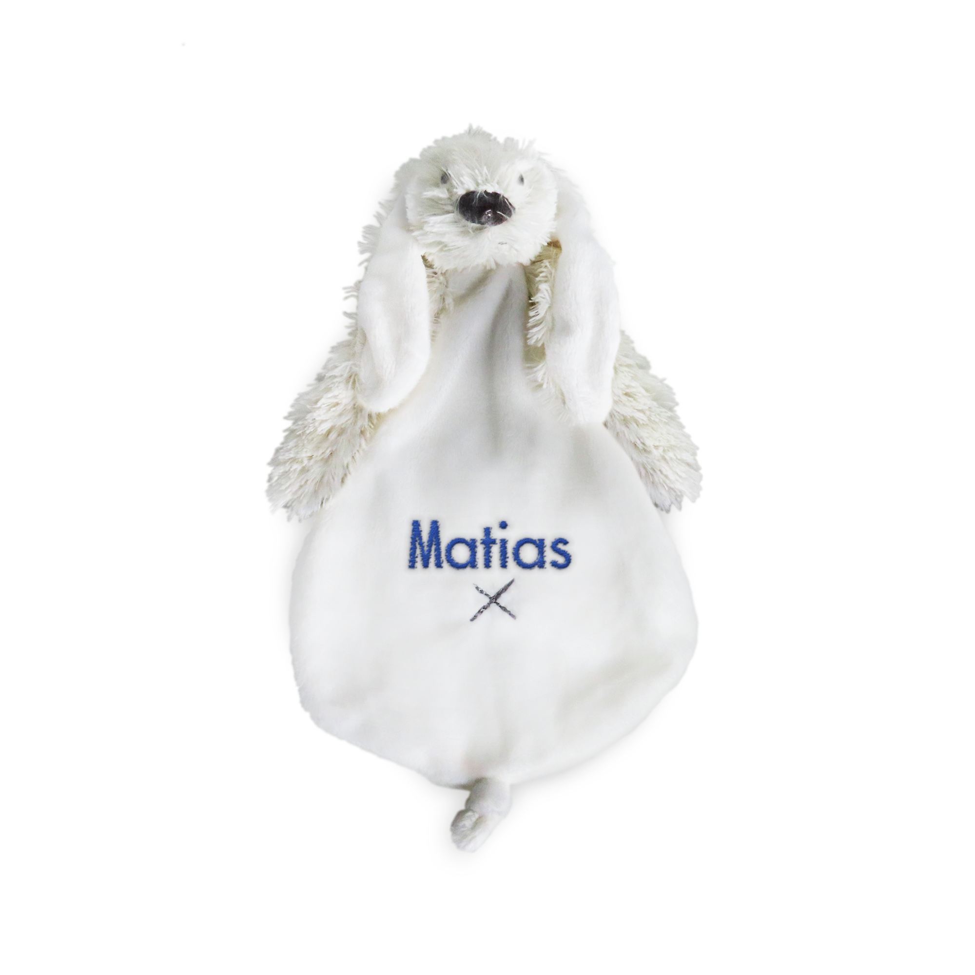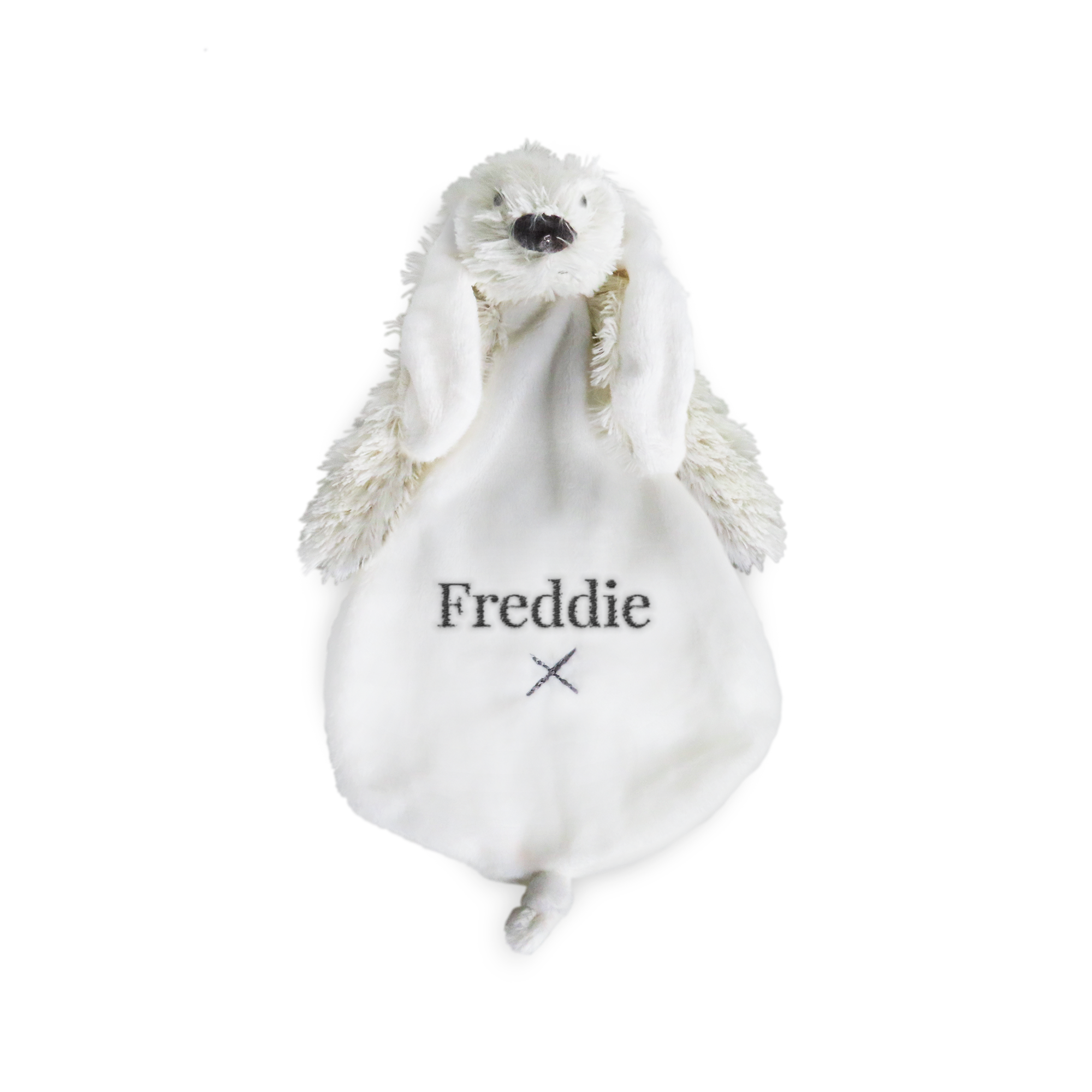 Sorprende a tu pequeño con este suave dou dou personalizado para bebé del conejo Richie, bordado con el nombre que quieras.