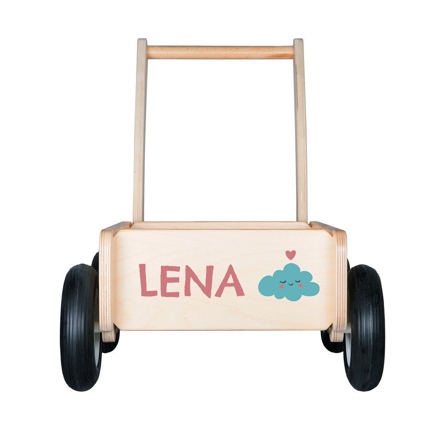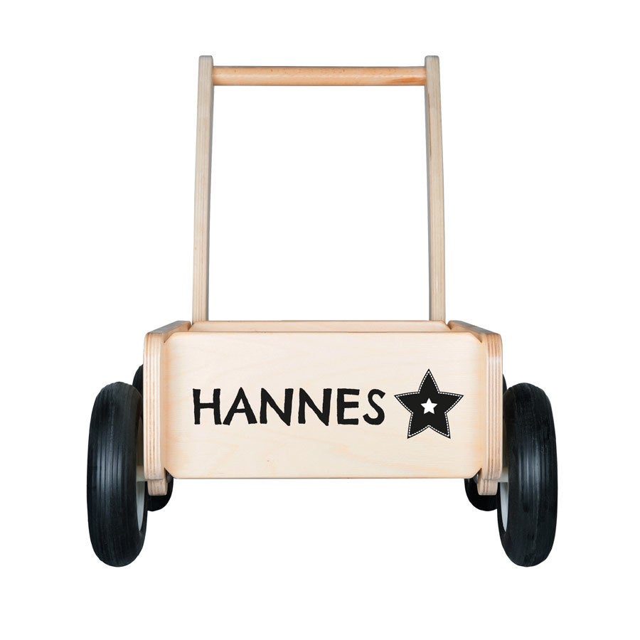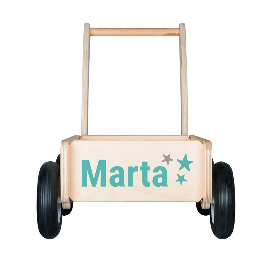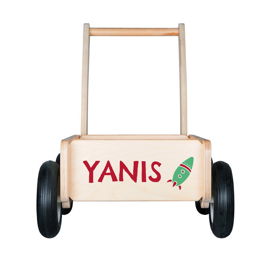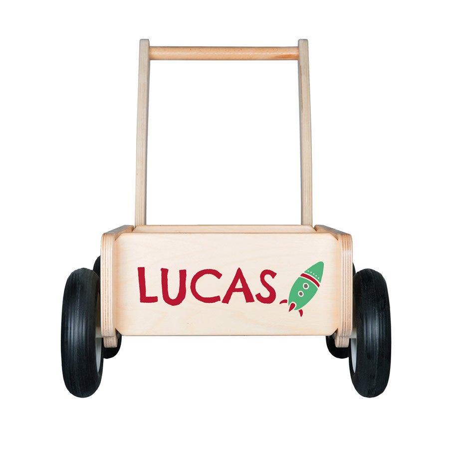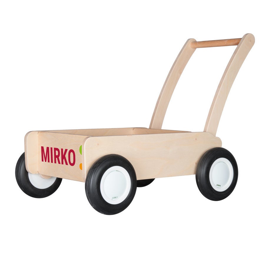 Crea un carrito de empuje de madera único con nombre. Madera de abedul de calidad muy fuerte con pegatinas brillantes. ¡Muchas horas de juego alegre!