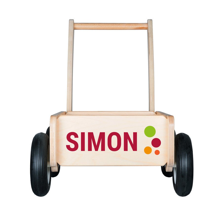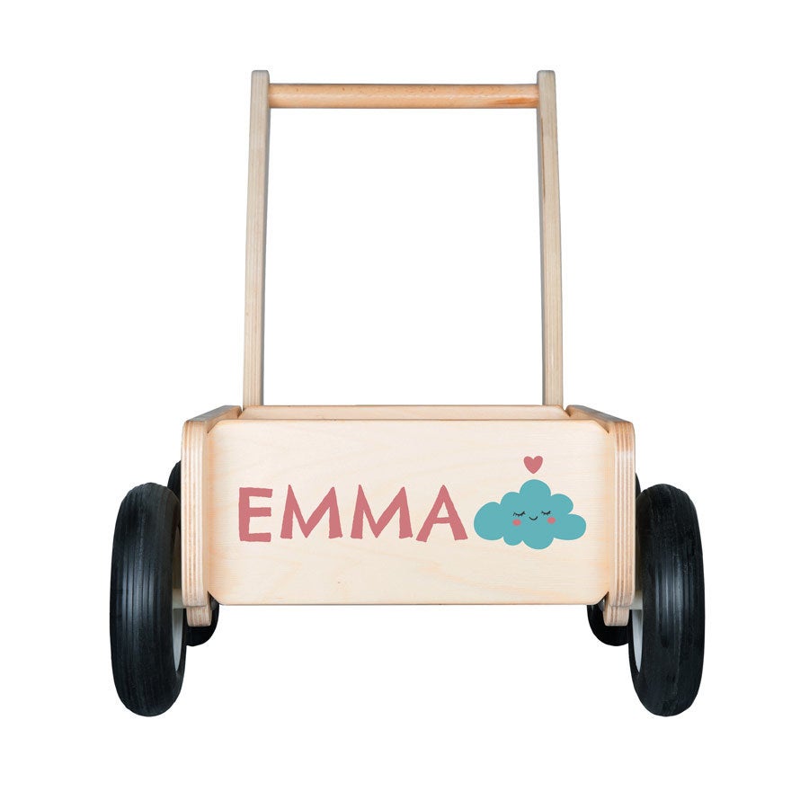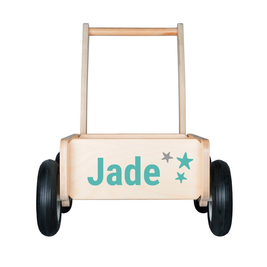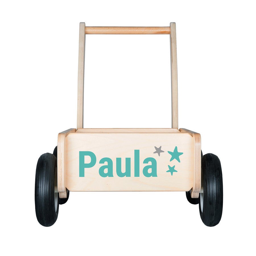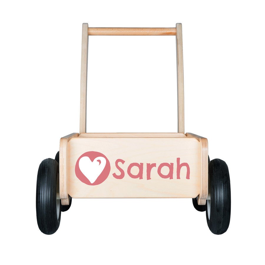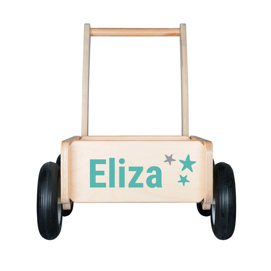 Crea un carrito de empuje de madera único con nombre. Madera de abedul de calidad muy fuerte con pegatinas brillantes. ¡Muchas horas de juego alegre!