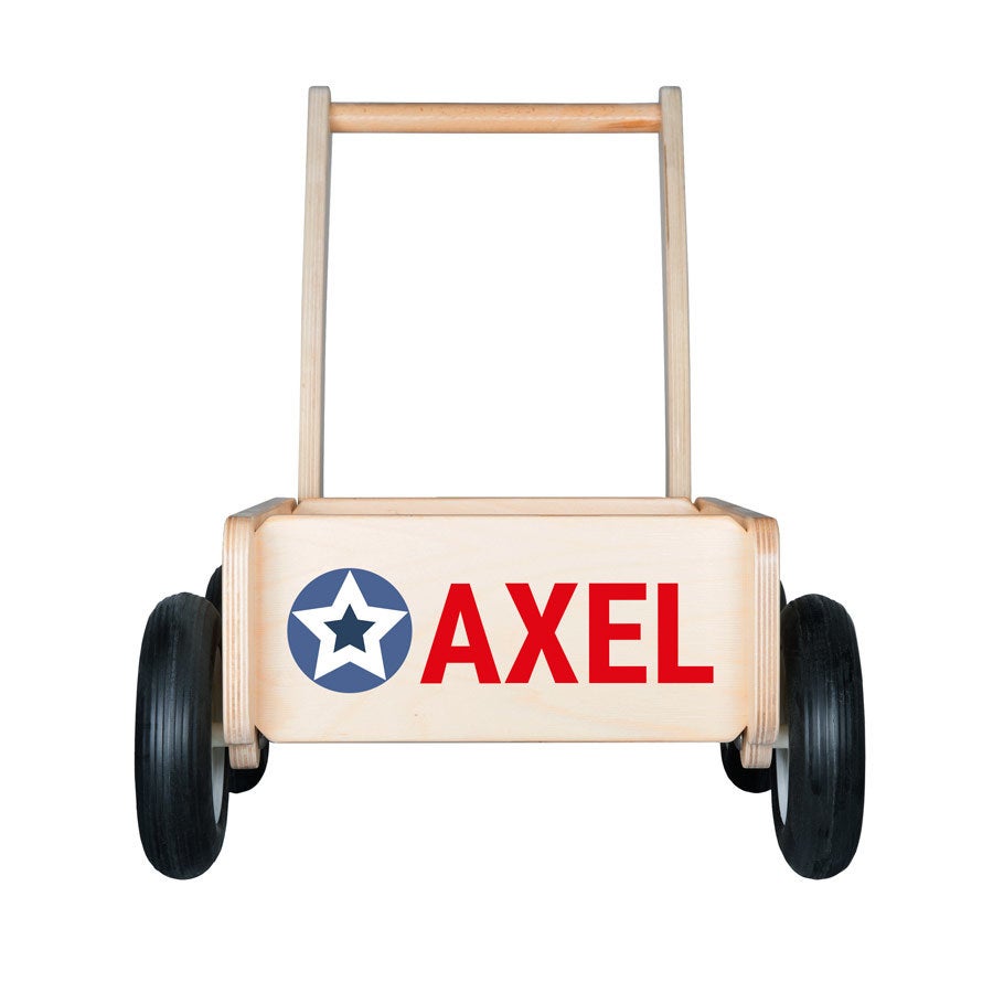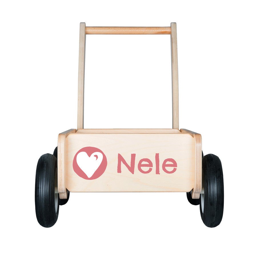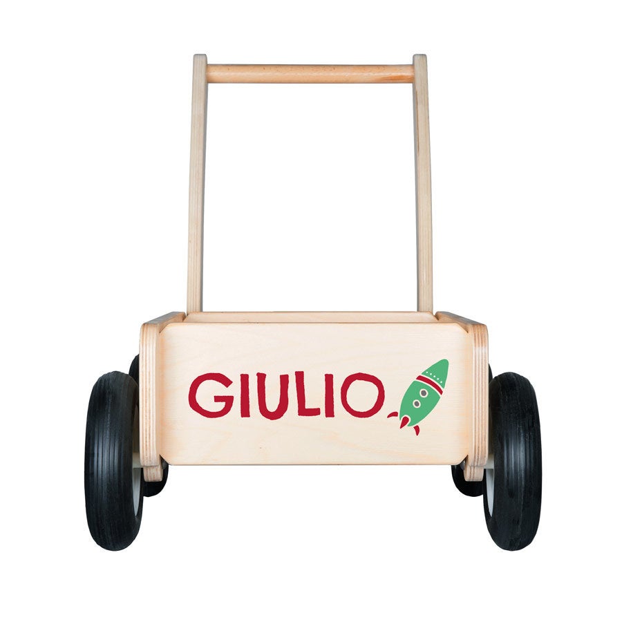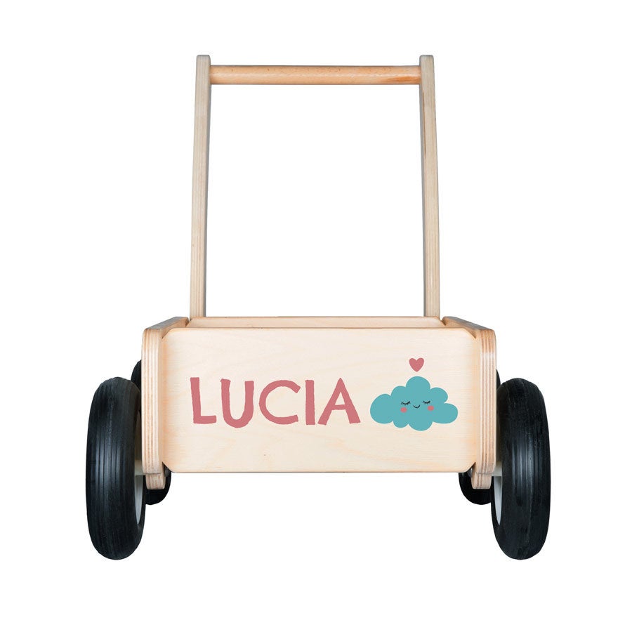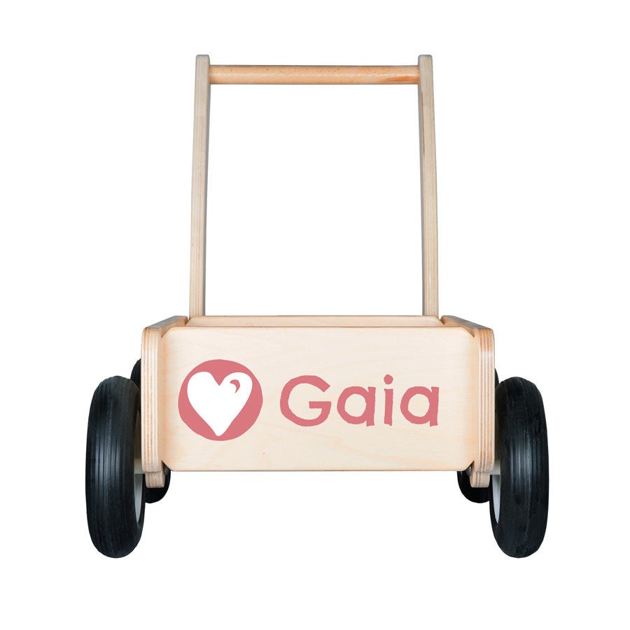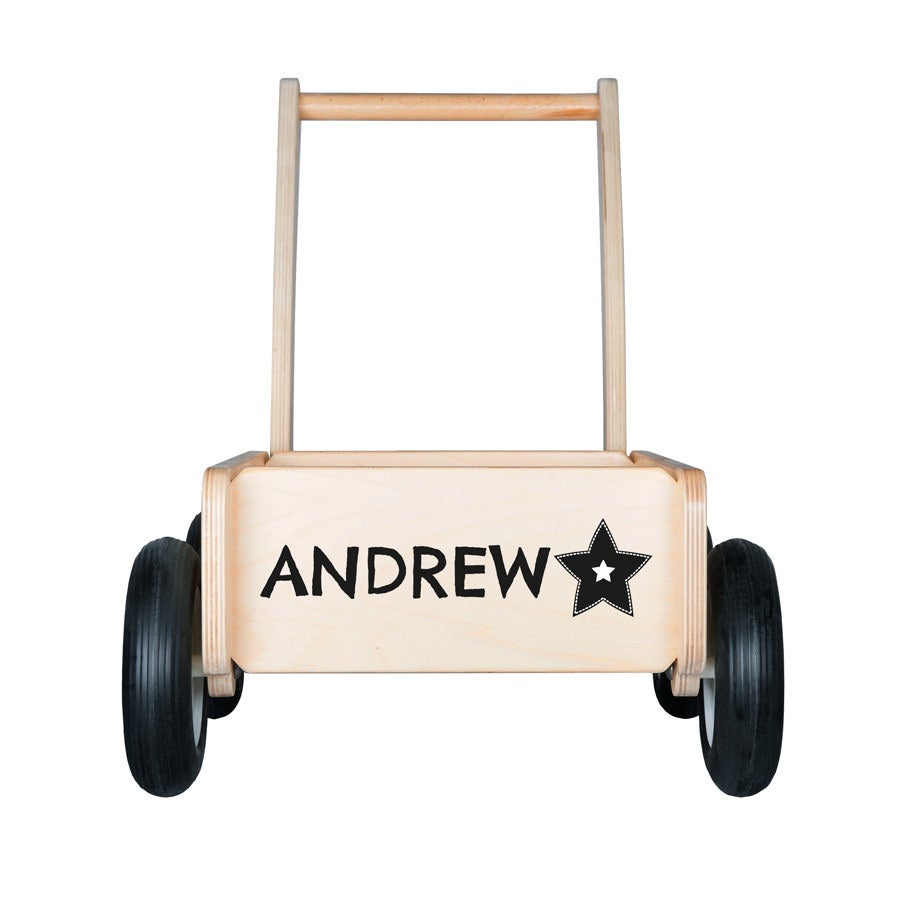 Crea un carrito de empuje de madera único con nombre. Madera de abedul de calidad muy fuerte con pegatinas brillantes. ¡Muchas horas de juego alegre!