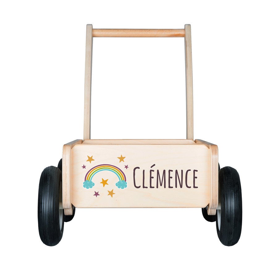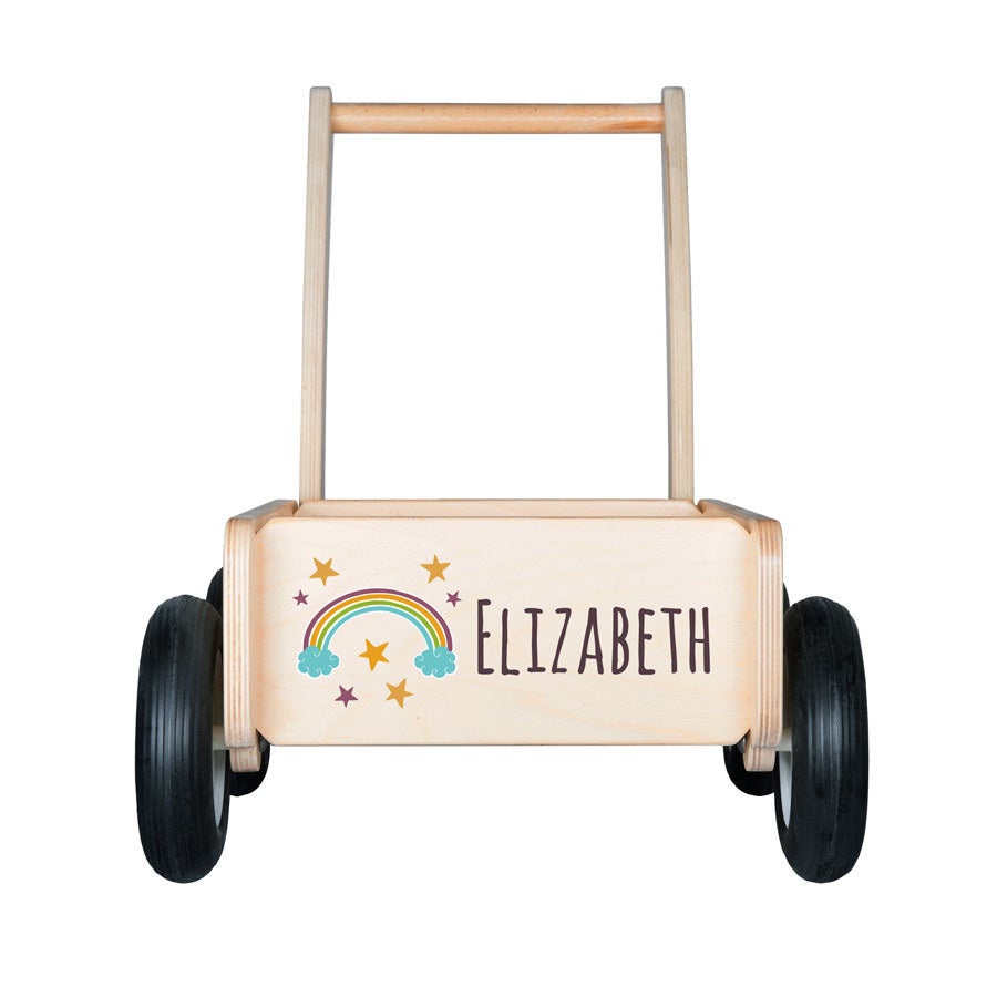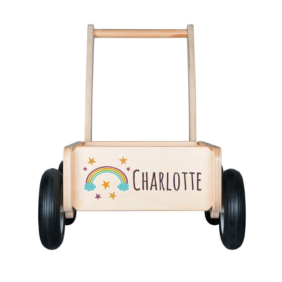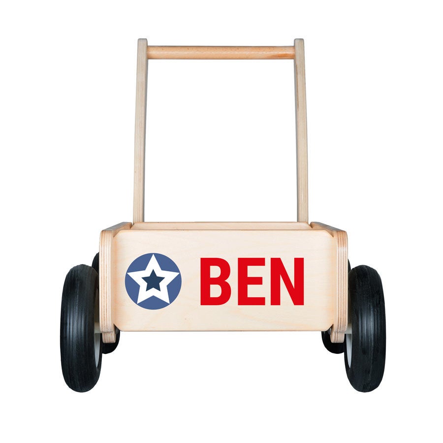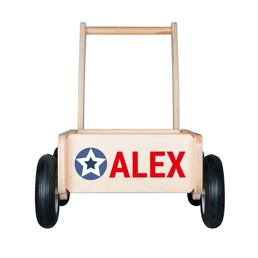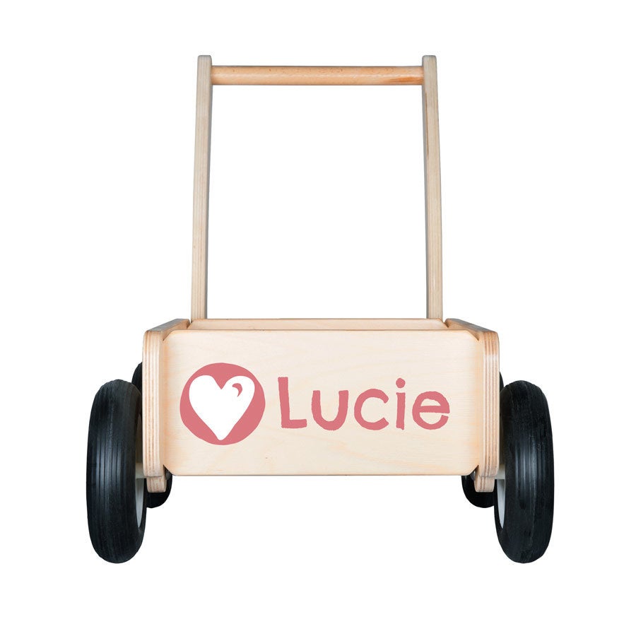 Crea un carrito de empuje de madera único con nombre. Madera de abedul de calidad muy fuerte con pegatinas brillantes. ¡Muchas horas de juego alegre!