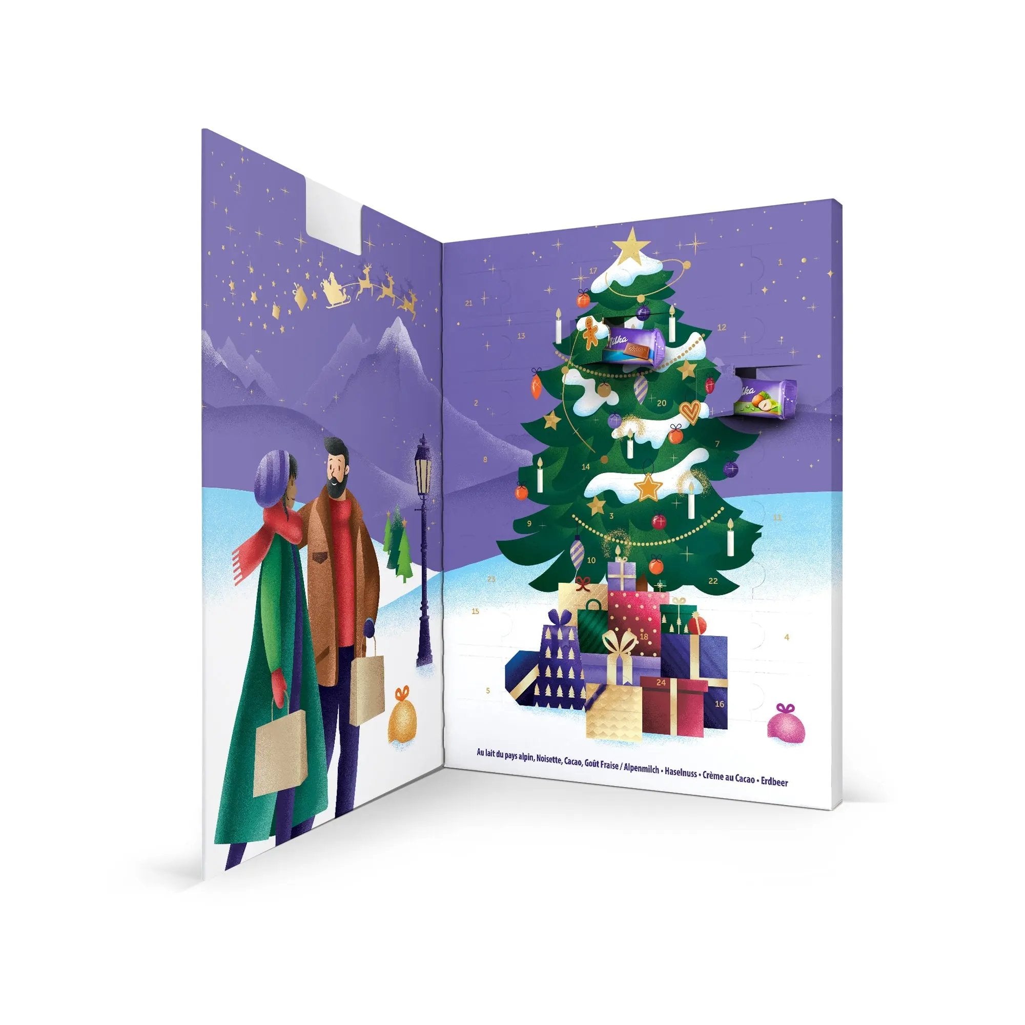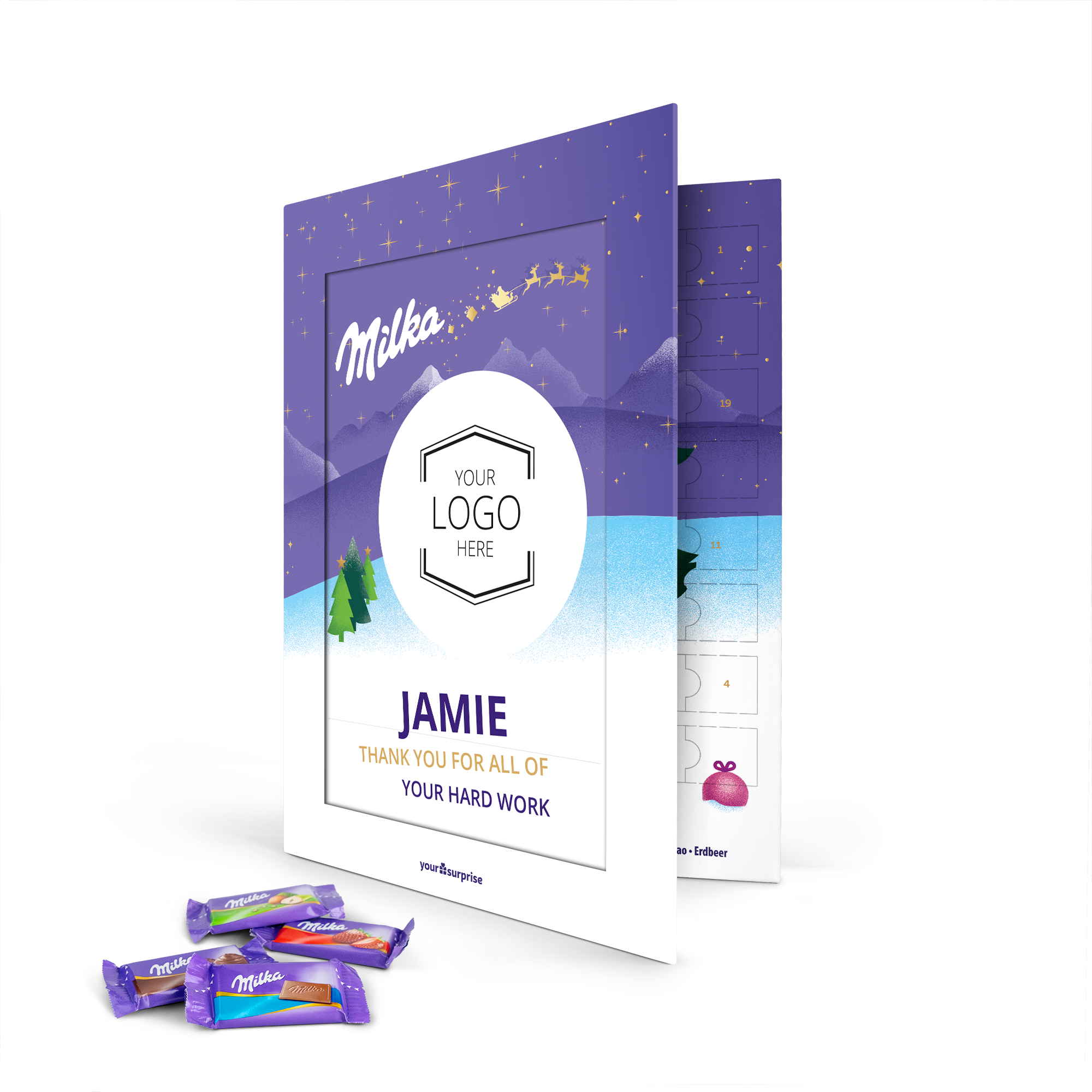 Un calendario de adviento personalizado con chocolates Milka Alpine Milk, ideal para una dulce cuenta atrás hasta la Navidad. Un regalo original y delicioso para disfrutar cada día de diciembre.
