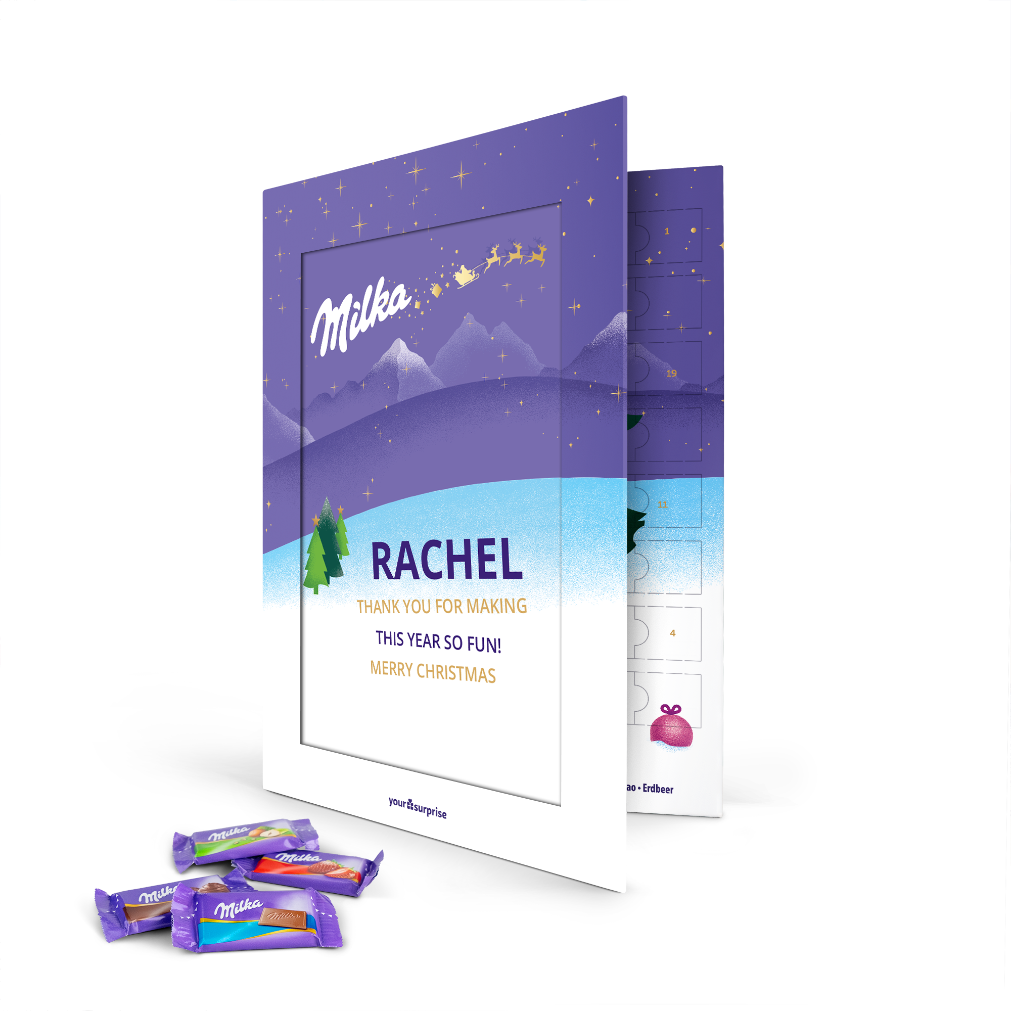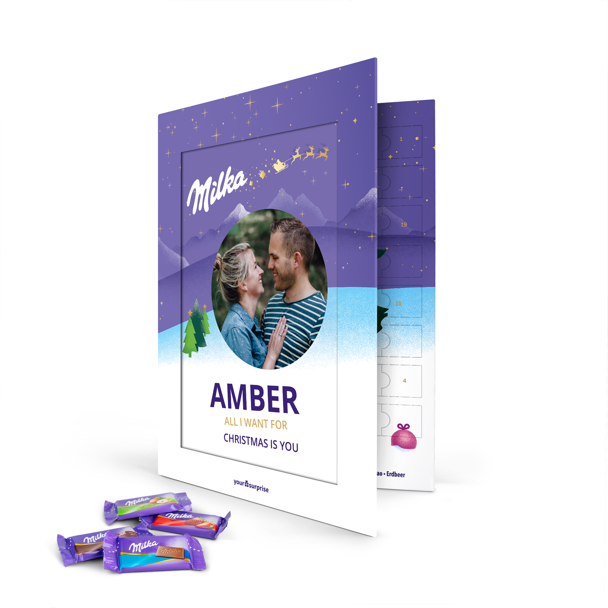 Calendario de adviento Milka con foto, nombre y/o texto. Relleno con 24 deliciosos chocolates Milka. ¡Una deliciosa cuenta atrás para la Navidad!