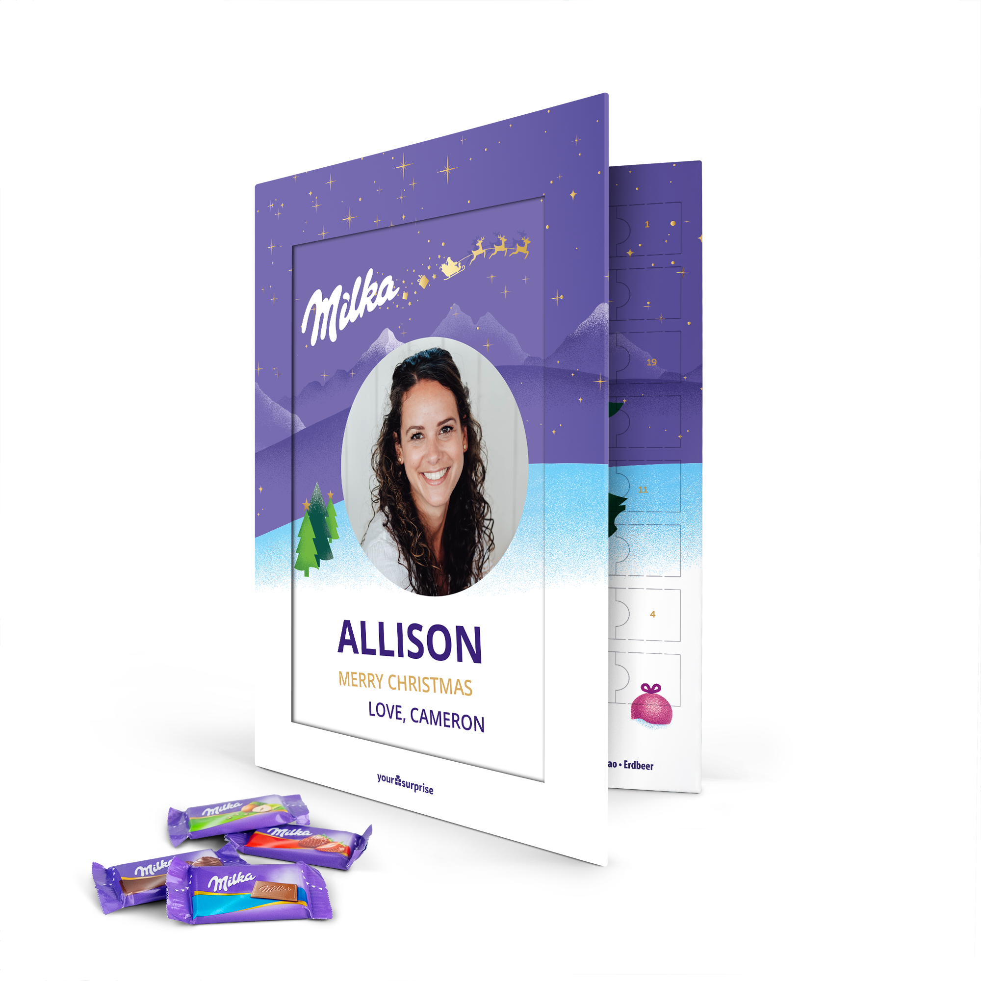 Calendario de adviento Milka con 24 chocolates Milka Alpine Milk. Personalizable con foto, nombre o texto. Perfecto para una dulce cuenta atrás navideña.