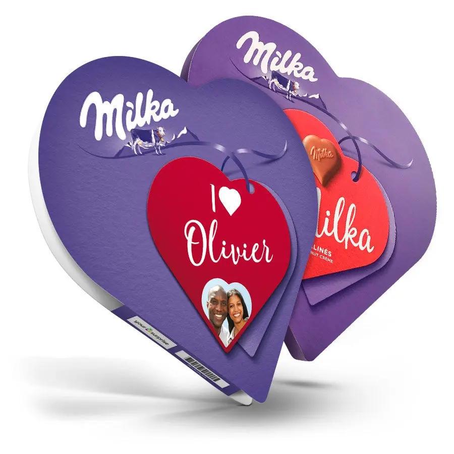 Delicioso corazón Milka con nombre. ¡Incluye 30 pralinas de chocolate con suave relleno de crema de avellana!
