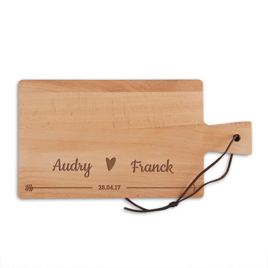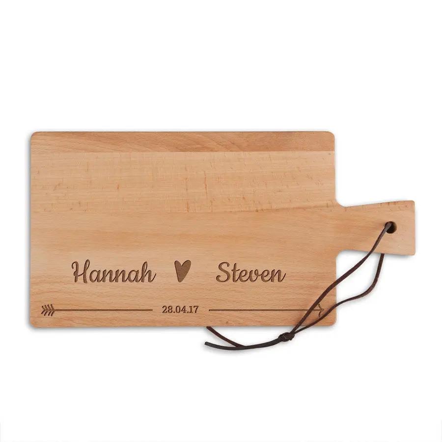 Más información sobre la bandeja de servir de madera:Material: madera de haya maciza de alta calidad Acabado: aceitado e incluye un cordón de cuero Dimensiones: 31,5 x 16 x 1,5 cm Peso: +/- 450 gramos Personalización: grabado de texto Grabado en color: madera Extra: - Hecho con madera certificada por FSC - ¡No apto para lavavajillas! - La madera es un producto natural. Esto significa que tu regalo puede diferir ligeramente de la foto de ejemplo. Lamentablemente, por razones técnicas, no es posible procesar caracteres cirílicos, turcos o especiales.