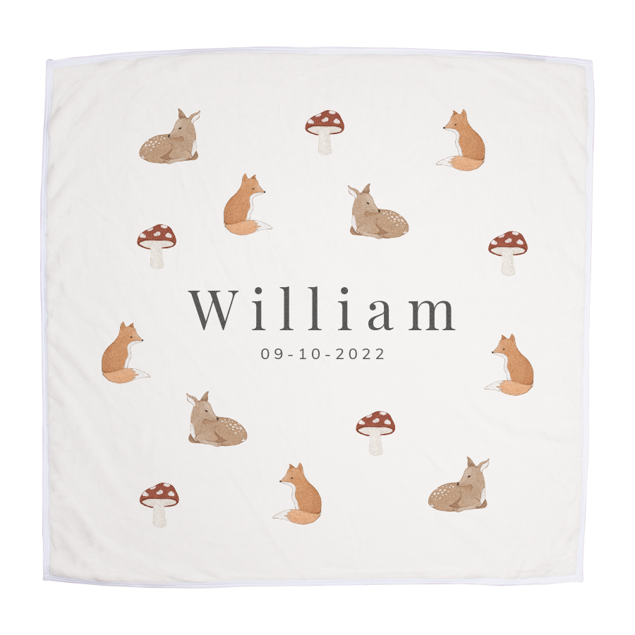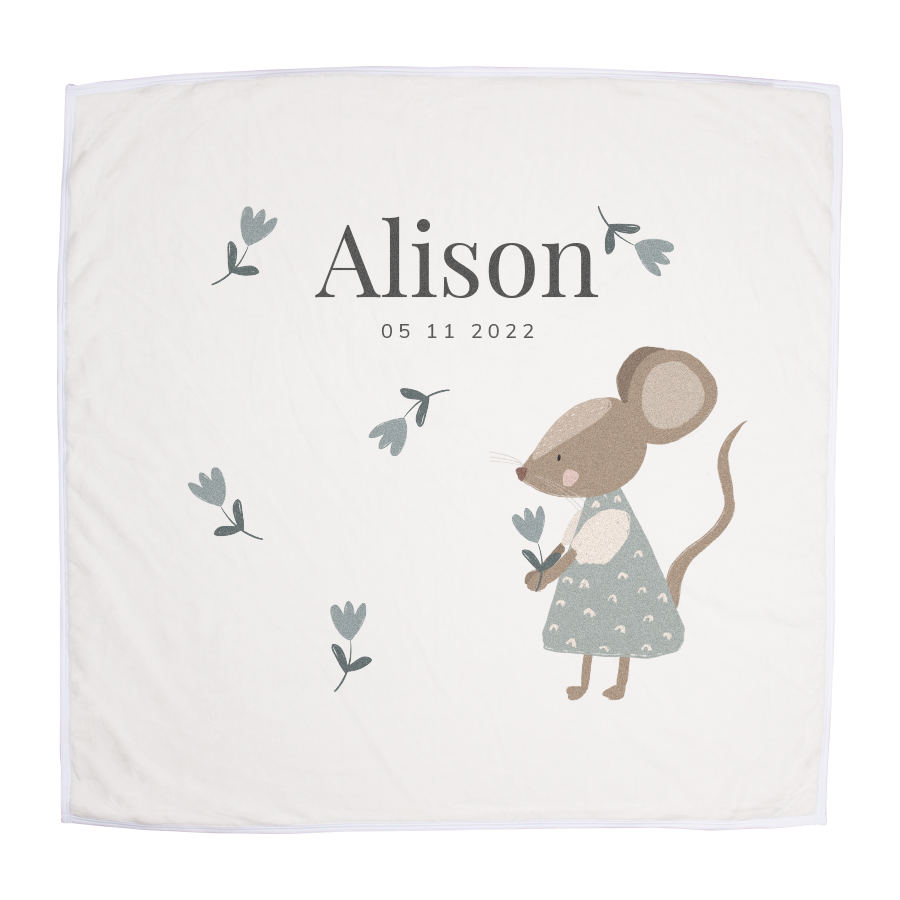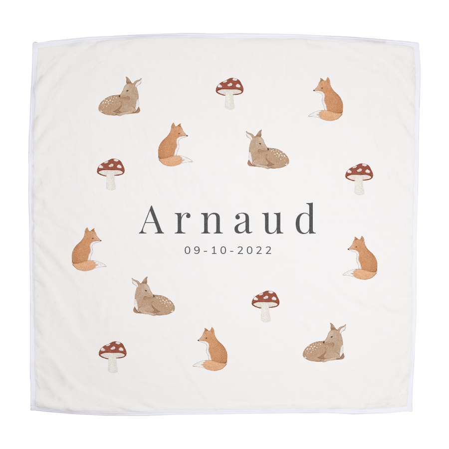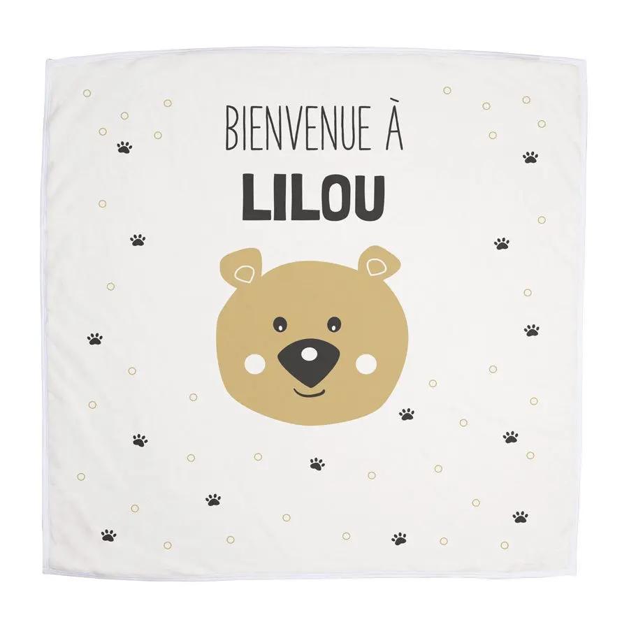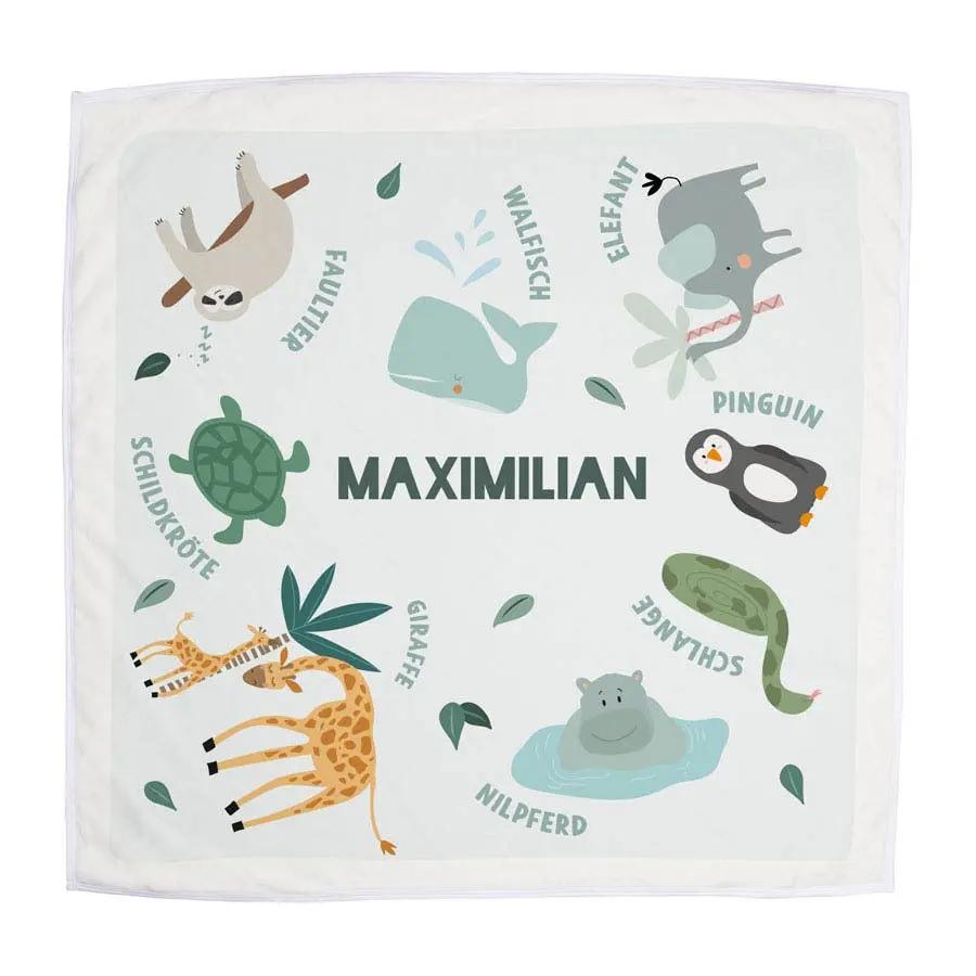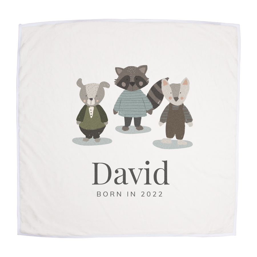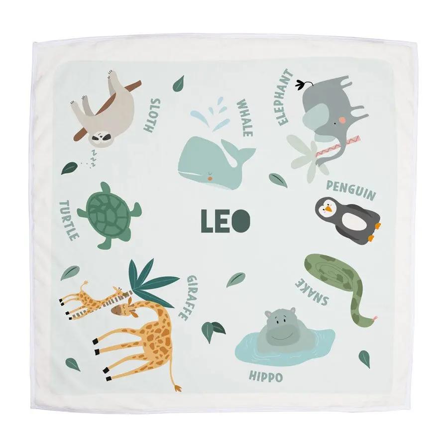 Una manta de poliéster suave y decorada con motivos animales. ¡Perfecta para un bebé feliz! Personalízala con el nombre y la imagen que tú quieras.