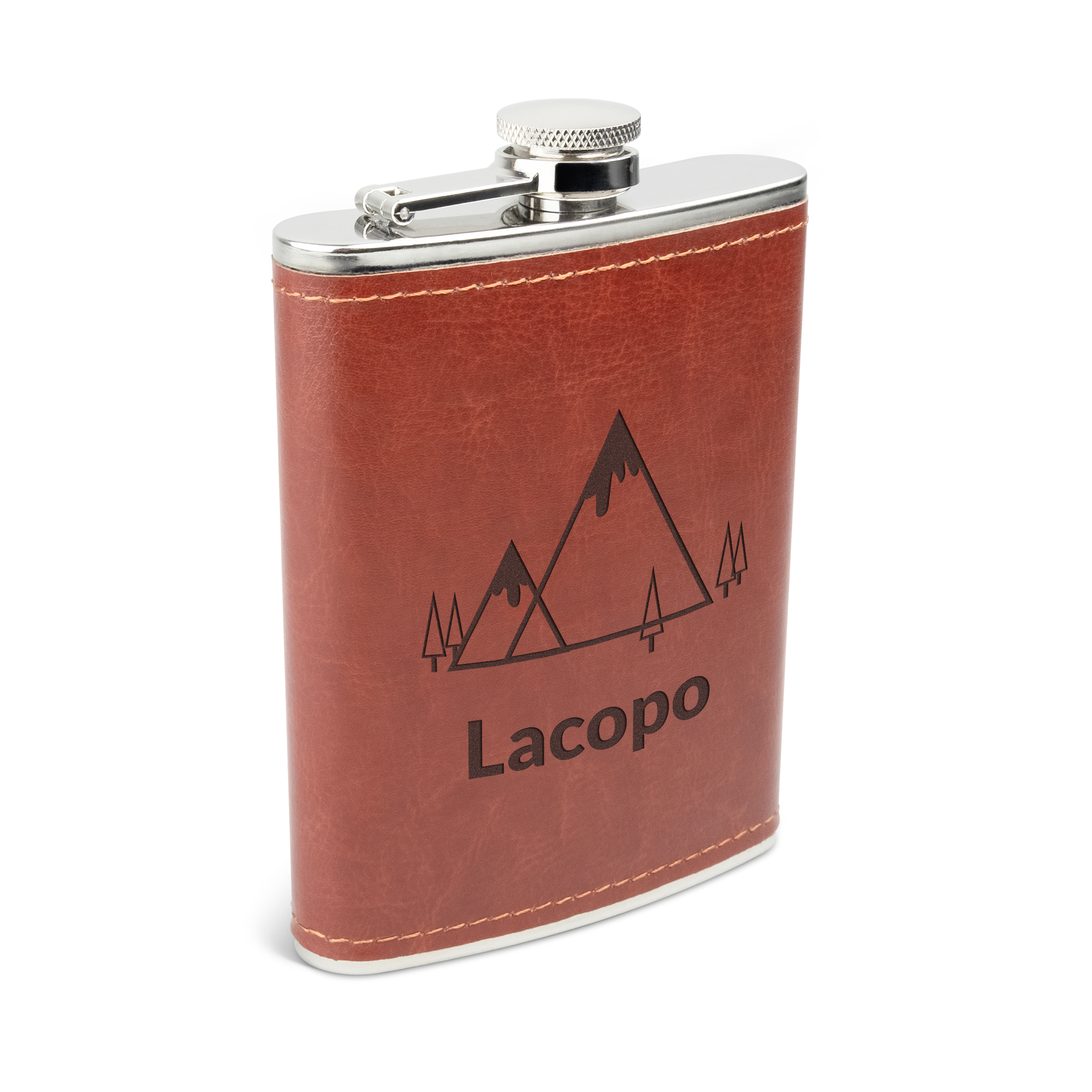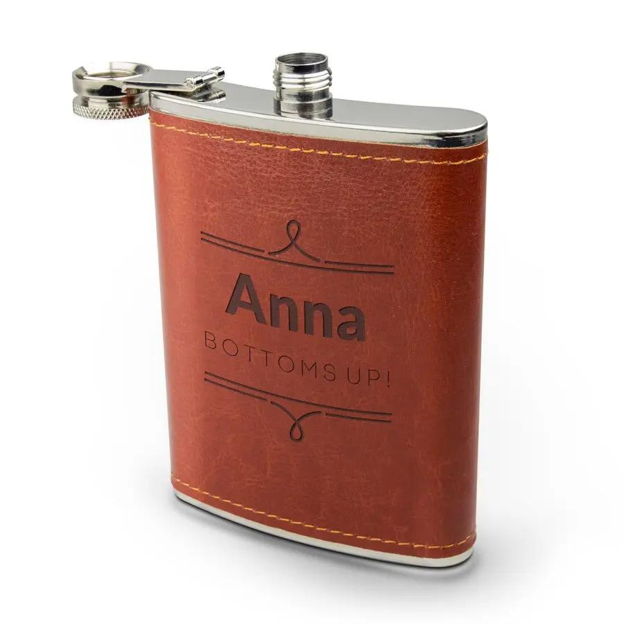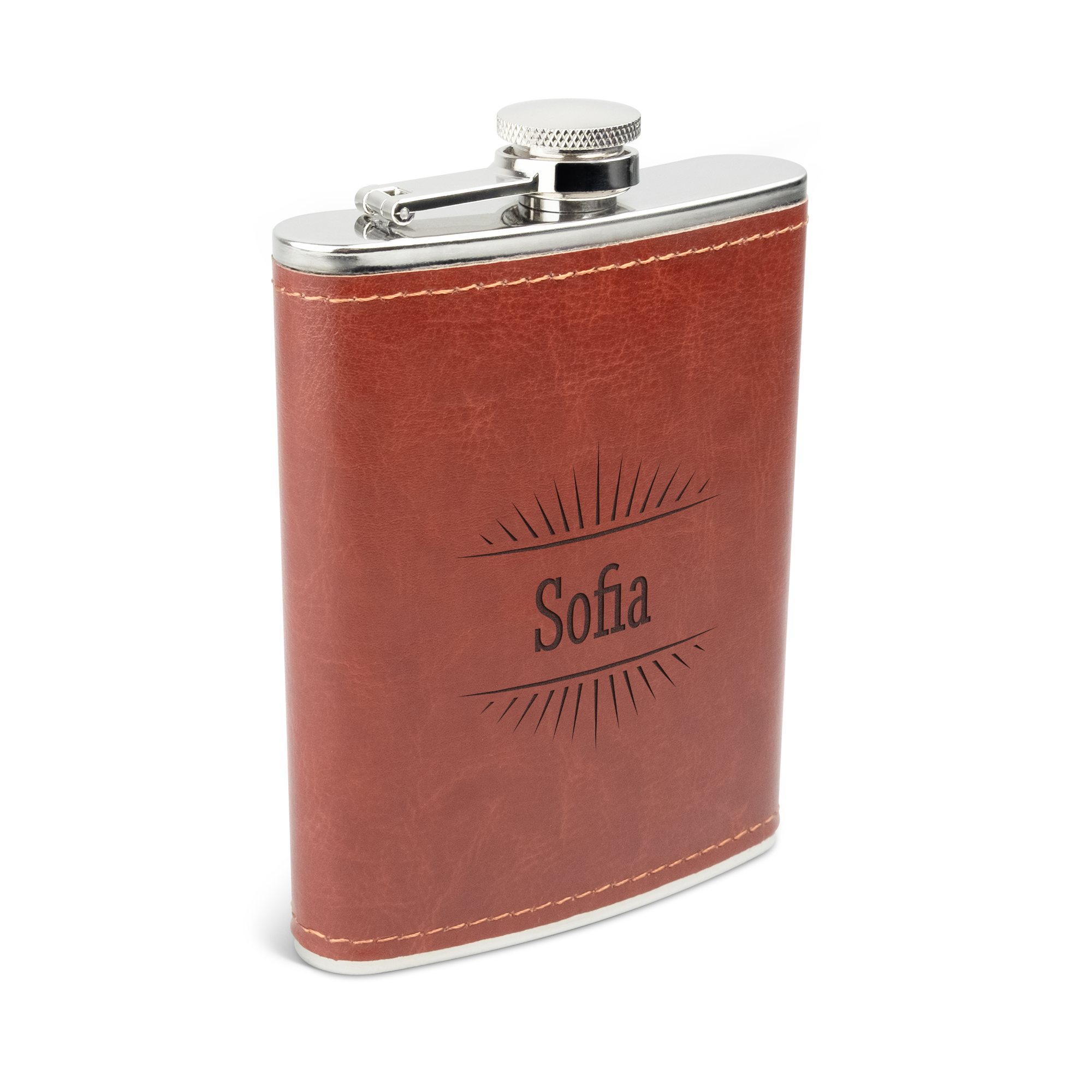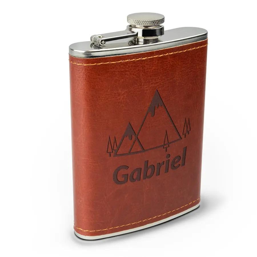 ¿A quién sorprenderás con una petaca personalizada? Un regalo único con un nombre o texto grabado. Acero inoxidable con un elegante estuche de cuero. ¡Salud!