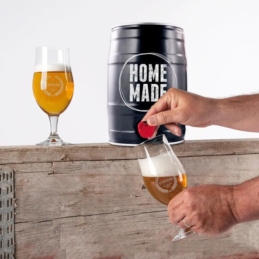 Más información sobre los vasos de cerveza: Cantidad: 2 uds Marca: Royal Leerdam Diámetro: 9,5 cm Altura: 20 cm Volumen: 49 cl Personalización: Con un nombre y/o texto Lugar de personalización: en un lado del vaso Grabado: imagen grabada con láser de alta calidad Extra: puedes grabar cada uno de los vasos de cerveza Más información sobre el barril de elaboración Tipo de cerveza: Lager Material: aluminio Dimensiones: 26,5 x 18 x 25,3 cm Alcohol%: 5-6,5% Contenido del barril de elaboración: El barril de elaboración viene con un manual práctico Ingredientes: 1 bolsa de extracto de malta de cebada -650g-, (malta de cebada, agua, ácido láctico acidificante), 1 botella de aroma de lúpulo -9ml-, 1 sobre de levadura seca de cervecero (levadura seca, emulsionante sorbitán monostearato)