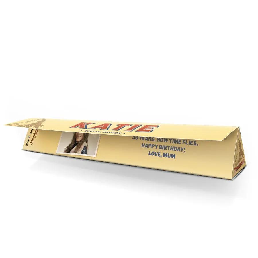 Sorprende con una barra personalizada de Toblerone. Diseño clásico de Toblerone con un toque personal.