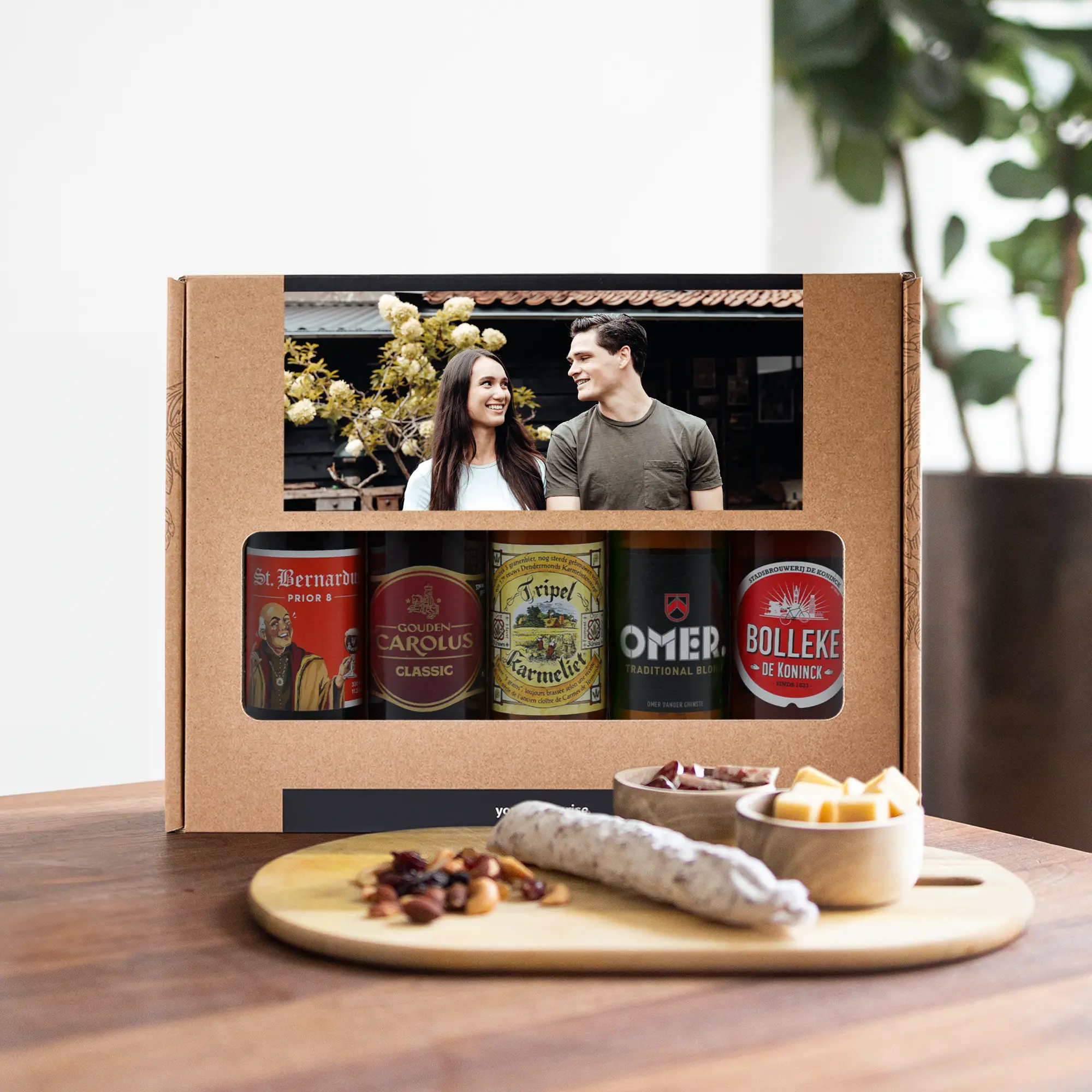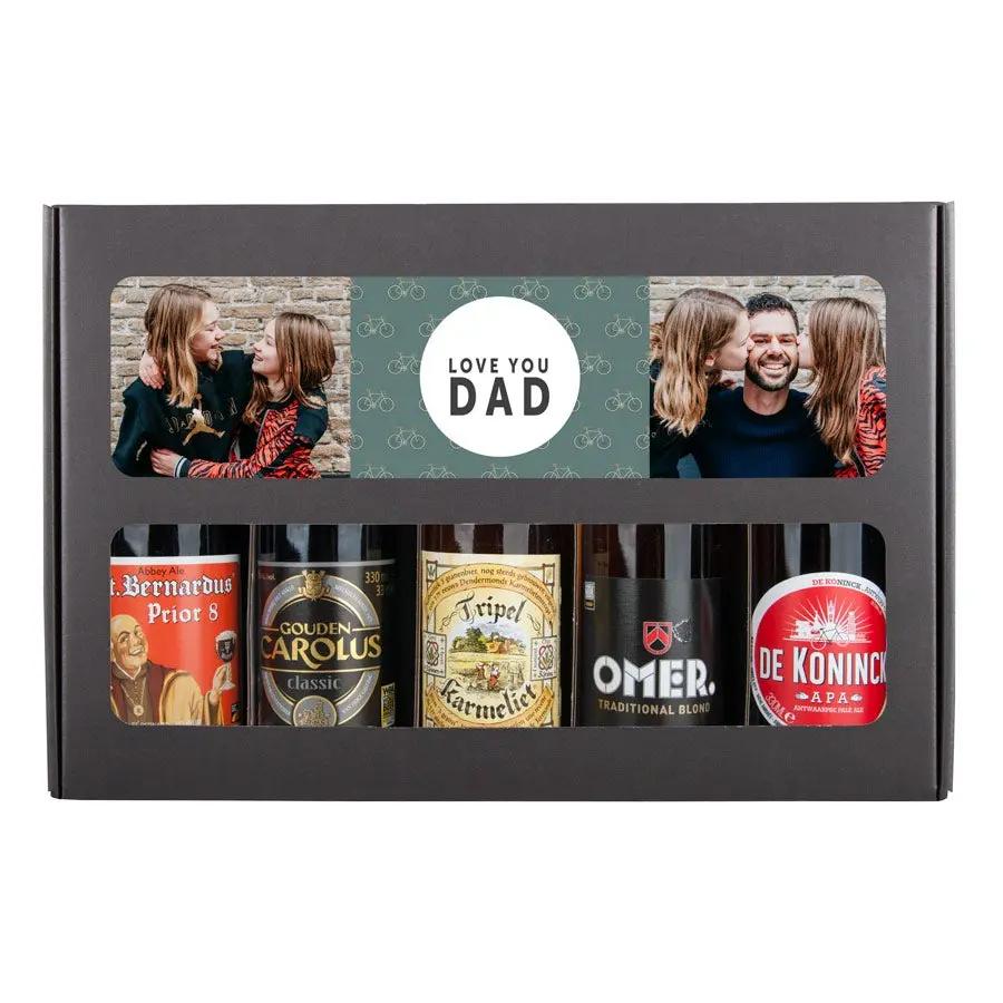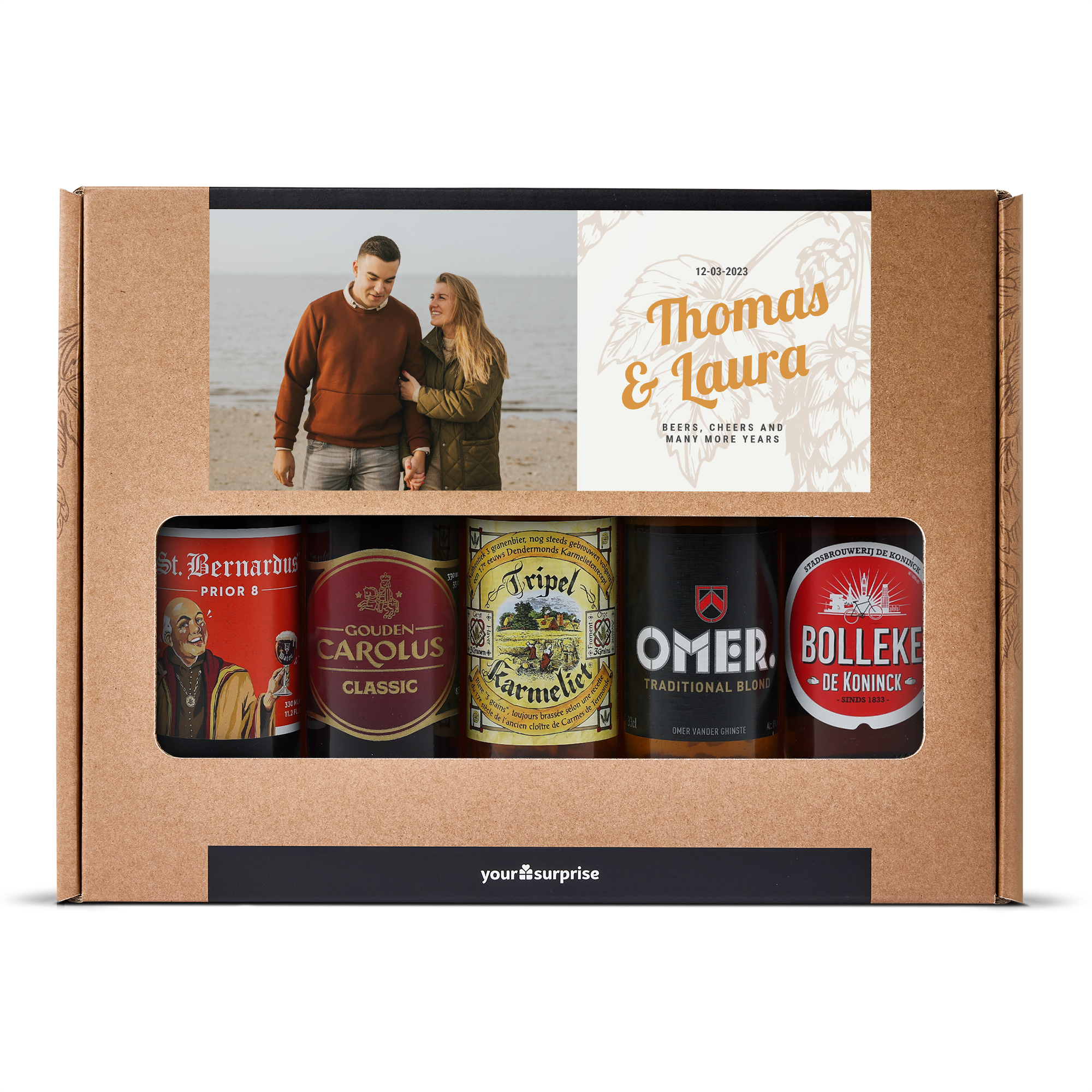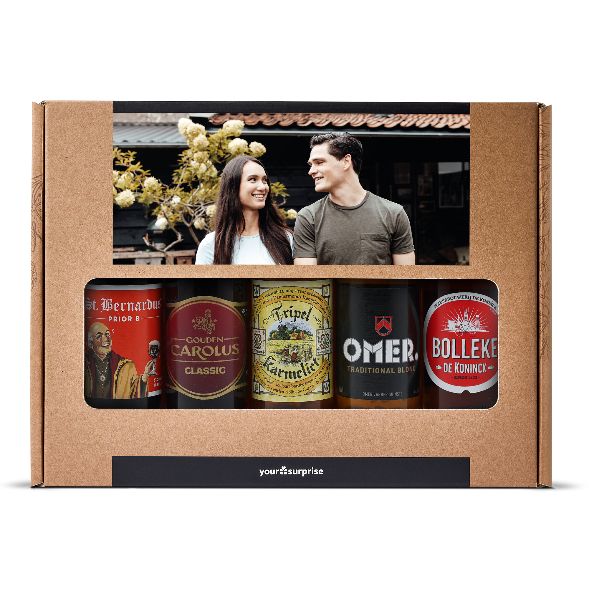 Un delicioso regalo de cerveza con su propia foto y texto, lleno de 5 cervezas belgas diferentes. Con un diseño personalizado!