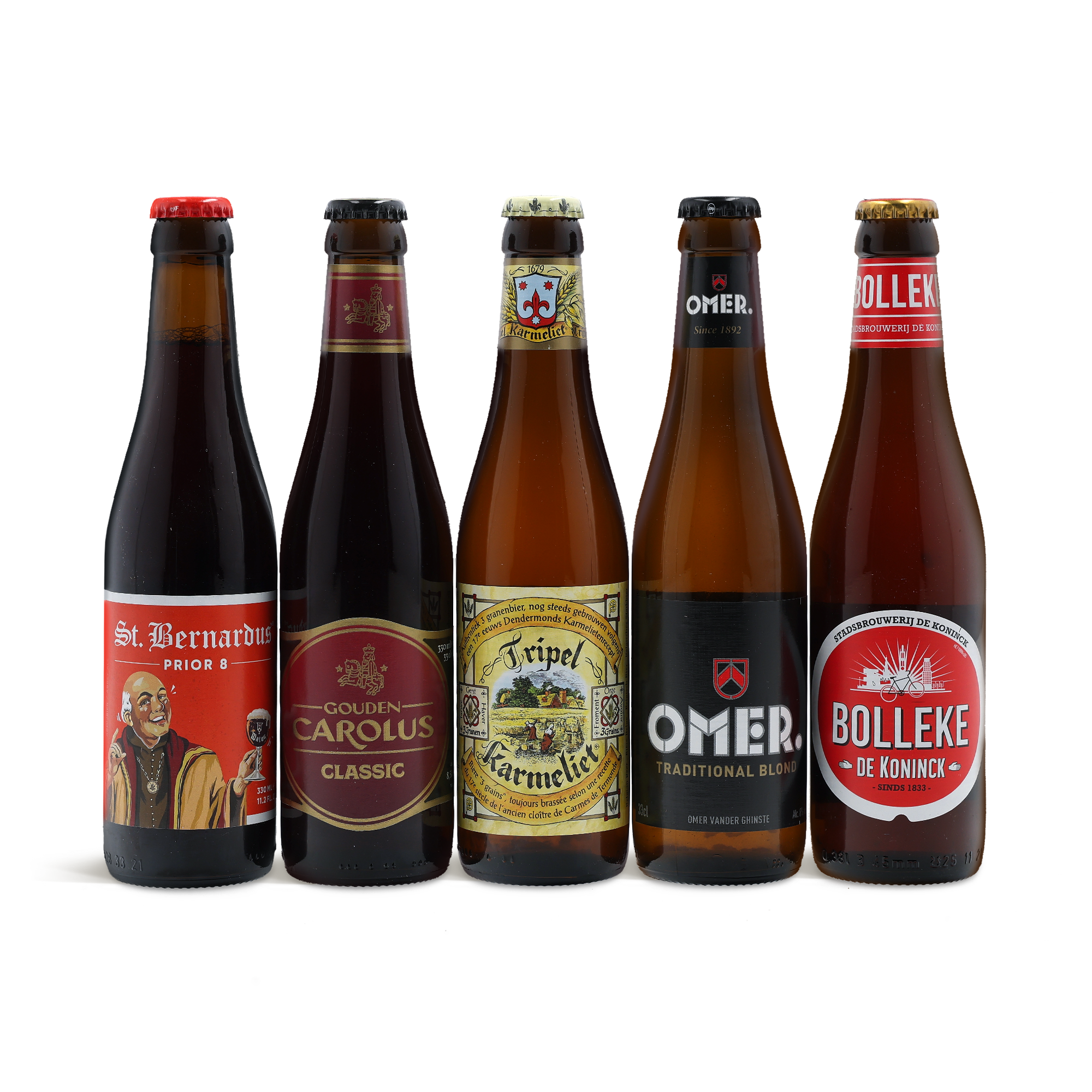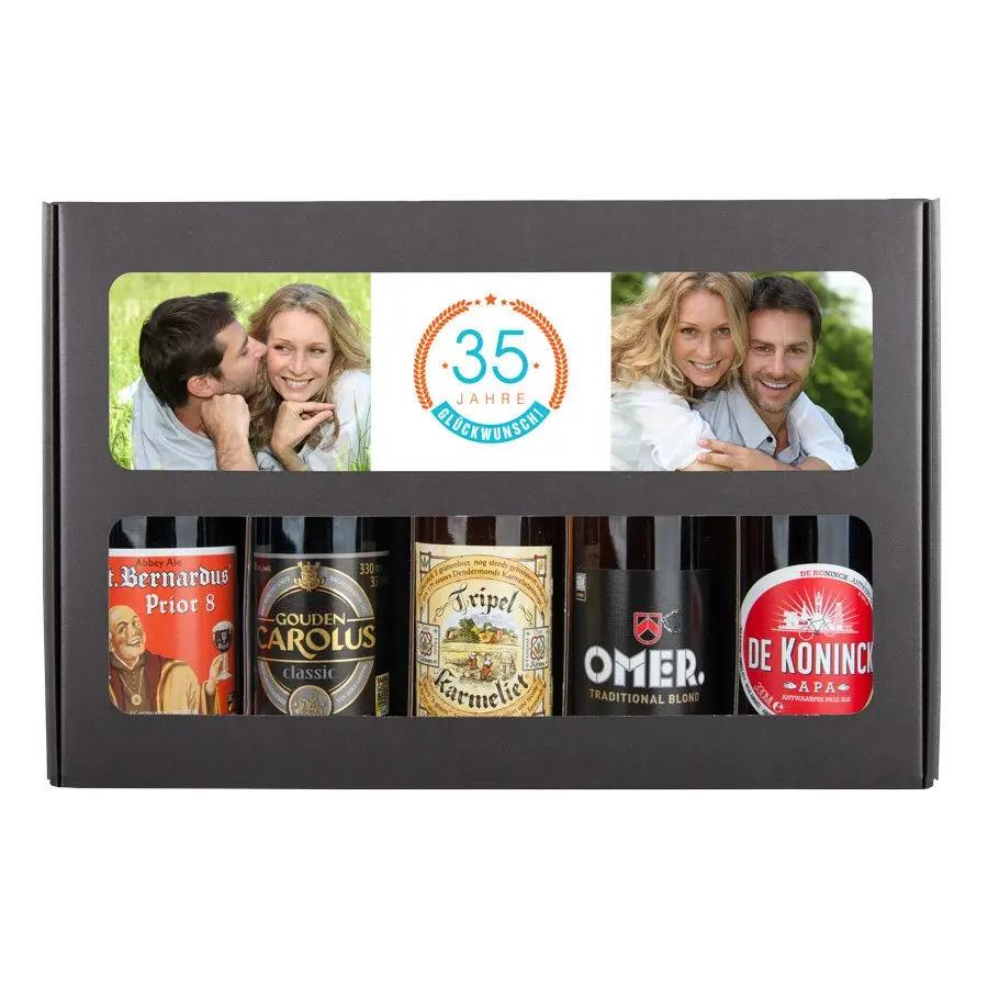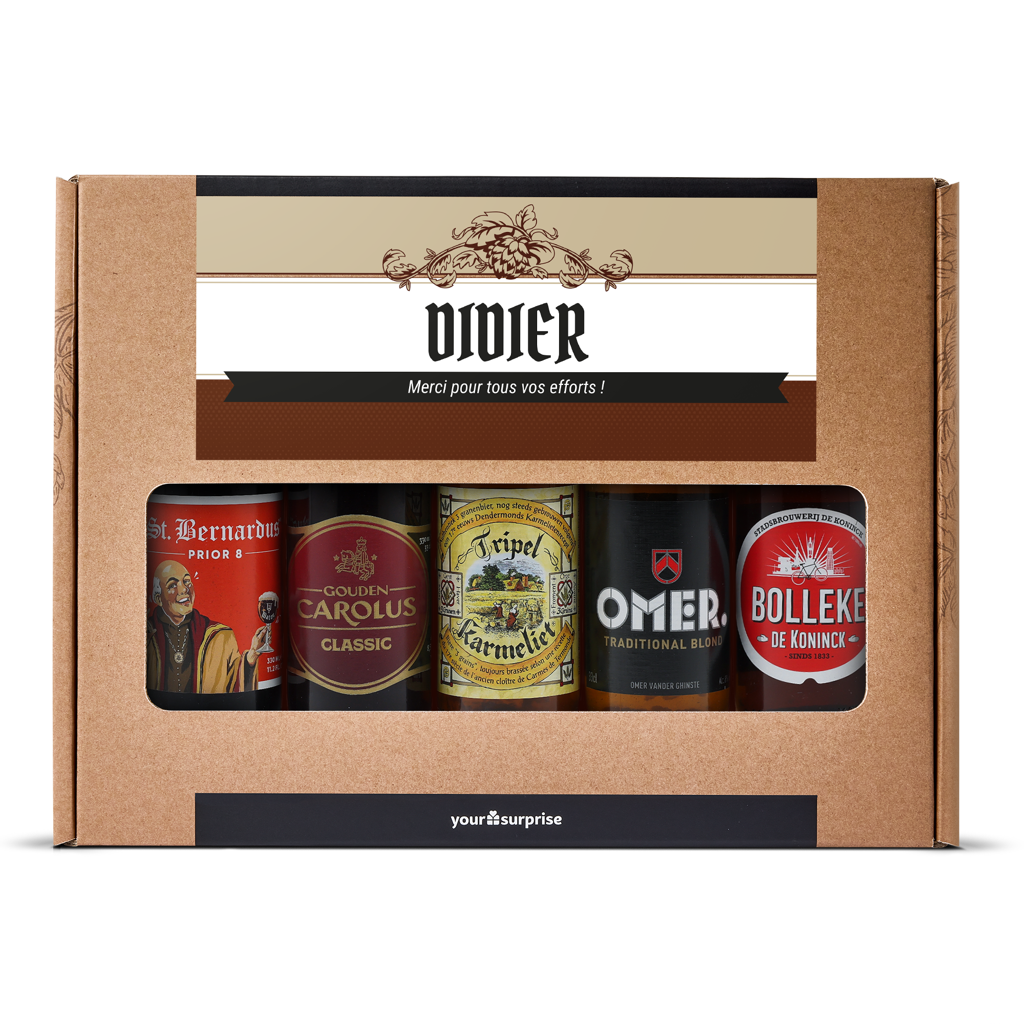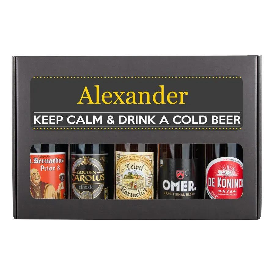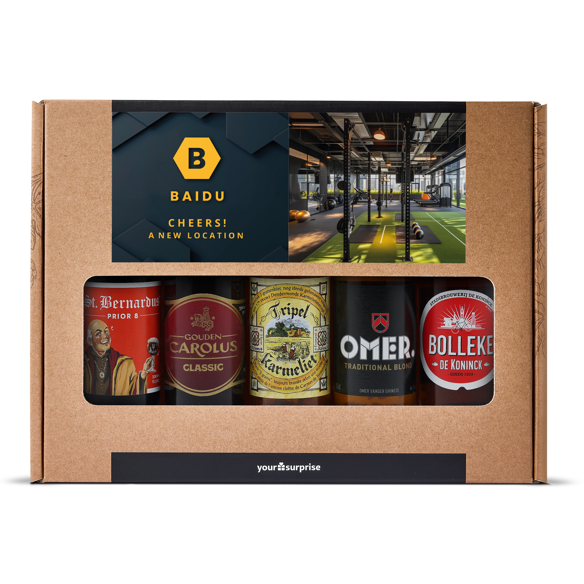 Un delicioso regalo de cerveza con su propia foto y texto, lleno de 5 cervezas belgas diferentes. Con un diseño personalizado!