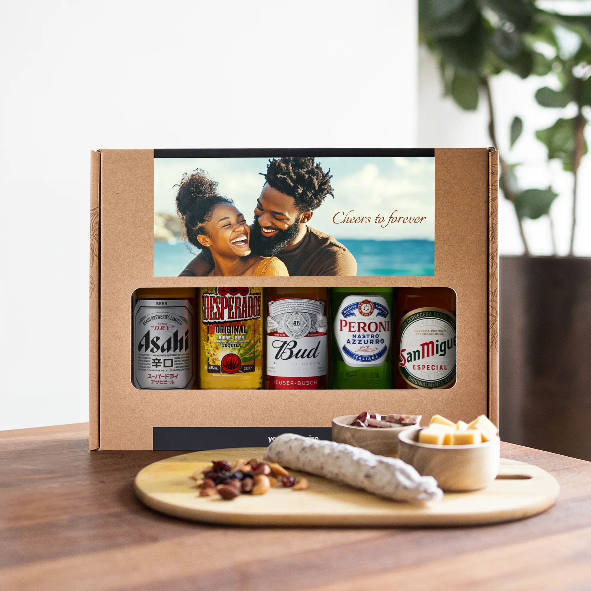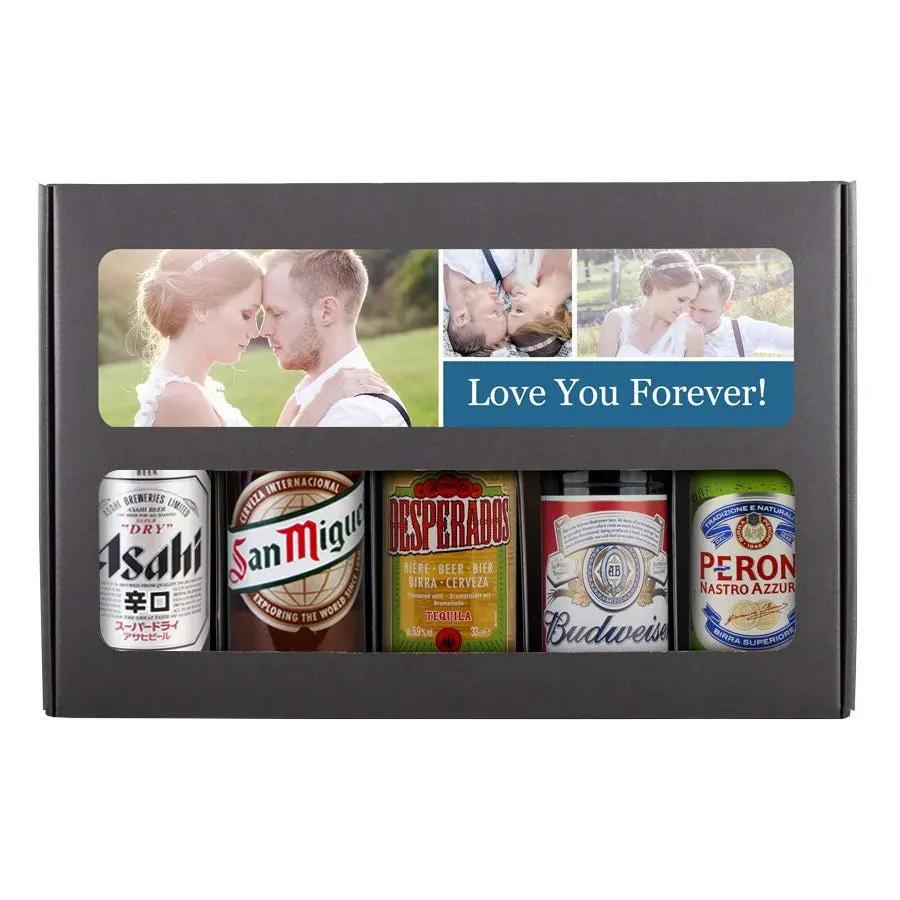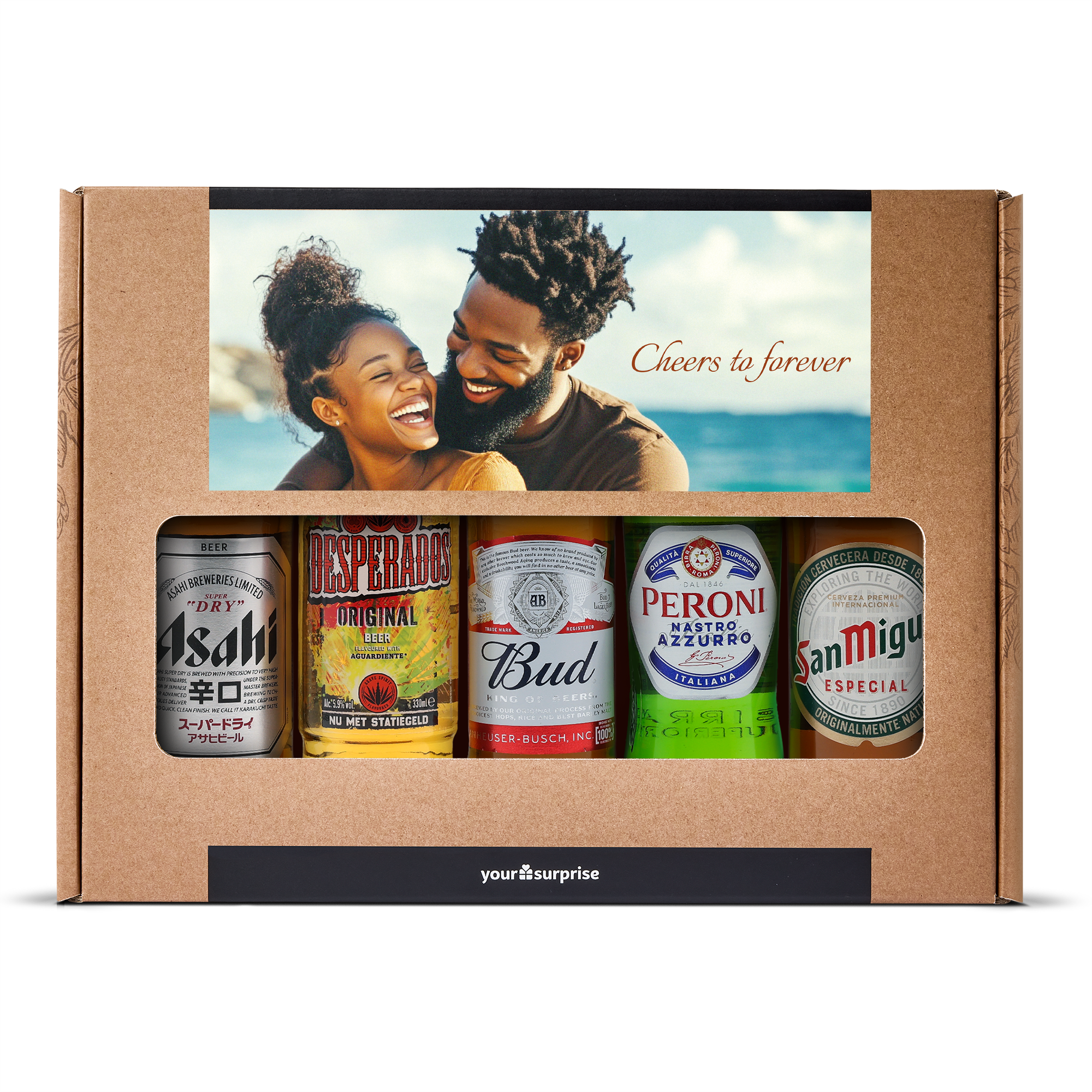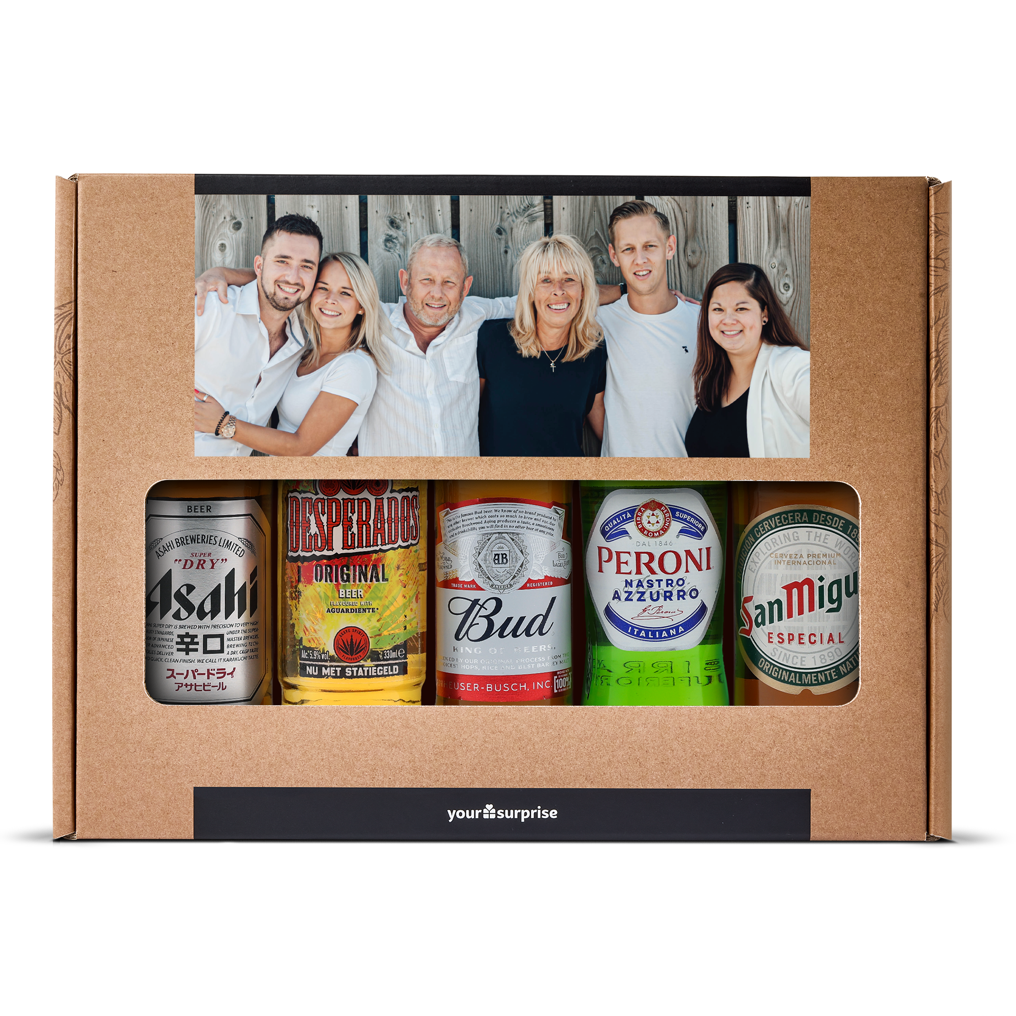 Un delicioso regalo de cerveza con tu propia foto y texto, lleno de 5 cervezas internacionales diferentes. ¡Con un diseño personalizado!
