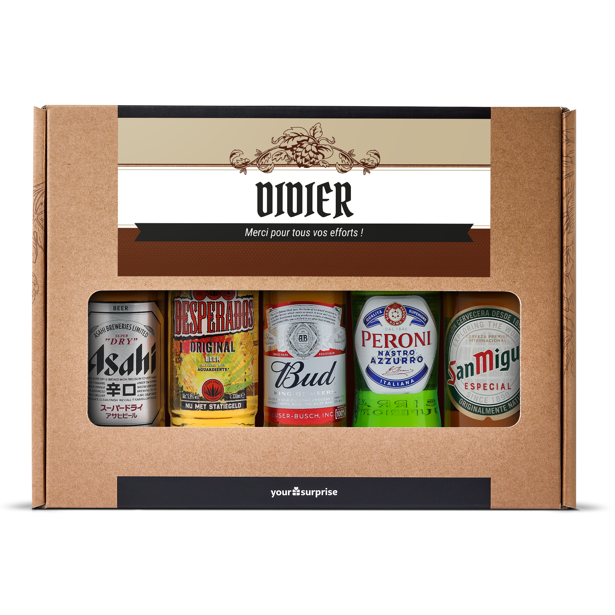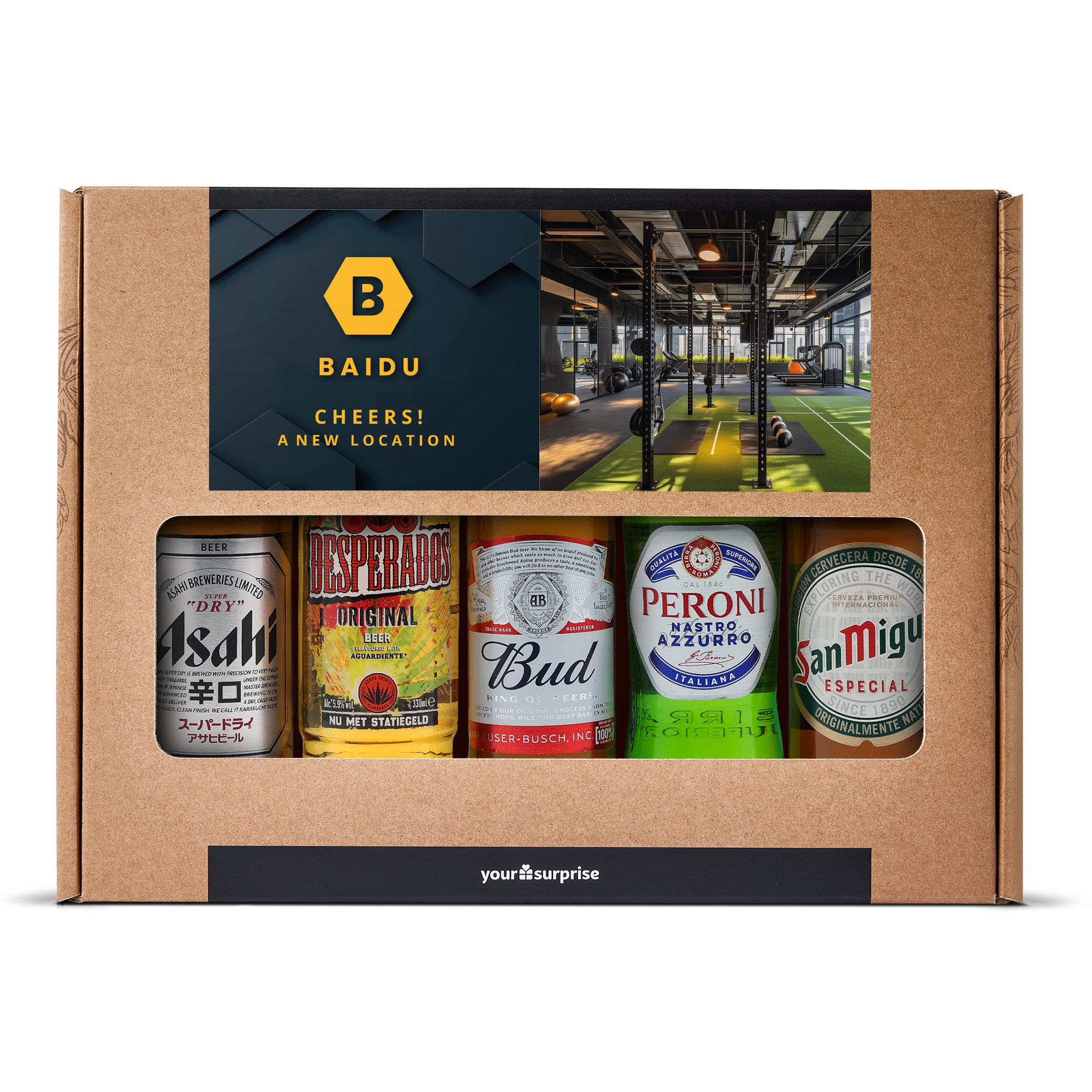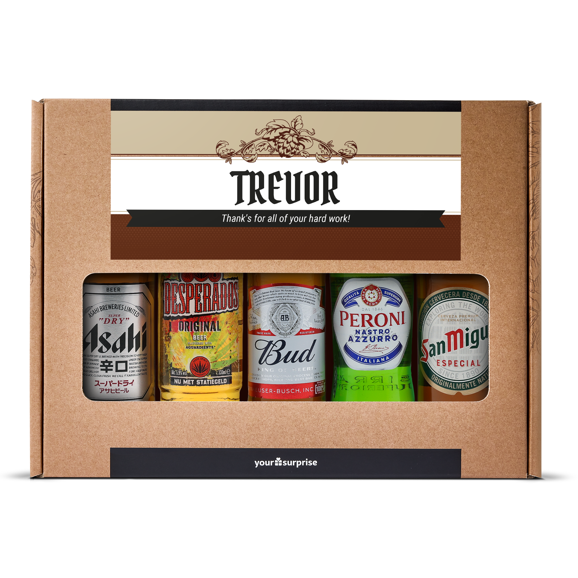 Un delicioso regalo de cerveza con tu propia foto y texto, lleno de 5 cervezas internacionales diferentes. ¡Con un diseño personalizado!