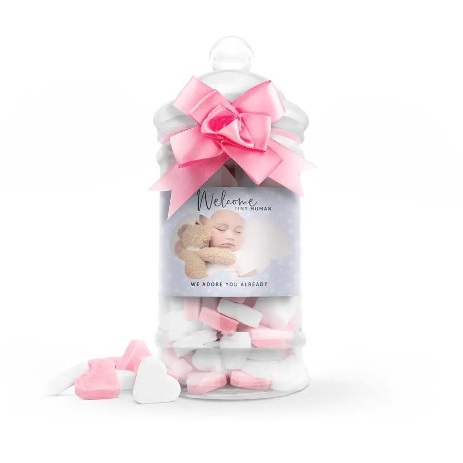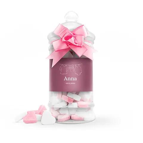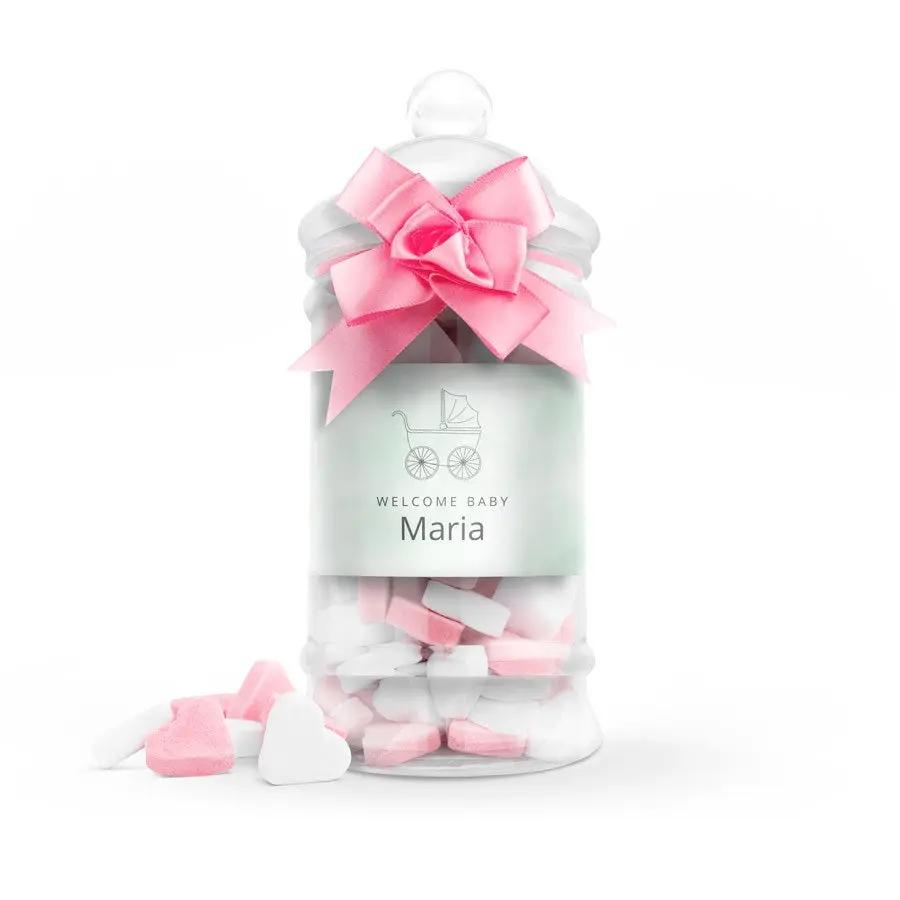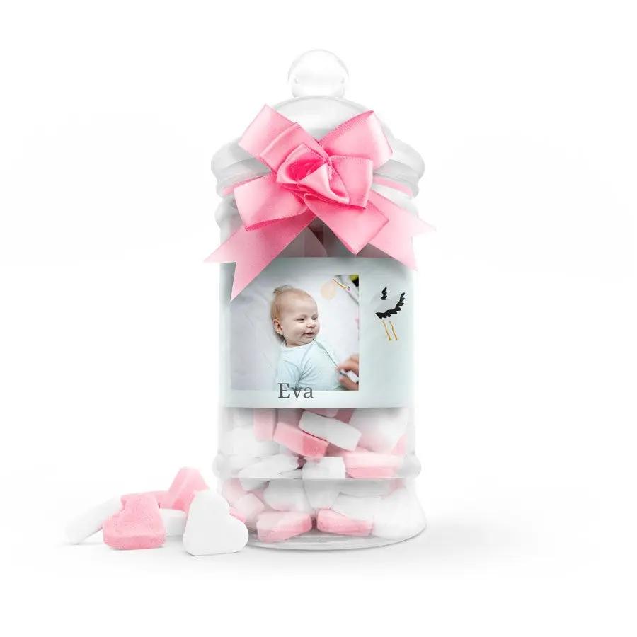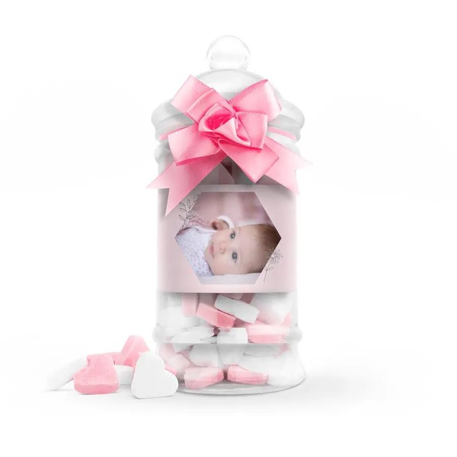 ¿Quieres celebrar un nacimiento por todo lo alto? Envía un detalle especial con esta botella de bebé en forma de biberón con chucherías de corazón. Un regalo personalizable con el nombre, fecha de nacimiento y/o foto del bebé.