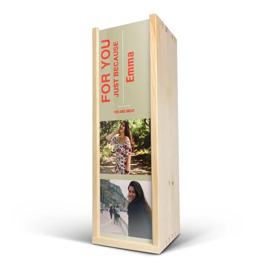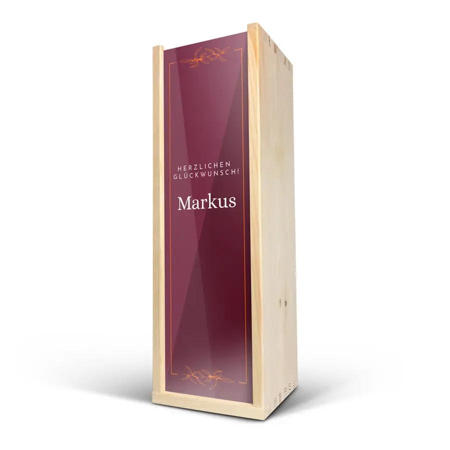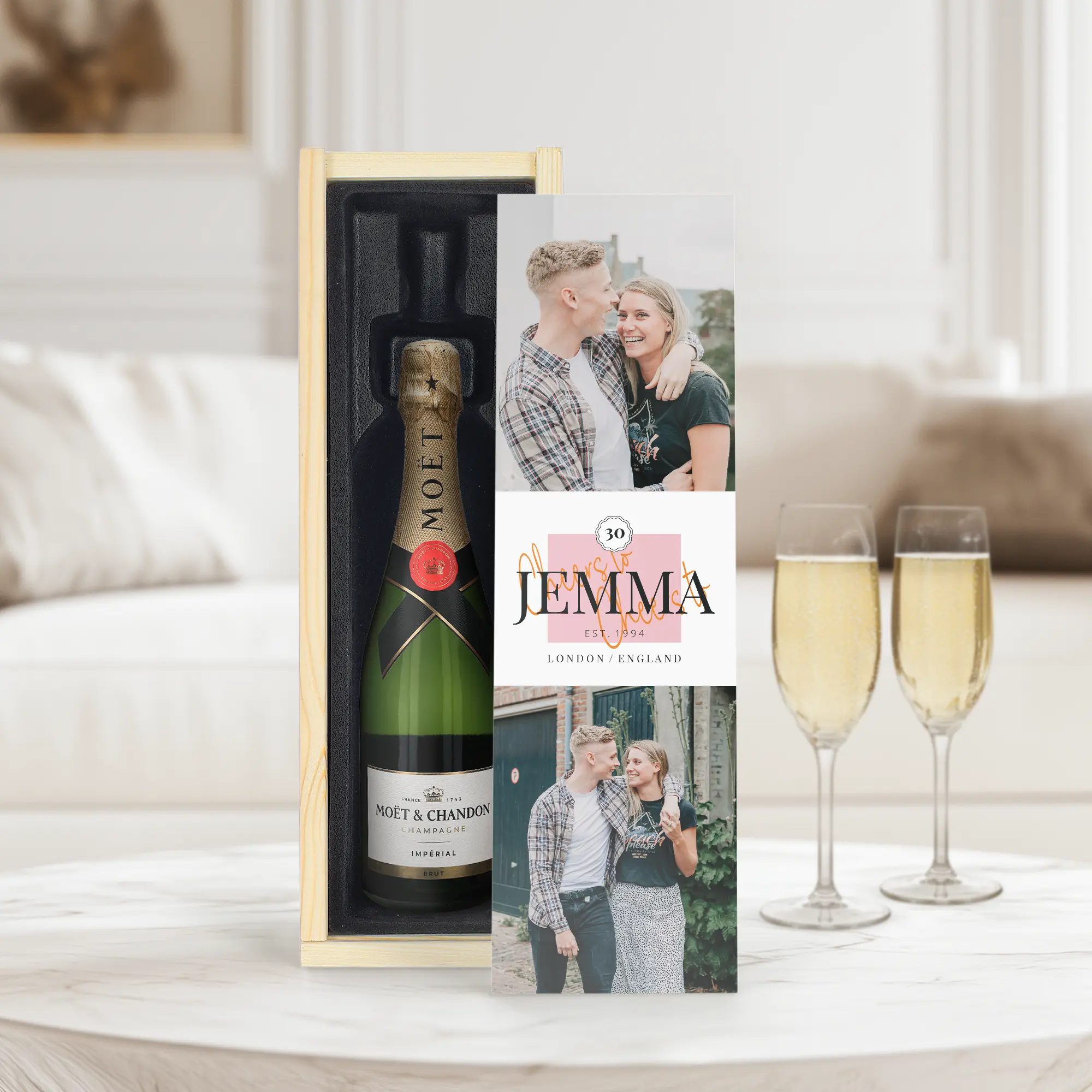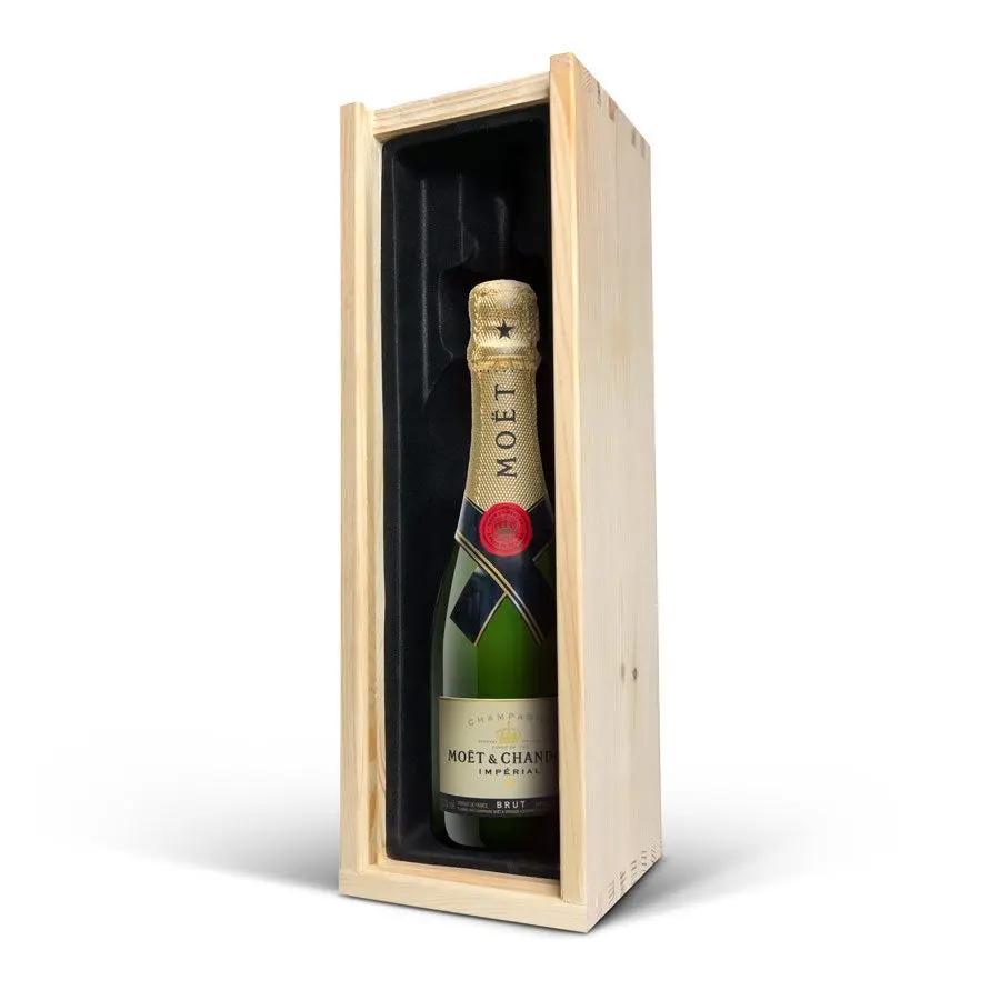 Una deliciosa botella de champán Moët & Chandon, verdaderamente personalizada en una lujosa caja grabada con tu nombre o texto favorito. Grabado con precisión.