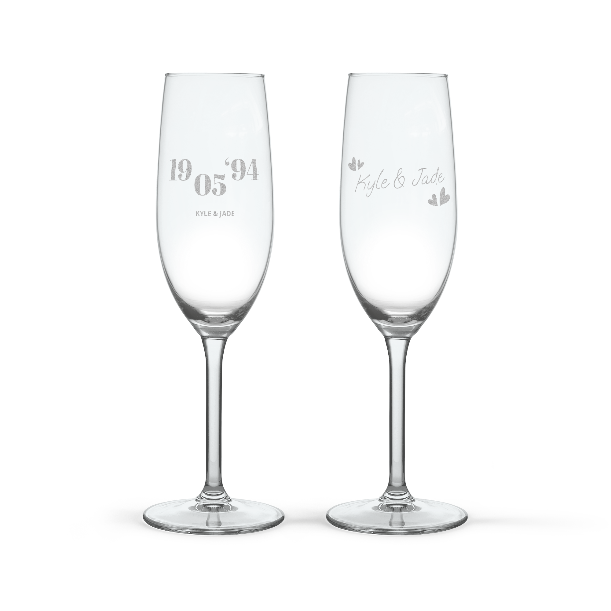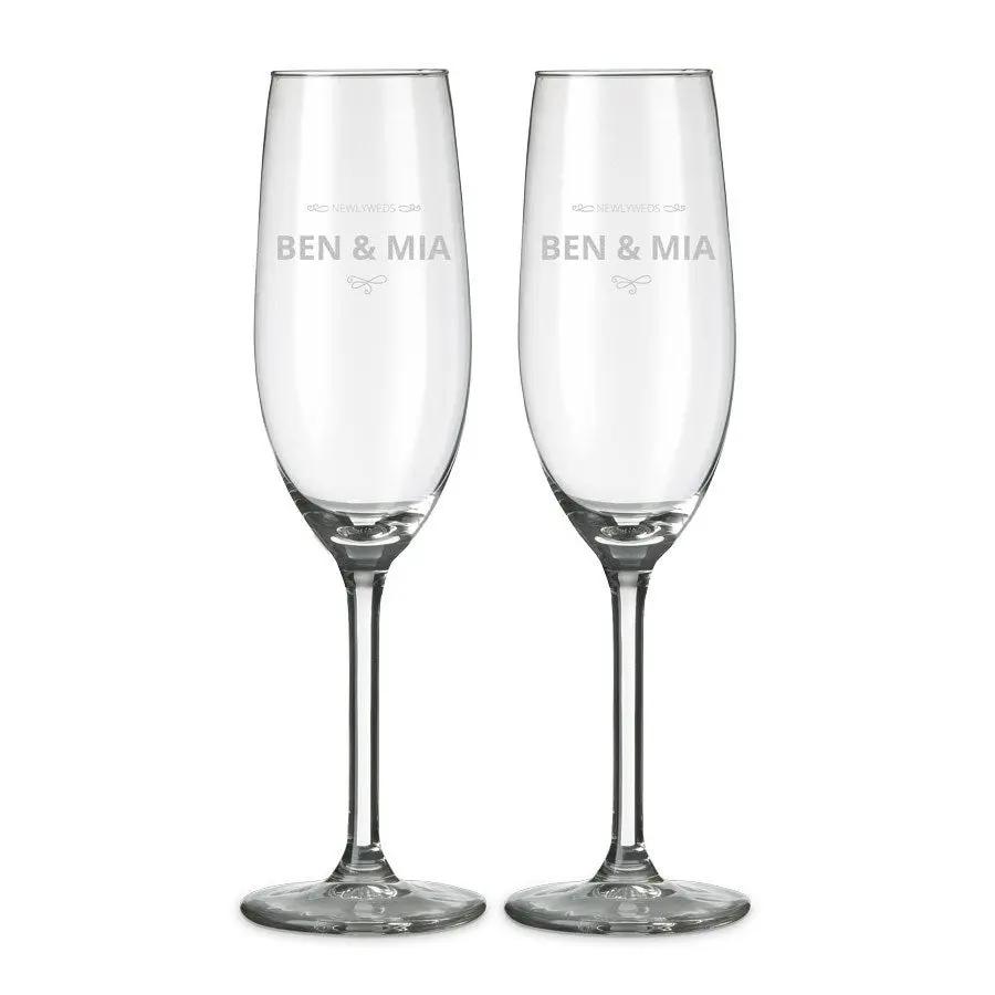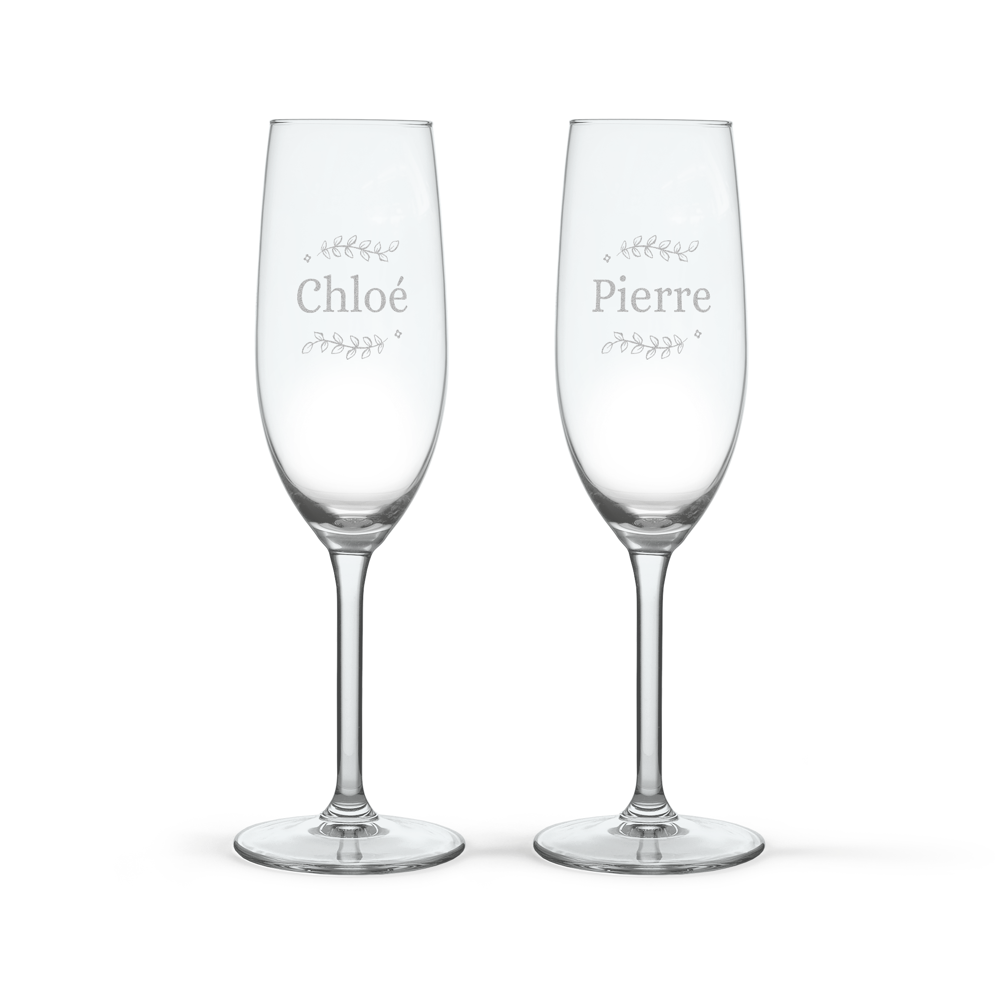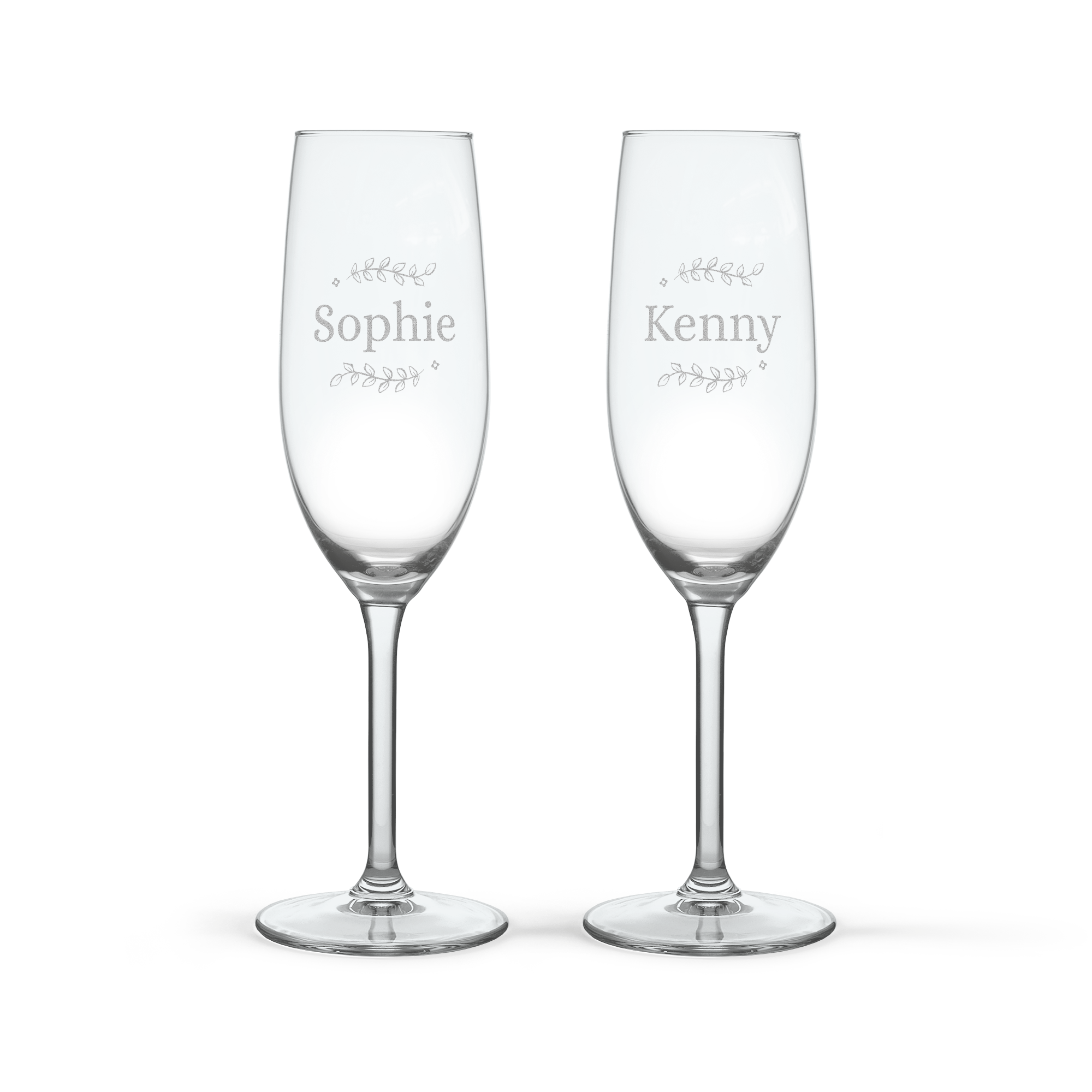 Hermosas copas de champán grabadas con texto o nombre. El regalo perfecto para celebrar cualquier ocasión.