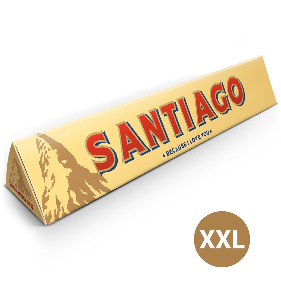 Más información sobre la personalización de la barra Toblerone:Chocolate: leche y chocolate, miel, almendras y turrón.Peso: 4.5 kilosMedidas: 80 x 10,8 x 10,8 cmPersonalización: con nombreImpresión: nítida y a todo colorPor razones técnicas no es posible la impresión de caracteres cirílicos, turcos, asiáticos, arábigos o griegos.Nuestros Toblerones se elaboran con chocolate suizo.